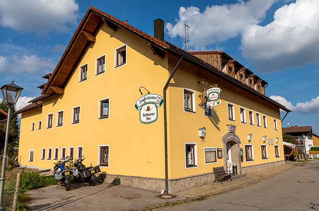 Zaterdag 27 augustus. Kwart over acht (ja, écht waar) zaten we al op de motoren en vonden in Marktheidenfeld een Konditorei, die een heerlijke cappuccino én belegd broodje voor ons had. Precies om 9.00u verlieten we, na ook nog eens getankt te hebben, Marktheidenfeld in de richting Oostenrijkse grens. Ook vandaag geen enkele Autobahnkilometer, maar alleen maar landstrassen. De voorspellingen voor vandaag waren ook niet heel goed, maar het bleef maar droog én warm. Tja, dat ging goed tot Regensburg (what's in the name...) waar we verrast werden door een enorme wolkbreuk. Het water liep m'n schoenen in. Héérlijk!! Dit samen met een behoorlijke omleiding maakte het feest compleet. Gelukkig stopte de regen en konden we het laatste deel van onze route zelfs in een heerlijk zonnetje vervolgen. Tegen half vijf reden we Seibersdorf binnen en stonden iets later voor de deur bij Gasthof zum Kirchenwirt. Natuurlijk was onze kamer op de tweede verdieping, dus alle bagage de trappen opgezeuld. Na een opfrisbeurt onder de heerlijke douche eerst maar eens een ronde door het 'enorme' dorp gemaakt en 20 minuten later een plekje gezocht op het terras van ons hotel. Hier maakten we kennis met eigenaar van de tent, die een voor ons onverstaanbaar dialect sprak en dat ook nog eens in een rap tempo. Gelukkig kwamen de biertjes met dezelfde snelheid. Na het heerlijke hapje eten nog even gezellig nagepraat met 3 Tjechische vrienden, die hier eveneens overnachtten. Eén van hen sprak na 3 literglazen bier 'vloeibaar' Engels, de andere 2 keken er een beetje glazig bij. Uiteindelijk de trappen weer beklommen om eens heerlijk te snurken.