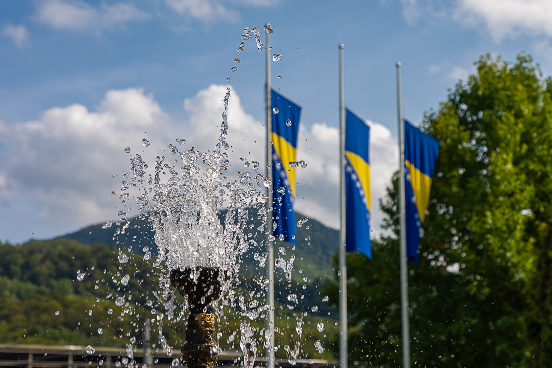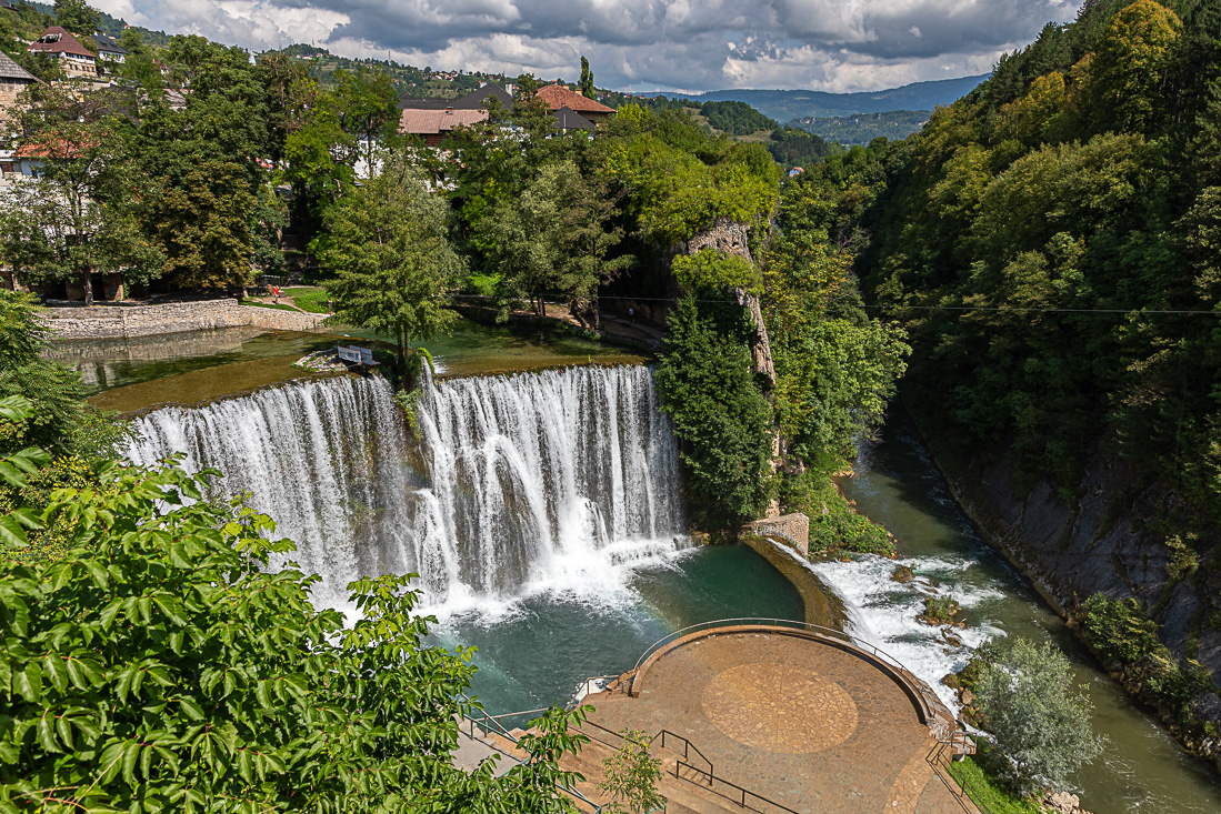 Woensdag 31 augustus. Na een heerlijk ontbijt op het terras eerst maar eens wat foto's gemaakt en de drone uitgelaten. Daarna de wandelschoenen aan voor een flinke tippel naar het centrum van Jajce. Onderweg bleek er een lokale markt te zijn waar echt van alles werd verkocht, van groente tot bijlen. In Jajce eerst even de BH Telecom shop bezocht om een internet-simkaartje voor onze Mifi aan te schaffen. Bosniërs hebben misschien de naam stug te zijn, maar de man van deze shop liet zien dat het ook anders kon. Bijna 20 minuten is hij bezig geweest om ons te assisteren bij het aan de gang krijgen van de simkaart. We hebben hem daarna op het naastgelegen terras maar een kopje koffie aangeboden. En dan wordt het toch echt tijd om de wereldberoemde waterval van Jajce te gaan opzoeken. Via een met vele bloembakken versierde brug bereikten we het uitkijkpunt op deze nogal fors uitgevallen waterval. Tijdens de fotosessie komt er een stoet zwarte auto's met zwaailichten aanrijden, stopt en er stapt een -waarschijnlijk- Bosnische BoBo uit. Toen de delegatie op het uitkijkpunt stond en ik vroeg of ik een foto mocht maken stapte er zo'n klein gedrongen kleerkastje op me af: "I'm police, who are you....". Kleine druktemaker! Na een snelle klim naar het boven de stad gelegen fort maar weer eens richting onze Konoba gewandeld. Het werd intussen aardig donker boven ons hotel, dus maar flink doorgewandeld. We waren nog geen 10 minuten in het hotel toen het losbarstte. Wát een bui! Wel handig om tijdens de regenbui alvast een start te maken met dit vakantieverslag.