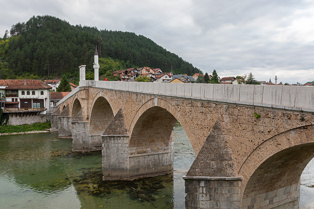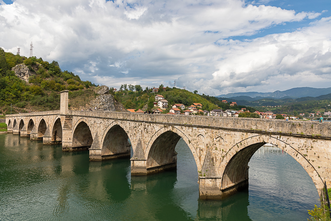 Zaterdag 3 september. Alles weer ingepakt en de trappen afgezeuld. Waarom stopppen ze ons overal op de 2e verdieping? De tassen in de motorkoffers gepropt en afscheid genomen van Arnel en zijn vrouw. Nog even naar Konjic gezwaaid en de weg naar Sarajevo opgedraaid. Alweer zo'n prachtige route. Een uur later reden we door Sarajevo, eerst de lelijke buitenwijken en veel later het mooie oude gedeelte, met z'n mooie gebouwen en oude trammetjes. Via Sokolac en Han Pijesak reden we langzaam richting Srebrenica. In Bratunac stopten we bij een supertje om wat eten te scoren. Gelijktijdig stopte er een auto en stapte een Nederlander uit, die onze kentekens had gespot. Dit bleek veteraan Rob -eigenaar van B&B Zomerrust in Potocari- te zijn, die ik enkele weken geleden een mail had gestuurd over de toestand van de wegen in dit gebied. En dan nét achter ons rijden als we hier zijn. Wát een toeval! Na even met Rob te hebben gesproken, stapten we weer op om iets later het dal van Srebrenica binnen te rijden. In Potocari stopten we bij de indrukwekkende begraafplaats met de 8000 graven. Om stil van te worden.... Een mede-bezoeker wilde graag weten waar wij vandaan kwamen (vragen naar de bekende weg). Hij was hier in 1995 en wilde even kwijt: 'The Dutch are crazy'. Maar niet op gereageerd en ook maar niet gevraagd wat hij dan eigenlijk van de veroorzaker van de ellende, de Serviërs vond! We vervolgden onze route door het dal en na Srebrenica klommen we via veel bochtjes naar boven, om heel veel later weer af te zakken en bij de Bajin Basta de Drina én de grens naar Servië over te steken. Maar eerst bij zowel de Bosnische- als Servische douane alle documenten laten zien natuurlijk. We vragen ons steeds af op welke kwaliteiten een douane-beamte hier wordt geselecteerd. Chagrijnig kijken lijkt een van de belangrijkste criteria. Een mooie route door Servië bracht ons een ruim uur later weer aan de volgende Servische/Bosnische grens, waar we opnieuw kennis maakten met een stel lachebekjes. In Visegrad vonden we snel ons prachtige appartement in het centrum -Harmony Apartments- vlak bij de wereldberoemde brug.