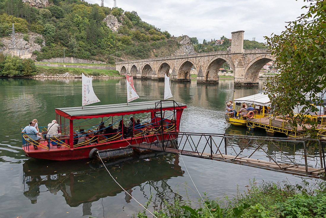 Zondag 4 september. Vandaag de motoren lekker laten rusten op de binnenplaats van ons appartement. Eerst maar een koffie scoren op een terrasje met uitzicht op de rivier. Daarna lieten we ons ompraten om een boottochtje te maken op een overmaats badkuip met een hoogbejaarde kapitein. Een halfuur later stonden we weer veilig aan de wal, veel foto's van de brug rijker. Hoogste tijd voor nog een kopje koffie op het terras van Hotel Visegrad met uitzicht op de brug. Daarna het schiereiland verkend om nog wat foto's te maken. Intussen werd het donkerder en donkerder en begon het in de verte te onweren. Snel terug naar ons appartement en daar bleek de WiFi snel genoeg om de Formule 1 in Zandvoort te kunnen bekijken. F1 kijken op een smartphone bleek weer eens een nieuwe ervaring. We vierden Max z'n overwinning op het terras van Restoran Anika aan de overkant van de rivier. Daarna nog even gewerkt aan het vakantieverslag en nu lekker snurken.