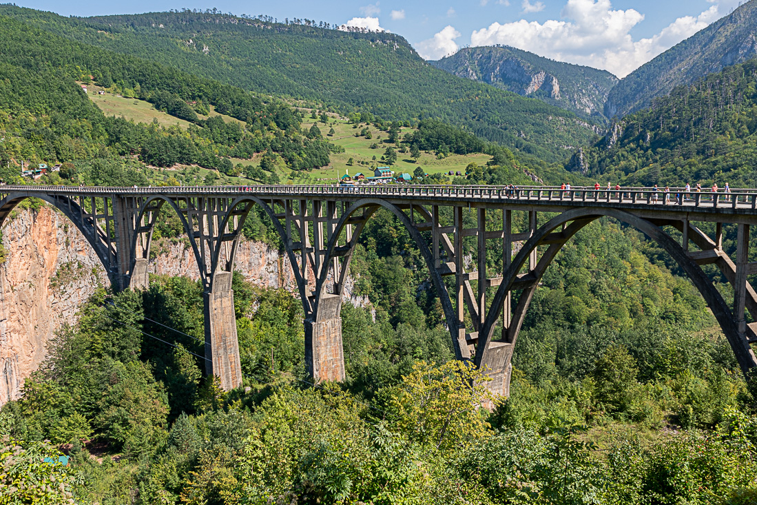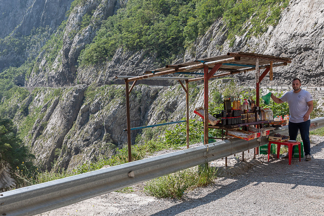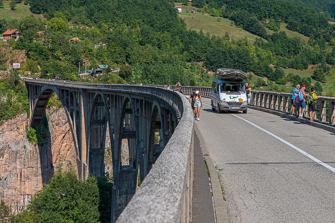 Dinsdag 6 september. Na een heerlijk ontbijt stapten we op voor een prachtige route naar de bekende Tara-brug. Via Danilovgrad en het drukke Podgorica volgden we de 'oude' route over de M2 de bergen in. Een prachtige route door diepe valleien én onder de werkelijk enorme Moračica brug bracht ons steeds hoger. Zelfs langs deze afgelegen weg zagen we de verkoopstalletjes. Natuurlijk moesten we een aantal malen stoppen voor een fotomomentje en meteen genieten van het uitzicht, want tijdens het rijden naar beneden kijken is niet zo verstandig. Héél veel kilometers later kwam dan toch de Đurđevića-Tarabrug in zicht. Vanzelfsprekend waren we lang niet de enige toeristen die de brug kwamen bezoeken, dus was het even zoeken naar een plekje voor de motoren. Maar bij Restaurant Most was er een hoekje vrij én bovendien een terras met uitzicht op de brug. Daar hebben we dus maar geluncht en daarna natuurlijk even de brug opgewandeld om wat foto's te maken. We vervolgden onze route via de P5 om aan het einde van de middag weer bij Seosko aan te komen. Tijd voor een rondje in het zwembad!