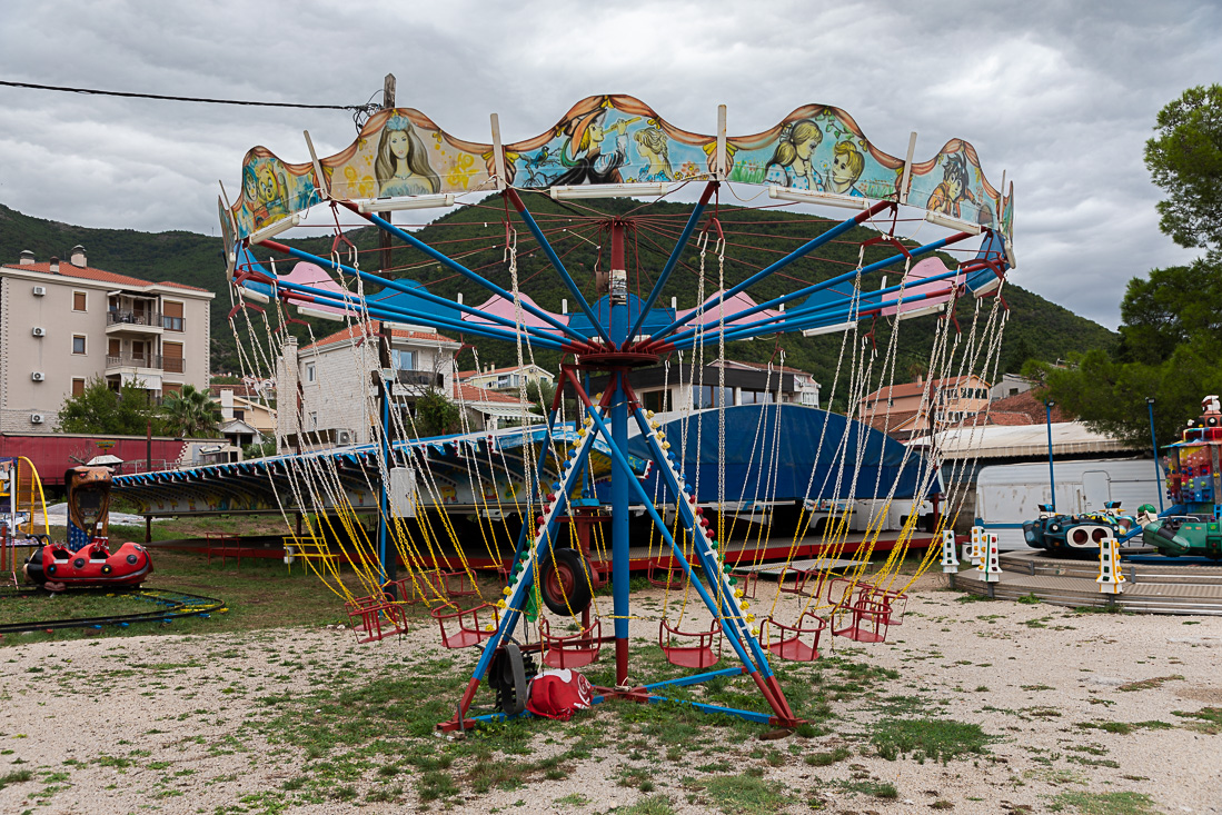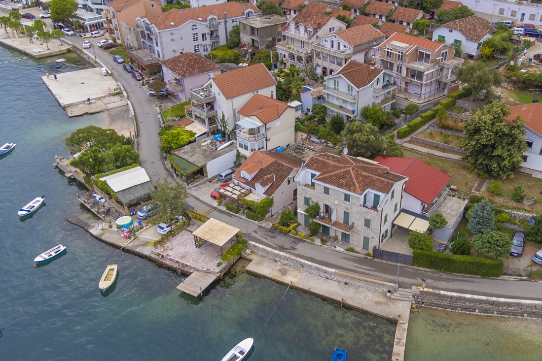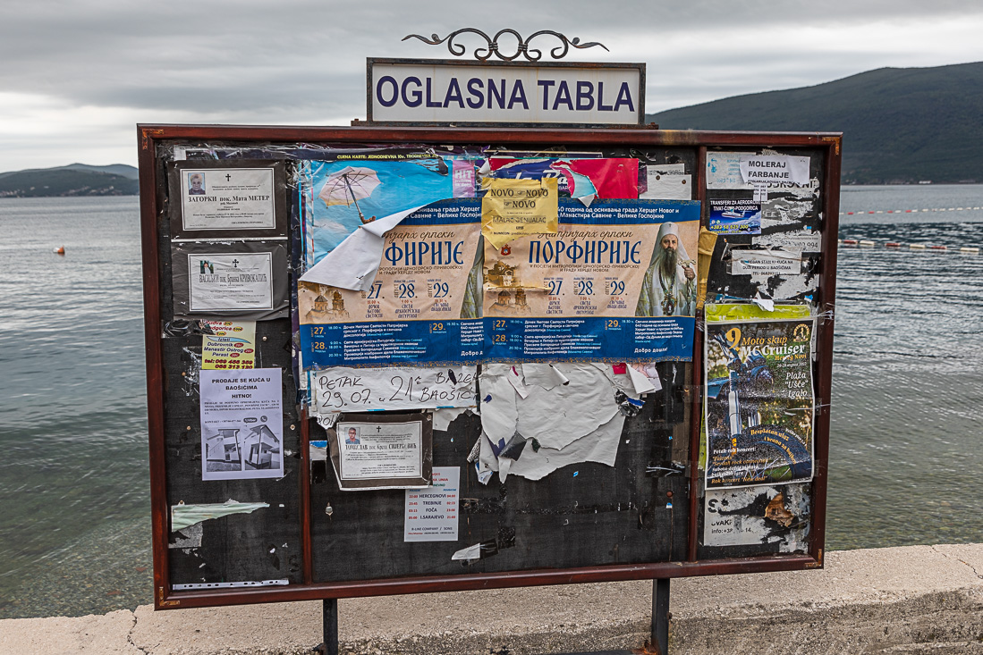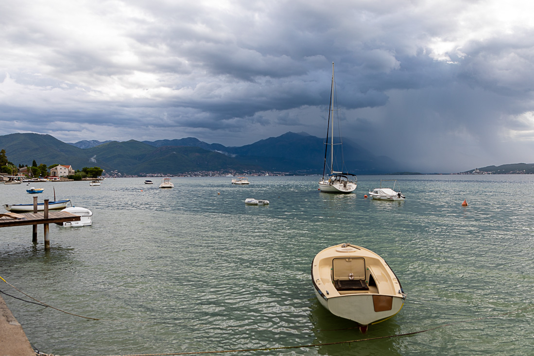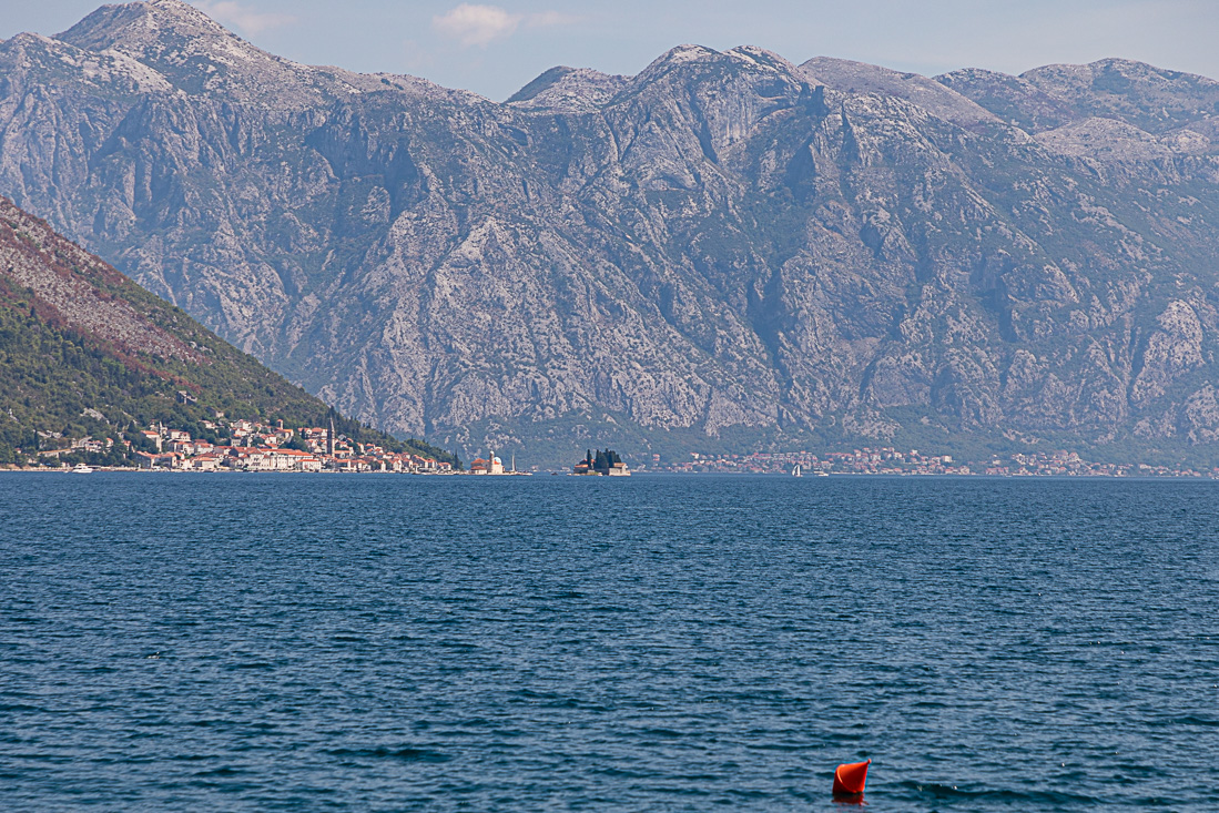 Vrijdag 9 september. Vandaag hadden we een rustdag ingepland, met héél misschien een boottochtje naar de bekende submarine bunkers aan de overkant. Maar ja, het weer werkte niet echt mee. Dus eerst maar eens rustig ontbijten bij Gusti Mora. De eigenaar had blijkbaar geen gasten verwacht op deze mistroostige dag en was lekker op een stapeltje kussens in slaap gevallen. Hij schrok zich werkelijk gek toen wij ineens naast hem stonden. Maar nu hij toch wakker was, kon hij meteen ons ontbijt verzorgen..... Intussen deed een waterig zonnetje z'n best om de boel wat op te leuken, dus hervatten we onze wandeling van gisteren in de andere richting, maar nu met camera's. Onderweg nog even geschuild voor opnieuw een stevige, maar korte bui. Ok, dan gaan we maar op ons eigen balkon lunchen en naar de zee kijken. Tegen een uur of vijf komt de alleraardigste verhuurster thuis, blijkt geen woord over de grens te spreken en maakt duidelijk dat we wel samen een Slivovitsj moeten drinken. Die slaan we niet af. Een halfuurtje Montenegrijnse taalles blijkt vermoeiend en we trekken ons terug op ons deel van het balkon. 's Avonds opnieuw werkelijk heerlijk gegeten bij de buren. Nog even nagezeten op ons balkon, waar het donkerder en donkerder werd en steeds harder begon te waaien, regenen en bliksemen. Ook de verwachtigen voor morgen zagen er niet veelbelovend uit. Da's altijd fijn als je op de motor zit.