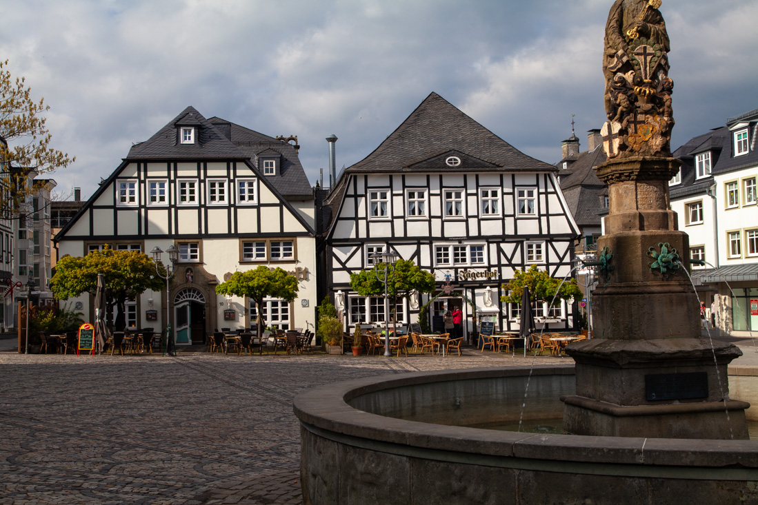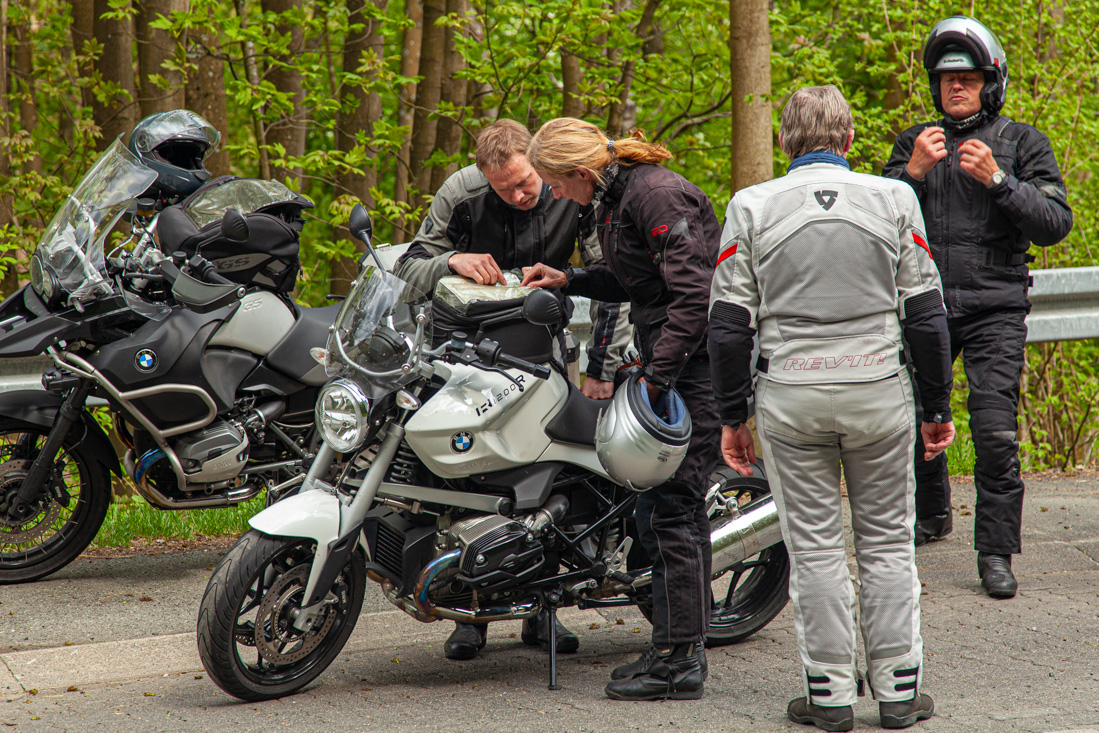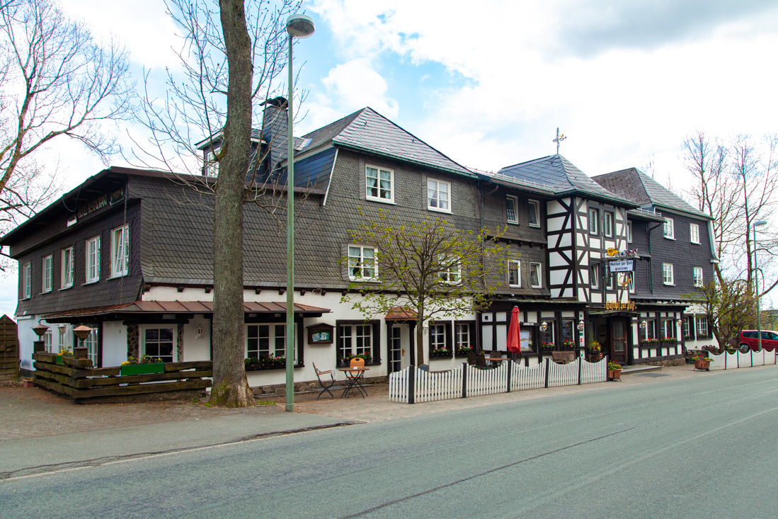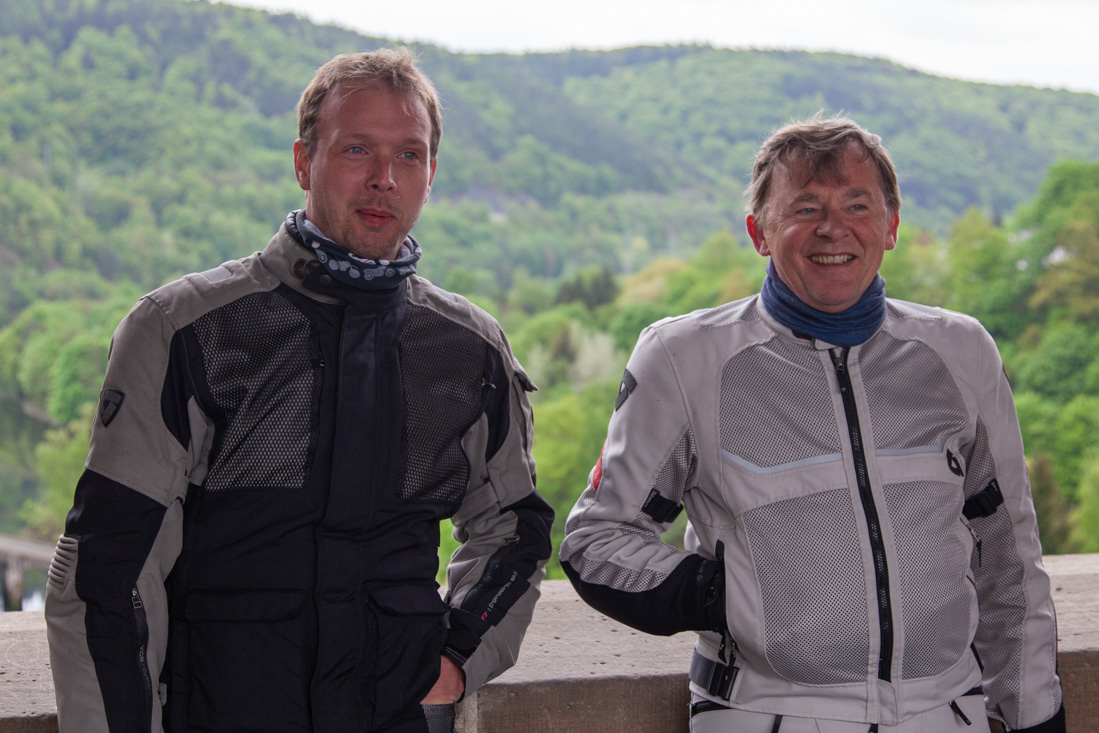 Er stond een flinke route geprogrammeerd voor vandaag, dus moest er bijtijds 'gefrüstückt' worden. En zo zaten we om halfnegen met kleine oogjes aan de ontbijttafel en een uurtje later rolden de motoren uit de garage. De route zou ons vandaag over de mooie wegen ten zuid-westen van Brilon voeren. We waren zo aan het genieten dat zelfs de koffiestop er bij inschoot. Dorstig en met rammelende magen reden we uiteindelijk het mooi gelegen stadje Biedenkopf binnen en volgden Paul die al snel een 'typisch' Duits terrasje had gevonden. De beter belegde broodjes bij Neue Krone smaakten voortreffelijk. We konden er weer even tegen en vervolgden onze route. Ook vandaag reden we weer nét na vijf uur Brilon binnen en hierna volgde hetzelfde scenario als gisteren, met dit verschil dat het biertje vanwege de frisse wind binnen gedronken moest worden.