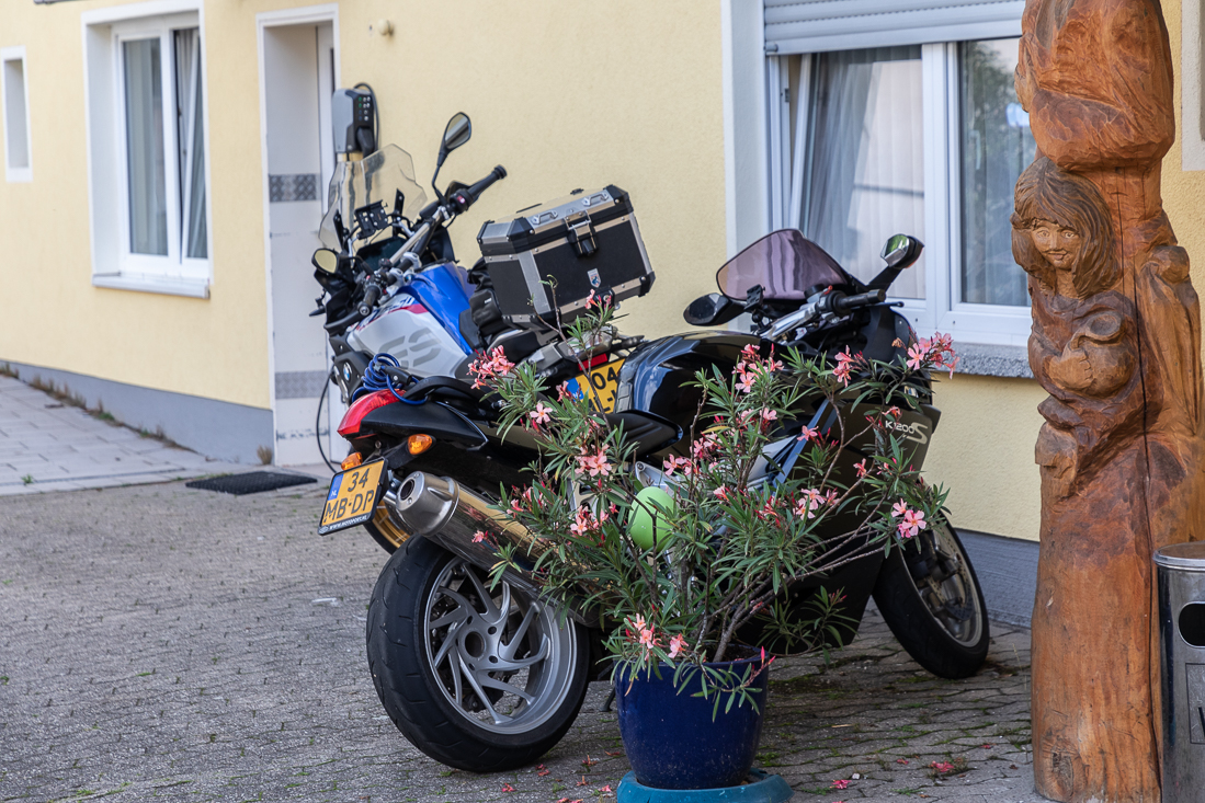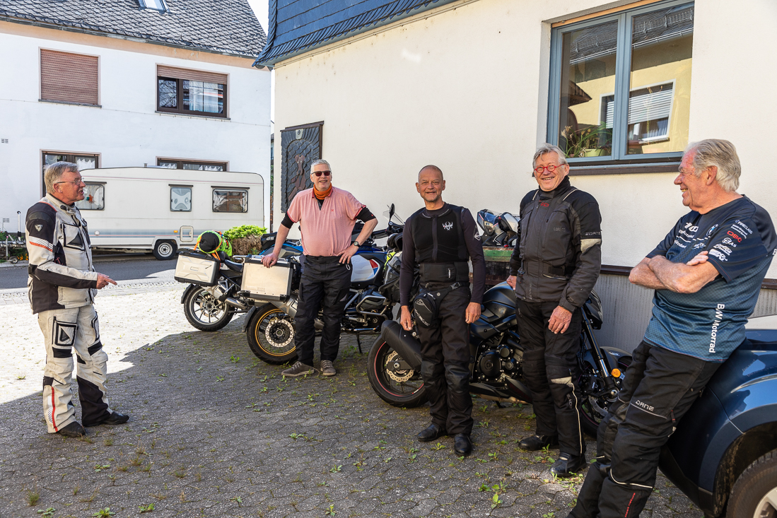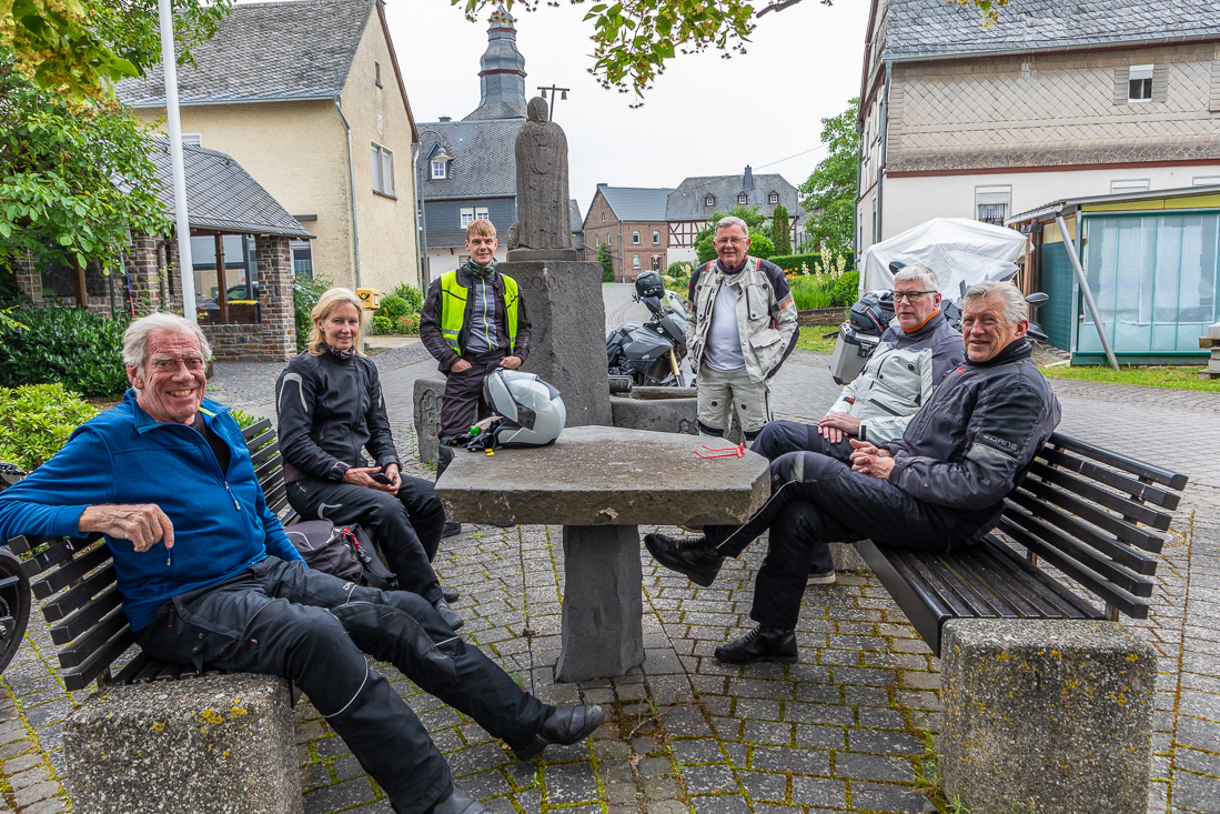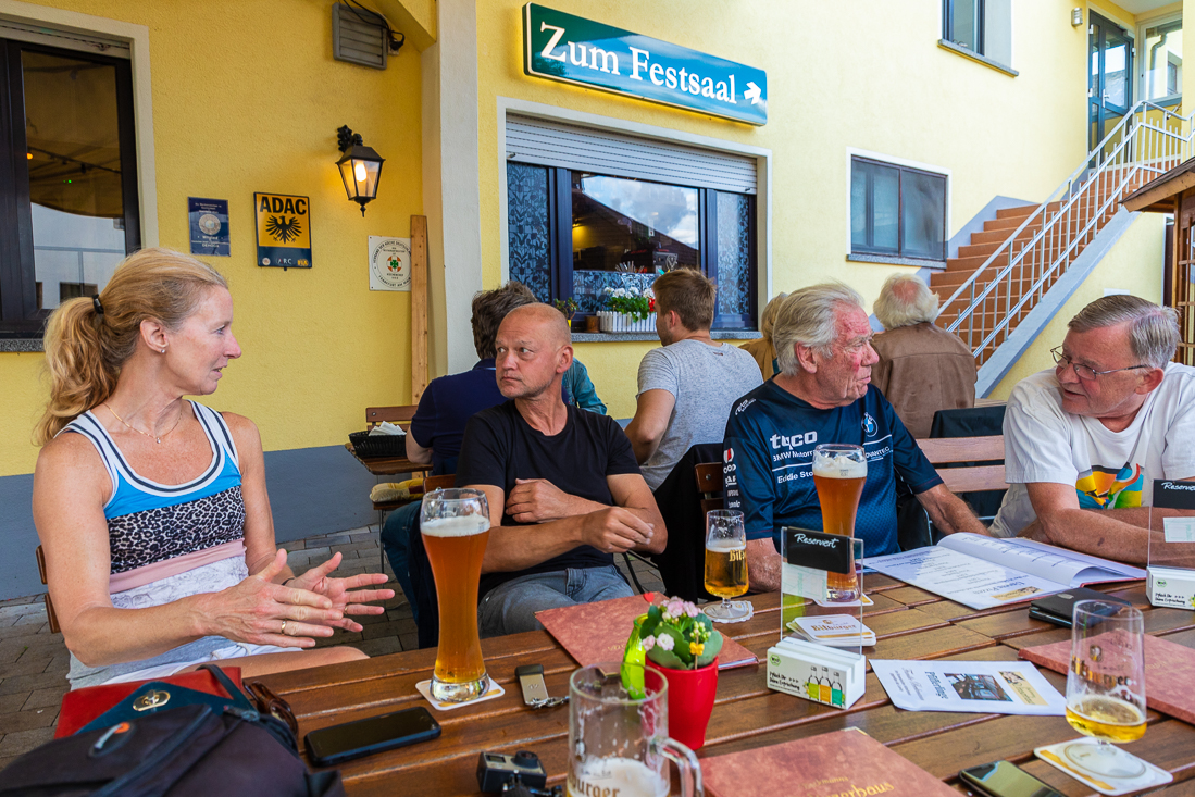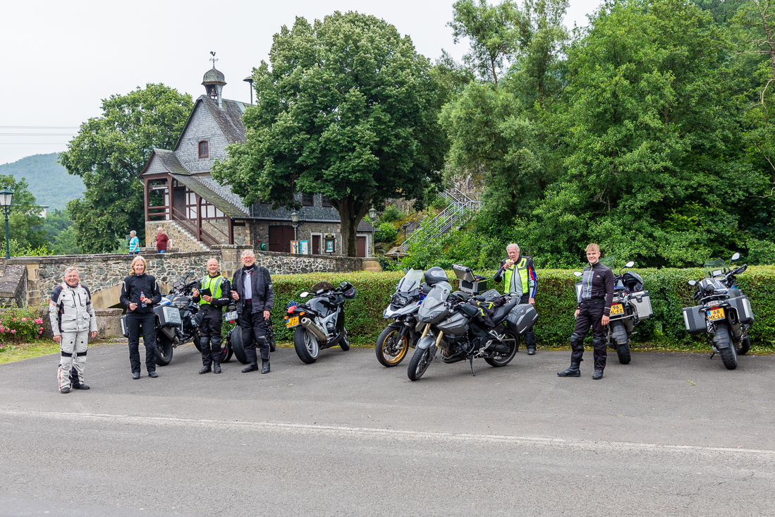 Donderdag 15 juli. De dag waar we met z'n zevenen zo lang naar hadden uitgekeken. Nog even een laatste WhatsApp-berichtje van- en aan Bart, die vanuit Frankrijk zou 'aanhaken' en toen was het tijd om op te stappen. Uit de dreigende grijze wolken viel tot nu toe nauwelijks regen van betekenis, dus dat scheelde weer. Rond half elf draaiden we bij Oberhausen de A3 op. Door het langzaamrijdende verkeer ging de snelheid er rap weer uit. Enkele tellen later verscheen er in onze spiegels een enorme colonne voertuigen van allerlei verschillende hulpdiensten, onderweg naar hoogwatergebieden. Na zo'n 30 kilometer verlieten we bij Ratingen gelukkig de autobahn, om onze route naar Urbar binnendoor te vervolgen. Door de ontelbare omleidingen konden we de uitgezette route niet overal volgen. Voorrijder Agnes wist de route steeds weer kunstig op te pakken. De normaal gesproken zo rustige smalle motorweggetjes waren nu overvol door het sluipverkeer. Zelfs veel te brede vrachtwagens, die elkaar dan ook nog eens moesten passeren. Dat ging op een plek dan ook maar nét goed; het scheelde maar een haar of de grote vrachtwagen was het lager gelegen weiland in gekieperd. Verder zuidelijk werd het rustiger en na een lunch in Much kon het gas er weer op.