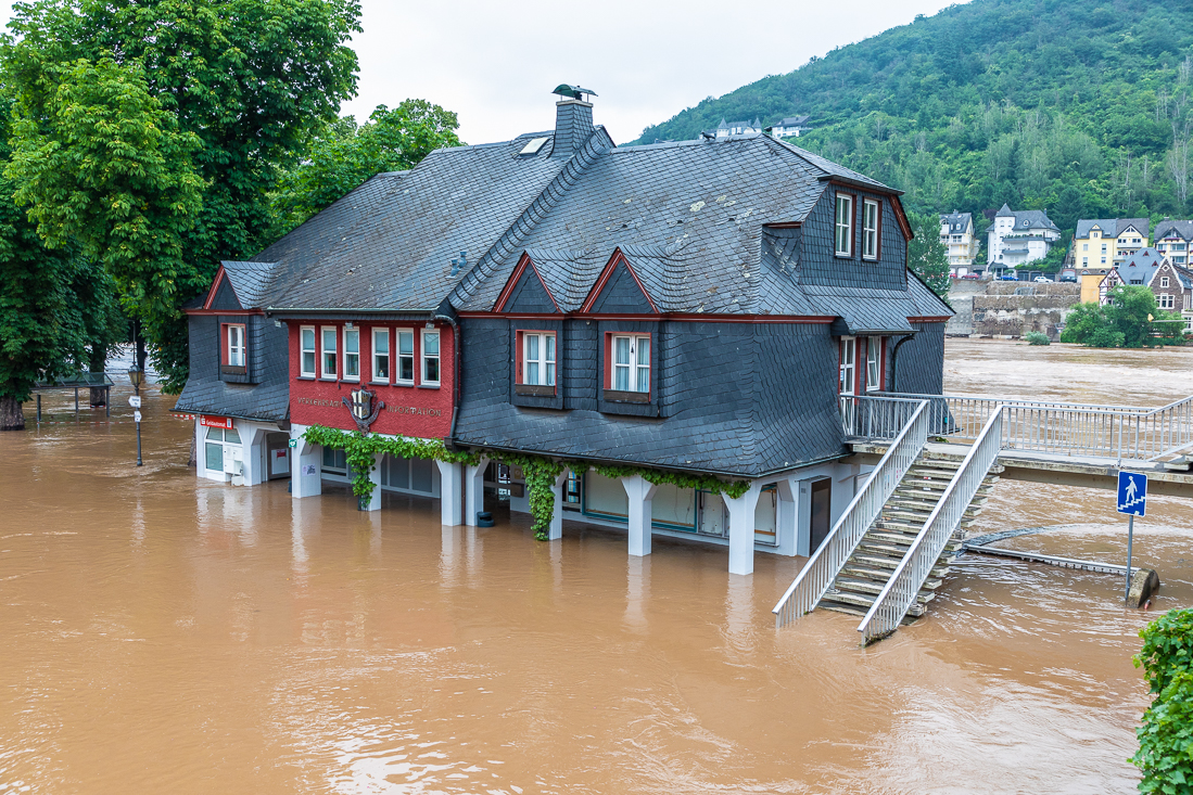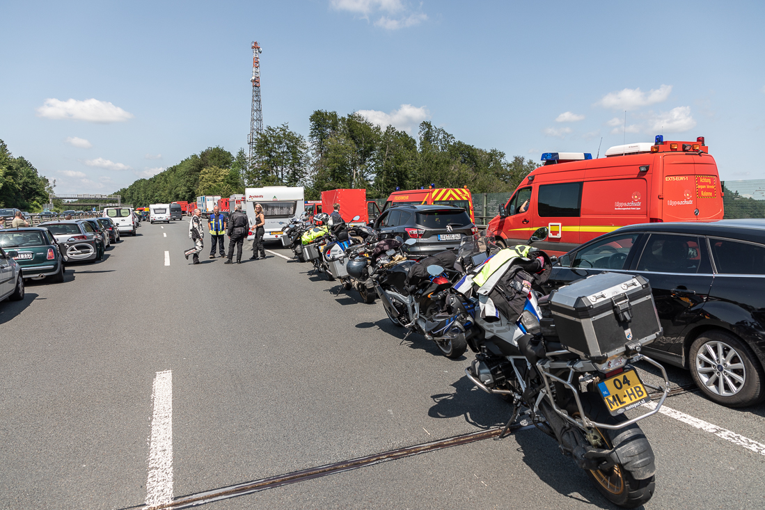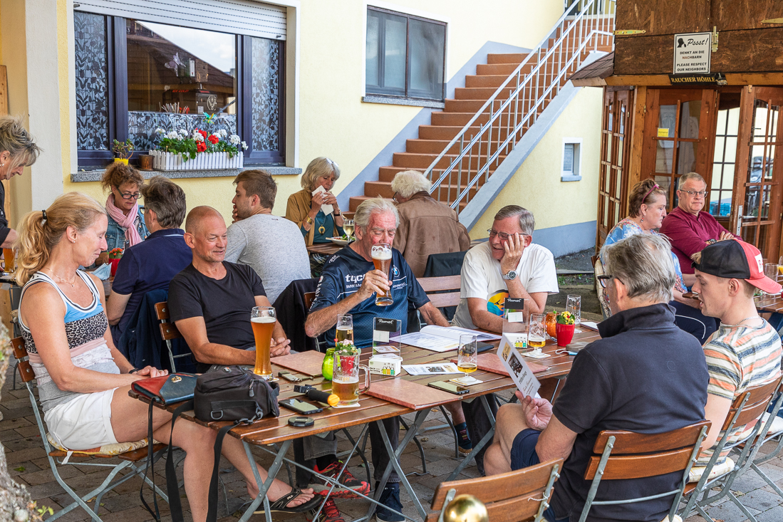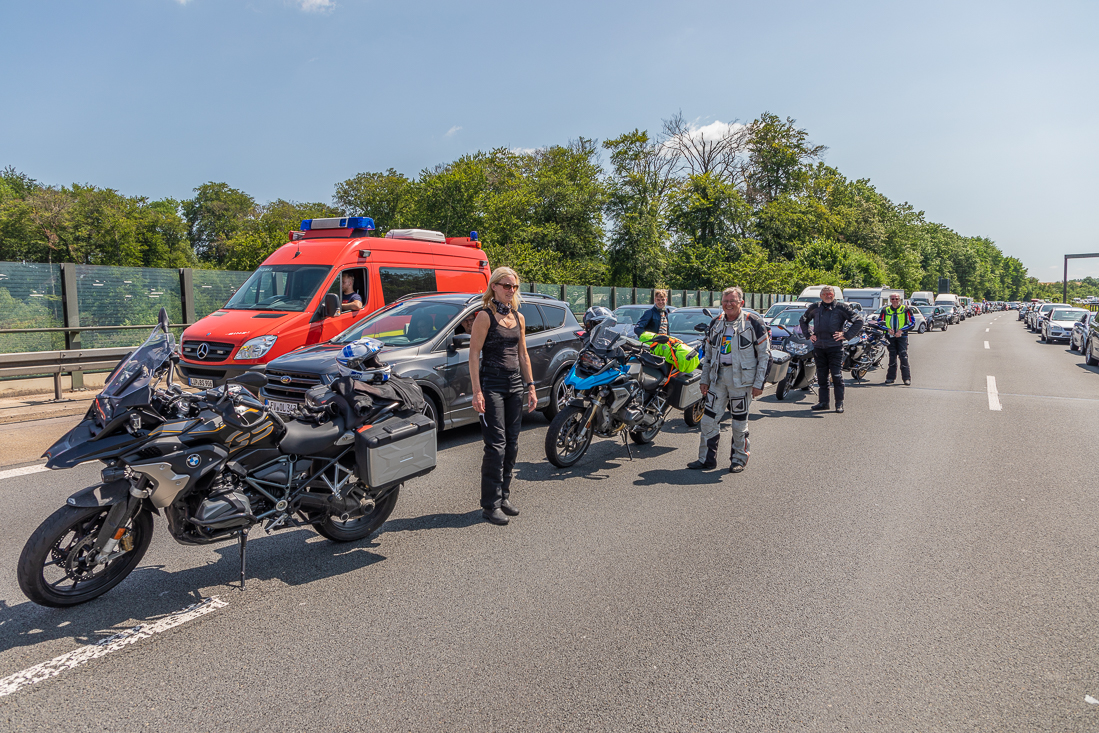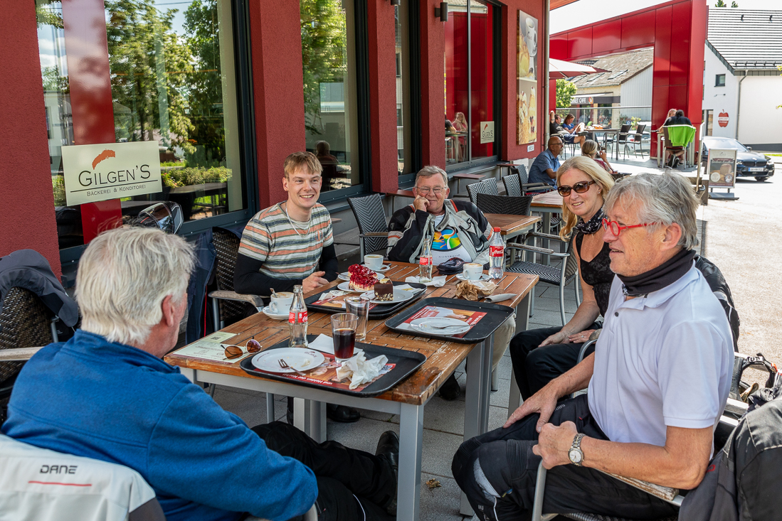 Donderdag 15 juli. De dag waar we met z'n zevenen zo lang naar hadden uitgekeken. Nog even een laatste WhatsApp-berichtje van- en aan Bart, die vanuit Frankrijk zou 'aanhaken' en toen was het tijd om op te stappen. Uit de dreigende grijze wolken viel tot nu toe nauwelijks regen van betekenis, dus dat scheelde weer. Rond half elf draaiden we bij Oberhausen de A3 op. Door het langzaamrijdende verkeer ging de snelheid er rap weer uit. Enkele tellen later verscheen er in onze spiegels een enorme colonne voertuigen van allerlei verschillende hulpdiensten, onderweg naar hoogwatergebieden. Na zo'n 30 kilometer verlieten we bij Ratingen gelukkig de autobahn, om onze route naar Urbar binnendoor te vervolgen. Door de ontelbare omleidingen konden we de uitgezette route niet overal volgen. Voorrijder Agnes wist de route steeds weer kunstig op te pakken. De normaal gesproken zo rustige smalle motorweggetjes waren nu overvol door het sluipverkeer. Zelfs veel te brede vrachtwagens, die elkaar dan ook nog eens moesten passeren. Dat ging op een plek dan ook maar nét goed; het scheelde maar een haar of de grote vrachtwagen was het lager gelegen weiland in gekieperd. Verder zuidelijk werd het rustiger en na een lunch in Much kon het gas er weer op.