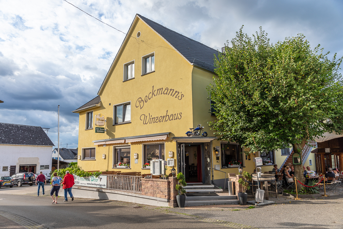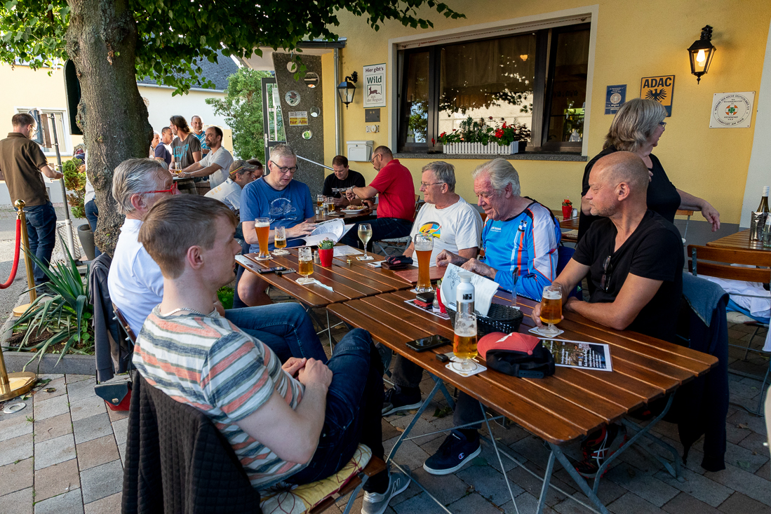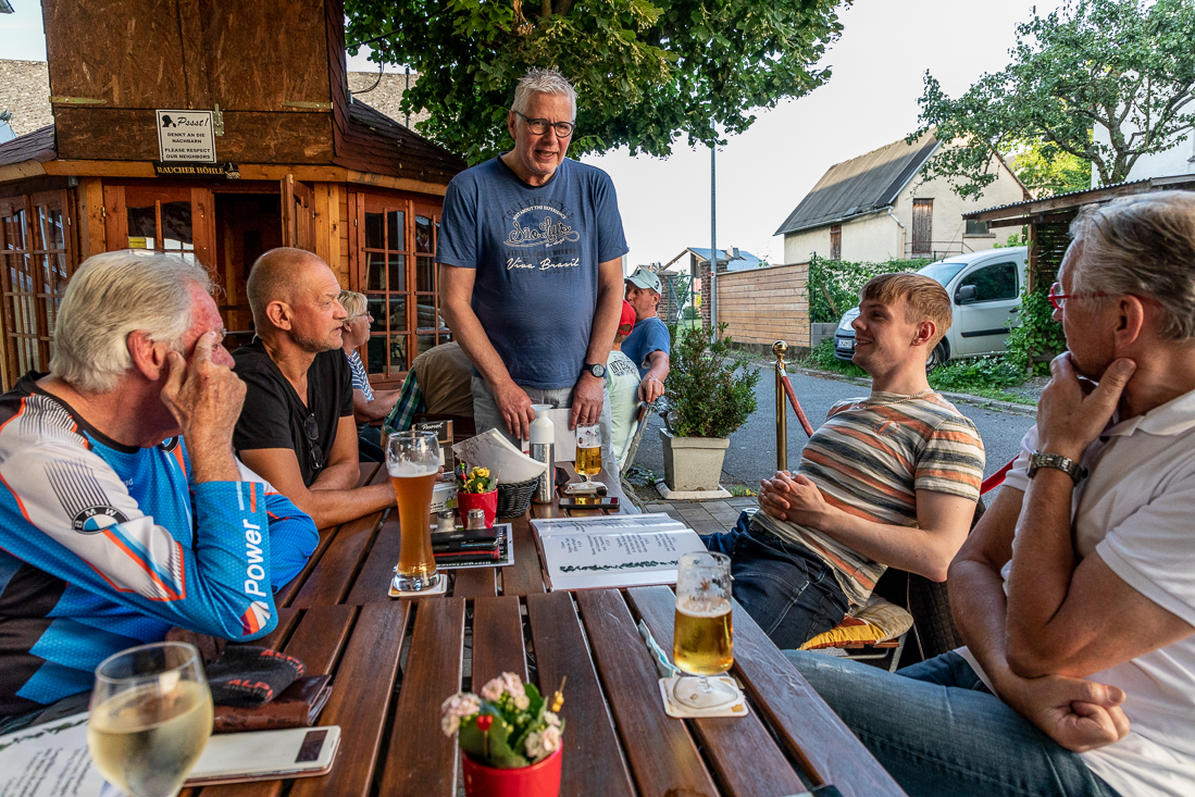 Om iets over half zes reden we het hoger gelegen Urbar in, waar we al snel Beckmanss Winzerhaus hadden gevonden. De wedstrijd 'wie zit er het eerst op het terras' werd alweer gewonnen door Louk.... Precies op tijd om Bart te ontvangen. Het duurde niet heel erg lang voordat de complete groep aan onze zelfbedachte stammtisch zat. Het bleef nog lang gezellig, maar niet zo héél erg lang. De motorkilometers en het kleine biertje vergde zijn tol en bijtijds zocht iedereen z'n bedje op.