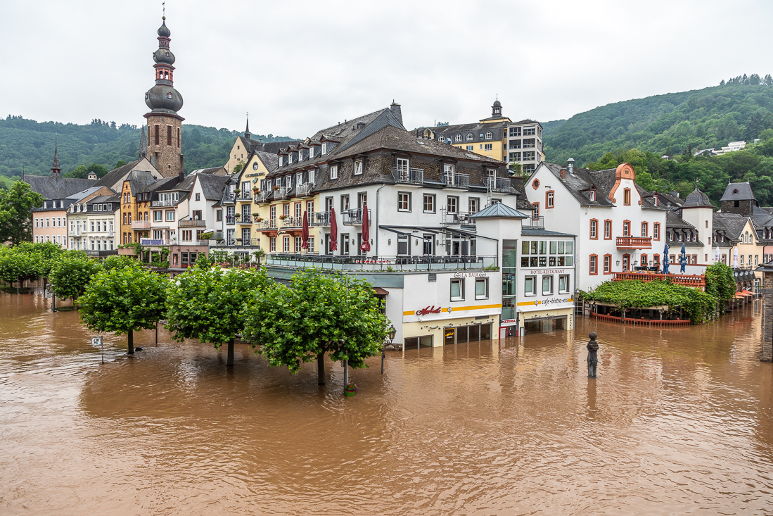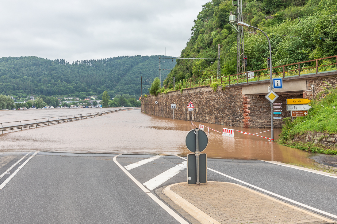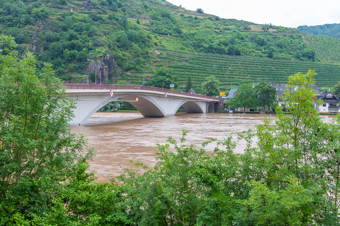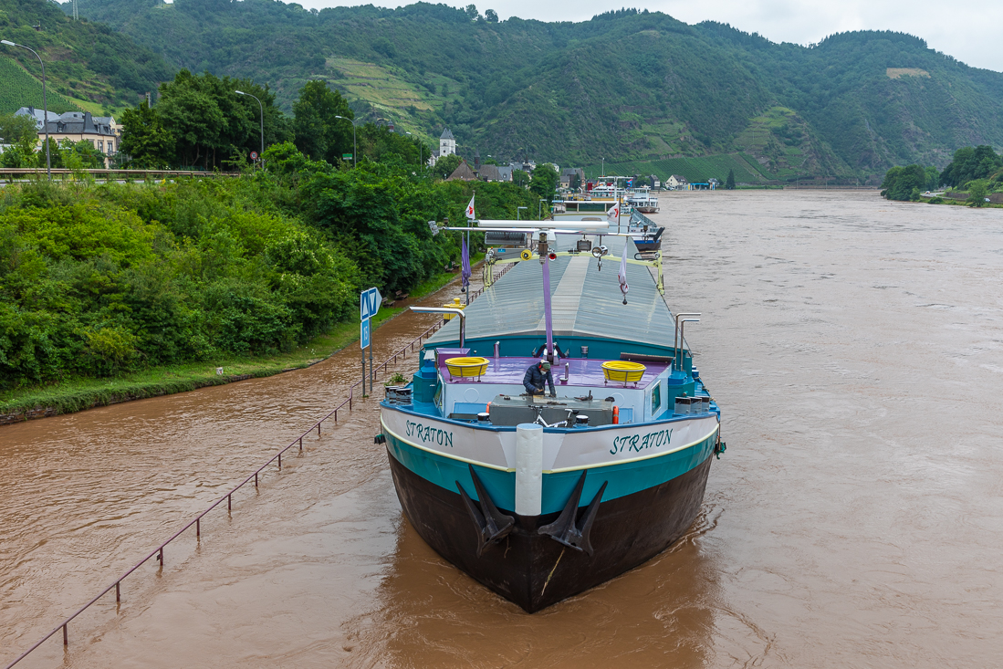 Al snel bleek dat de weg langs de Moezel niet berijdbaar was en konden we bij Burgen niet naar beneden. Een vriendelijke dorpsbewoner wist te vertellen dat we bij Treis-Karden wél de brug over konden. Zo gezegd, zo gedaan. Beneden aangekomen werd de chaos al snel duidelijk. De Moezel bleek zo'n 8 M hoger te staan dan normaal. Na de brug konden we via een soort nood-spoorovergang naar Treis-Karden komen. Hier even geparkeerd om de situatie te bekijken en wat foto's te maken. Daarna op een terrasje in het dorp gestopt voor een snelle lunch. Door een omleiding konden we het mooie weggetje nét voor Cochem niet in en besloten dan toch maar even in de stad zelf te gaan kijken. Wát een ravage en wat een trieste aanblik. Bij Cochem meteen maar de brug overgestoken en de route enigszins aangepast. Nog even laatste stop ergens op een dorpspleintje en toen de laatste bochtjes richting Urbar, waar we alweer rond half zes aankwamen. Vandaag ietsje frisser, dus na het eten onze tafel maar verruild voor een binnenexemplaar!