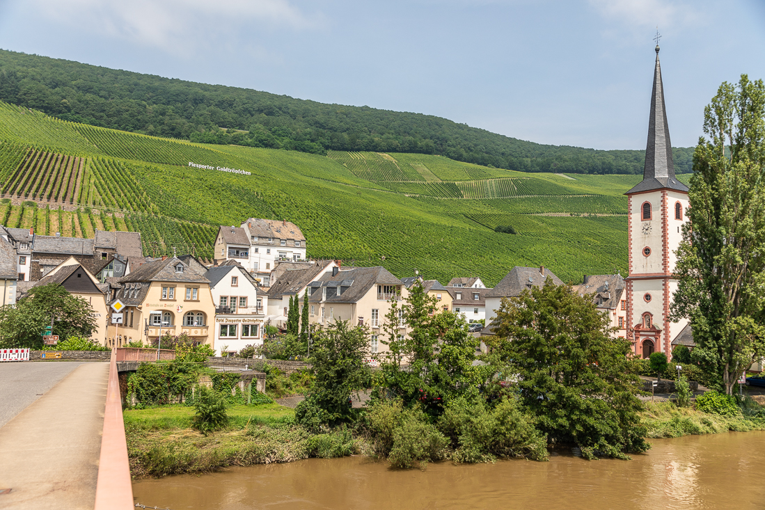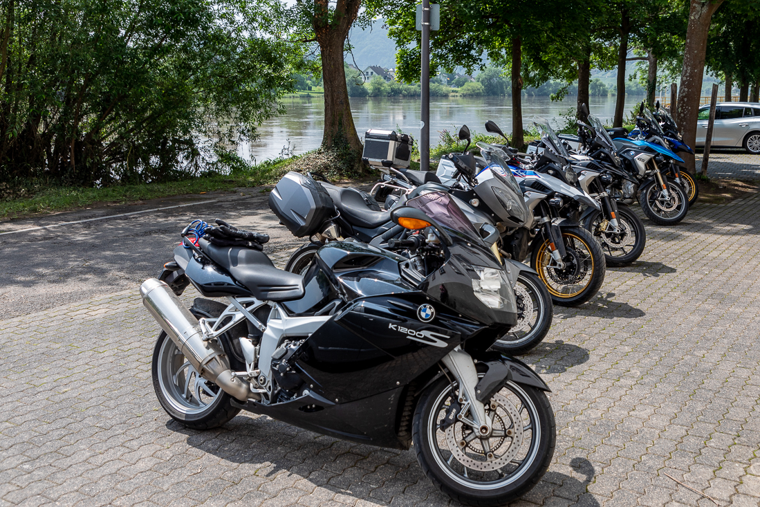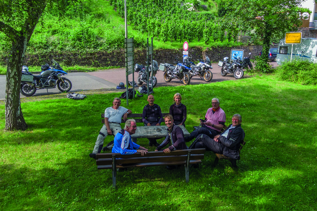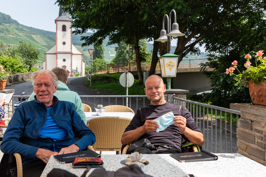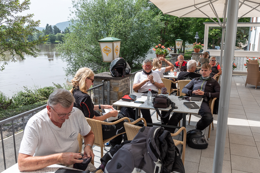 Zaterdag 17 juli. Vandaag ging onze route richting Bingen, maar eerst maar even tanken in Oberwesel. Na het tanken had Eriks motor geen puf meer en startte niet. Oeps.... Aanduwen lukte niet, maar de vriendelijke buurman mét garagebedrijf was zo aardig om even een jumpstarter aan te sluiten. We konden weer op pad. Bij Bingen ging onze route het binnenland in en na de mooiste weggetjes en afdalingen tussen de wijnranken moesten we even de benen strekken. Tot opluchting van Erik startte zijn motor nu gewoon. Alweer ontelbare bochtjes later bereikten we de brug bij Piesport, die open was. Bart z'n oplettendheid zorgde ervoor, dat we iets later op een terrasje van een overheerlijke lunch zaten te genieten. Daarna met vollle snelheid de mooie bochtjes bij Piesport naar boven.