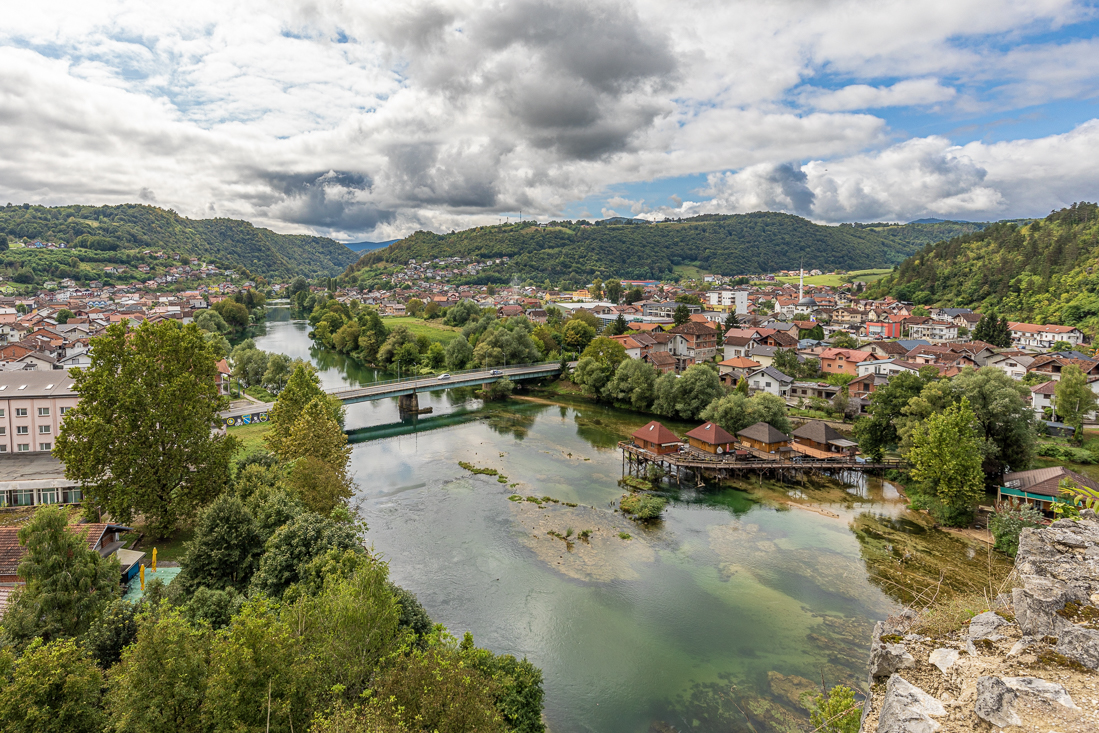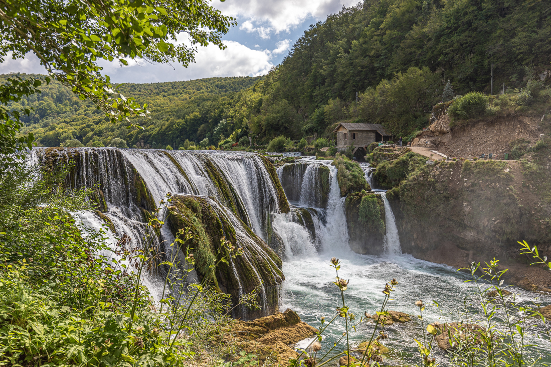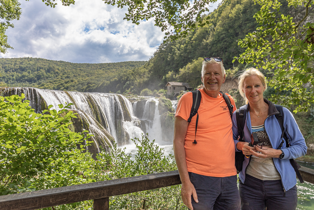 Dinsdag 5 september Op naar de watervallen van Štrbački buk. Opnieuw de prachtige route naar Bihać en een stuk zuidelijker het Nationaal Park Una in. Het eerste deel was nog geasfalteerd, maar een heel groot deel onverhard met behoorlijke kuilen. Alsof we deelnemer waren aan de race Parijs-Dakar. De auto zag er in ieder geval wel zo uit toen we eindelijk op de grote -zanderige- parkeerplaats aankwamen. Na een flinke wandeling over de houten vlonders en ontelbare foto's reden we weer terug naar de hoofdweg, waar we rechtsaf gingen voor een bezoekje aan Kulen Vakuf. Maar niet voordat Agnes bij een stalletje langs de weg wat huisgemaakte jam had gekocht. Kulen Vakuf bleek niet meer dan een minidorp met krakkemige brug én een moskee. Gelukkig was er ook nog een restaurantje met terras aan het water. We lieten ons de plaatselijke lekkernij goed smaken. Daarna nog even de drone uitgelaten en dan weer op weg naar de camping.