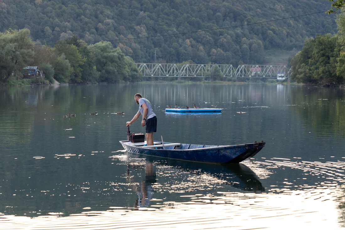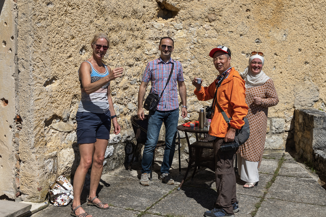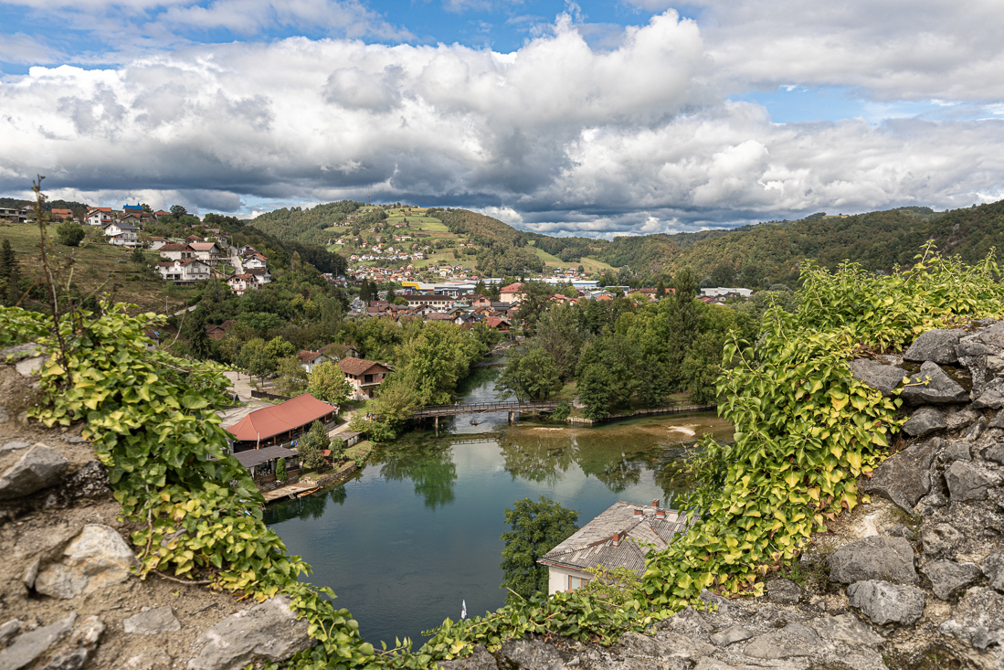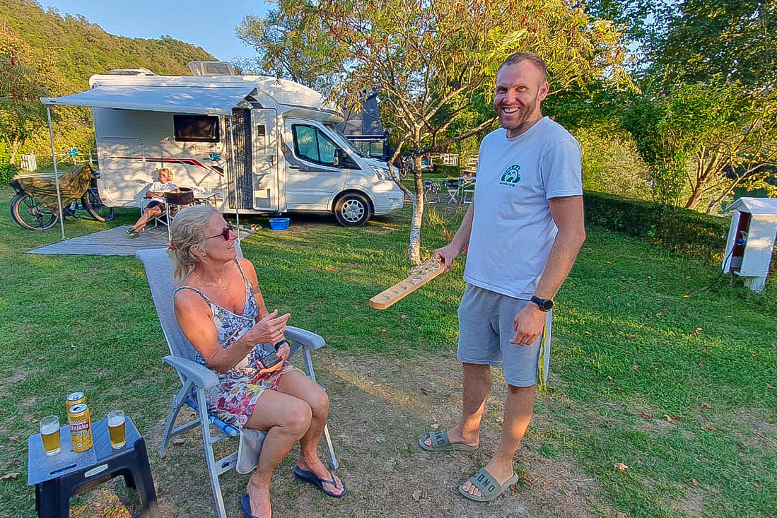Zaterdag 2 september Tijd voor een stadsbezoek, dus op naar Bihać. Na Bosanska Krupa werd de route alsmaar mooier en de kloof langs de Una steeds maar smaller. Onderweg stopten we nog even bij de waterval van Kostelski Buk om wat foto's te maken. Niet heel indrukwekkend. Verder op de route zien we de Duitse motorrijder, die vanochtend vertrok van de camping aan de kant van de weg staan. Hij bleek geen pech te hebben, maar was gewoon bij de bakker gestopt. Goed idee, dus wij ook meteen maar wat hartigs gekocht voor later op de dag. In Bihać vonden we een parkeerplek langs de straat, maar toen nog proberen een parkeerkaartje te bemachtigen uit de parkeermeters uit het stenen tijdperk... Agnes ging op pad om geld te wisselen, maar geen van de winkeliers wilde, of kon wisselen. Nog even verder gezocht, maar helemaal nergens een parkeerplek kunnen vinden. Dus werd dit het kortste stadsbezoek ooit. Op de terugweg besloten we dan maar het Ostrožac Castle te gaan bezichtigen. Maar eerst even een frisje scoren op een terras in het dorpje. We lieten de auto lekker in de schaduw staan en wandelden naar het kasteel. Na een wandeling door de kasteeltuin kwamen we via een trap op een terras met prachtig uitzicht op de Una en raakten in gesprek met twee zeer vriendelijke inwoners van Ostrožac (Hifzija en z'n vrouw), die ons vervolgens échte Bosnische koffie met koekjes aanboden. Iets later schoof ook nog een Chinese toerist aan, die het allemaal geweldig vond. Na een hartelijk afscheid nog even wat gedronken op 'ons' terrasje en via een mooie route langs Cazin terug gereden naar de camping. Hasan kwam even melden dat we morgen om 10.00u opgehaald zouden worden om te gaan raften. Yes!!! Terwijl ik m'n drone-opnames van vandaag overzet naar m'n telefoon, hoor ik een stemmetje achter de auto: 'hier staan ook Nederlanders....'. De stem bleek toe te behoren aan de 3-jarige blonde krullenbol Thijs, die al sinds mei met z'n ouders Amanda en Dennis op reis was met de camper door Europa. Die middag kwam Thijs regelmatig gezellig even kletsen en uiteindelijk schoven z'n ouders ook aan om samen een biertje te drinken.