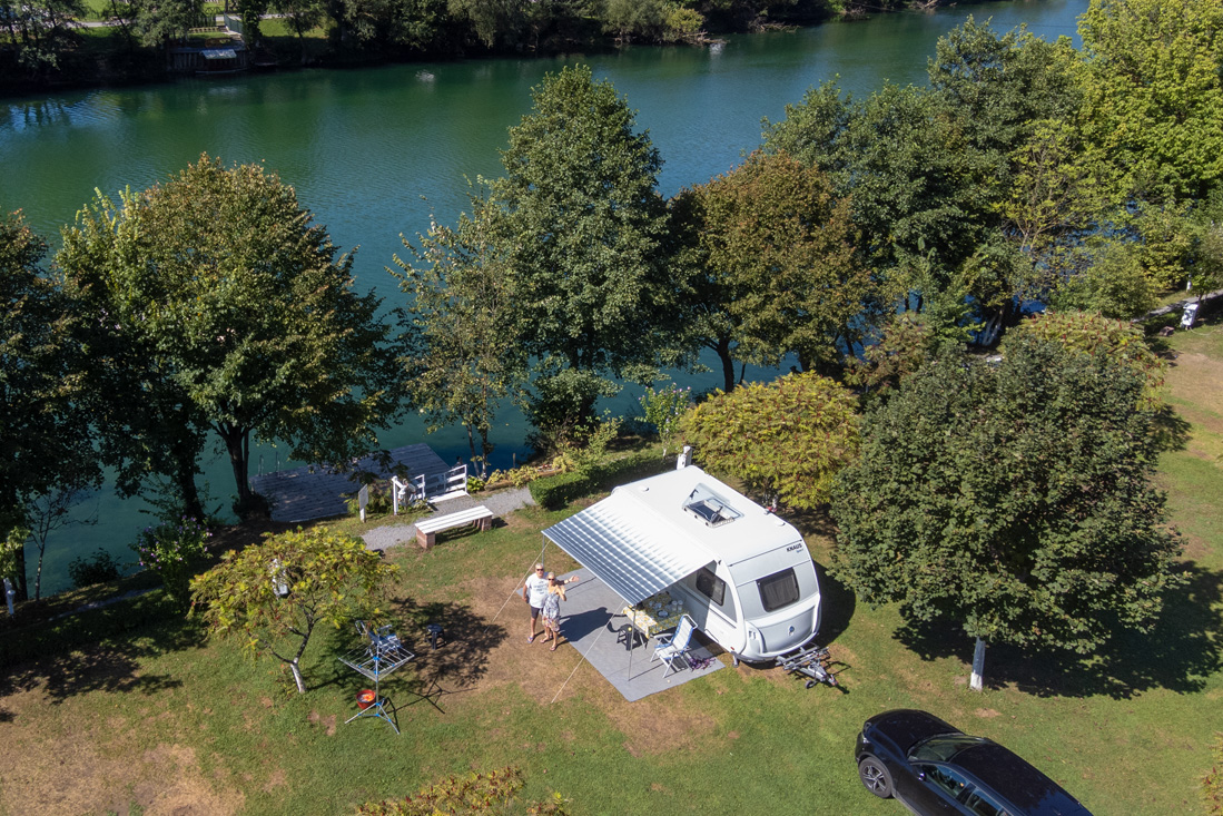 Woensdag 30 augustus Tijd om weer eens wat verder te reizen. Op naar Bosanska Krupa in Bosnië. Omdat een vignetvrije route van Maribor naar Kroatië eigenlijk niet te doen is, kochten we bijtijds een digitaal exemplaar, voor maar 45 km autobahn. Na Zagreb draaiden we de A30 op, waarvan een flink stuk (nu nog tolvrije) autoweg is naar de grens met Bosnië, maar ook een flink deel een 2-baansweg met oneindig veel bochtjes en heuveltjes. In Hrvatska Kostajnica reden we de brug over om de grens naar Bosnië te passeren. De Kroatische grensmeneer was vandaag niet zo blij, in tegenstelling tot z'n Bosnische collega, die veel lol in z'n werk bleek te hebben. Iets later reden we dan (na een jaar) opnieuw in Bosnië. We hoefden slechts de rivier de Una te volgen, die ons uiteindelijk in Bosanska Krupa zou brengen. Iets voor Bos.Krupa zien we een bordje van Una Kamp en slaan links af. Na 500 M een krappe bocht naar een smalle brug en ja hoor, komt er van de andere kant een vrachtwagen. Gelukkig bleek de chauffeur over inzicht te beschikken en begreep dat het achteruitrijden met caravan in dit geval niet handig was en maakte hij plaats voor ons. Het 'billenknijpen' was echter nog niet over, want het bijna 2 km. lange toegangsweggetjes naar de camping bleek ook nog eens verrassend smal. Maar tegen half twee reden we dan toch de camping op, die zo goed als leeg bleek te zijn. Eigenaar/pachter Hasan bleek iemand van zeer weinig woorden en liet weten dat we elke plek mochten kiezen. Dus stonden we iets later bij het trappetje naar het zwemplateau en zaten nog iets later met een bak koffie uit te kijken over de Una. We werden hartelijk verwelkomd door een hond, waarvan we toen nog dachten dat zij bij de camping hoorde, maar later bleek ze een zwerfhond te zijn. We noemden haar vanwege het uiterlijk en enthousiasme maar Pluto, wat gezien het geslacht natuurlijk niet helemaal klopte. Eind van de dag maar eens naar het stadje om wat Marken en een biertje te scoren.
