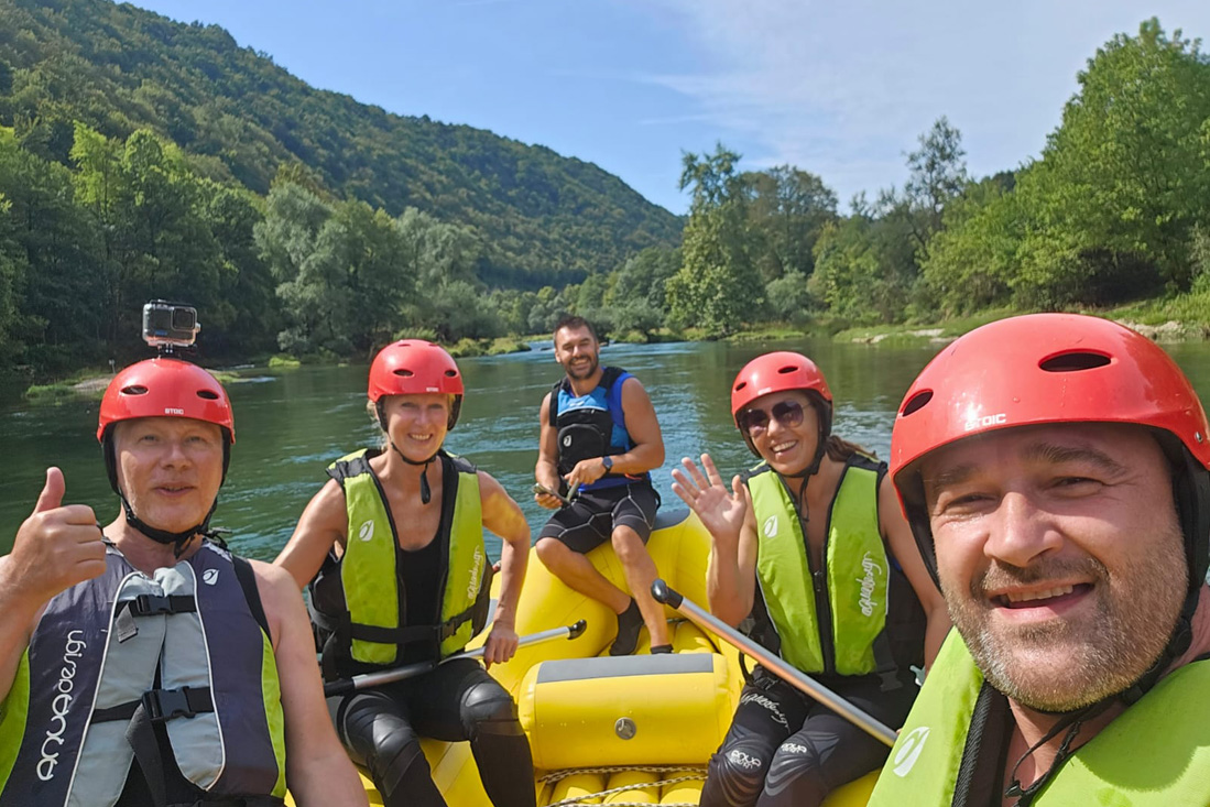 Zondag 3 september Helaas moesten we afscheid nemen van Thijs en z'n ouders, want onze bus mét enorme rubberboot op het dak stond om 9.30u al op de camping om ons op te pikken. Onderweg naar het vertrekpunt stopten we bij een hotel om mede-rafters Irena en Elvis op te halen. Daarna verder naar Kostelski, waar de wetsuits, waterschoenen, helmen en reddingsvesten aan werden getrokken. De knalgele boot lag inmiddels al in het water en na een korte instructie door stuurman Sead konden we aan boord. Ruim twee uur later, na een prachtige tocht met ontelbare watervalletjes, kwamen we aan op het eindpunt. Wat een onvergetelijke ervaring en wat hadden we een geluk gehad met onze medepassagiers Irena en Elvis. De heerlijke mafkezen bleken over een gezonde dosis humor te beschikken. We spraken af om contact te houden.