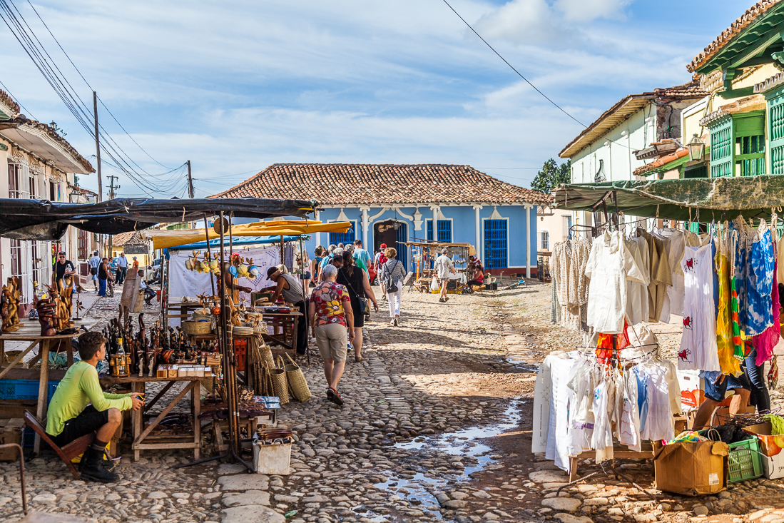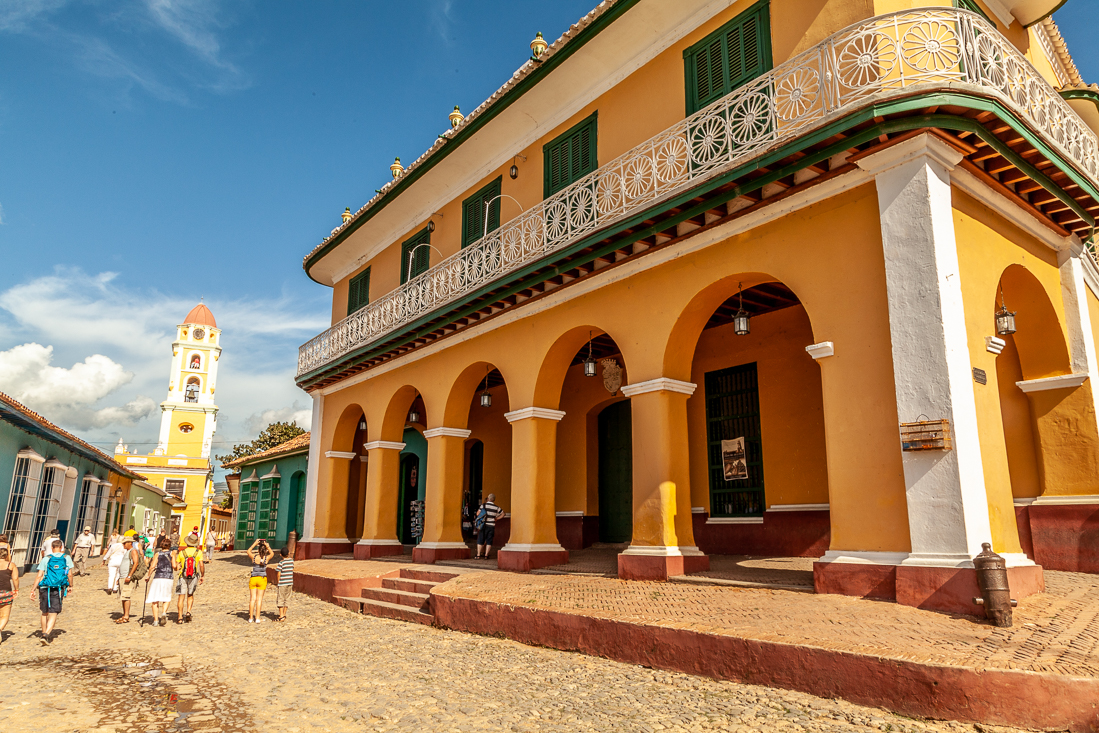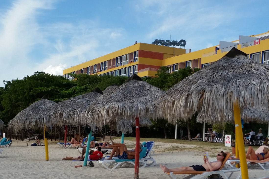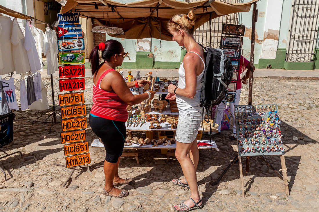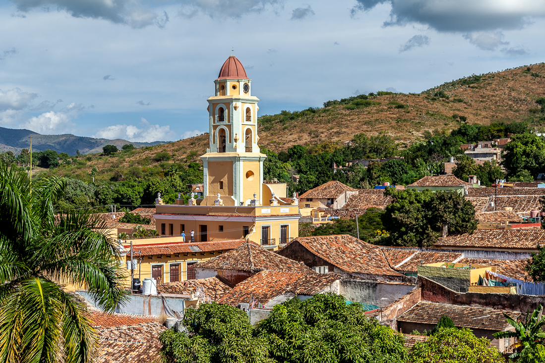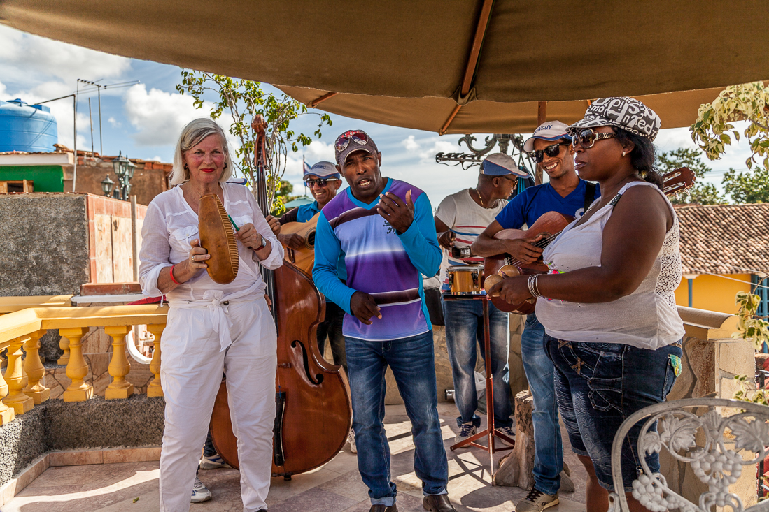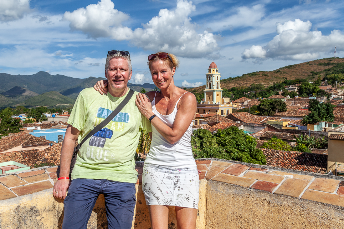 Da's lekker, een paar dagen niet de koffer inpakken. Na een uitgebreid ontbijt wél weer de bus in om Trinidad te verkennen. Eerst samen met Iovanni de bekende straatjes en pleintjes bekijken en dan in de Canchanchara Bar een heuse Canchanchara koffie drinken, natuurlijk aangelengd met een druppie rum. Ook hier weer live muziek door een salsaband met cd én mandje. Na een bezoek aan een markje kregen we even 'vrij' om zelf het stadje te verkennen. Samen met Lisette en Josje zijn we op verkenning gegaan. Eerst maar eens de toren van het Historisch Museum beklimmen om van het uitzicht te genieten. Josje vond het beneden al mooi genoeg. Daarna het halve centrum doorgewandeld en met grote dorst terecht gekomen op het dakterras van een gezellig eetcafé. En ja hoor, ook hier weer een band met cd én mandje. Het duurde niet lang voordat Josje deel uitmaakte van de ritmesectie van de band. Alles voor een betergevuld mandje... Daarna richting bus, die ons bij het hotel dropte voor de lunch en een vrije middag aan het strand! Het was even zoeken naar een ligbedje dat niet stuk was. Tjonge, dat was lekker.
