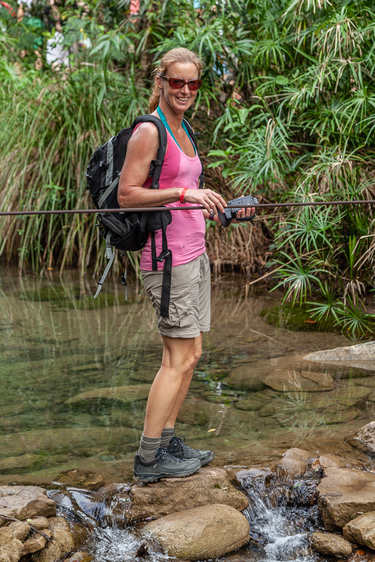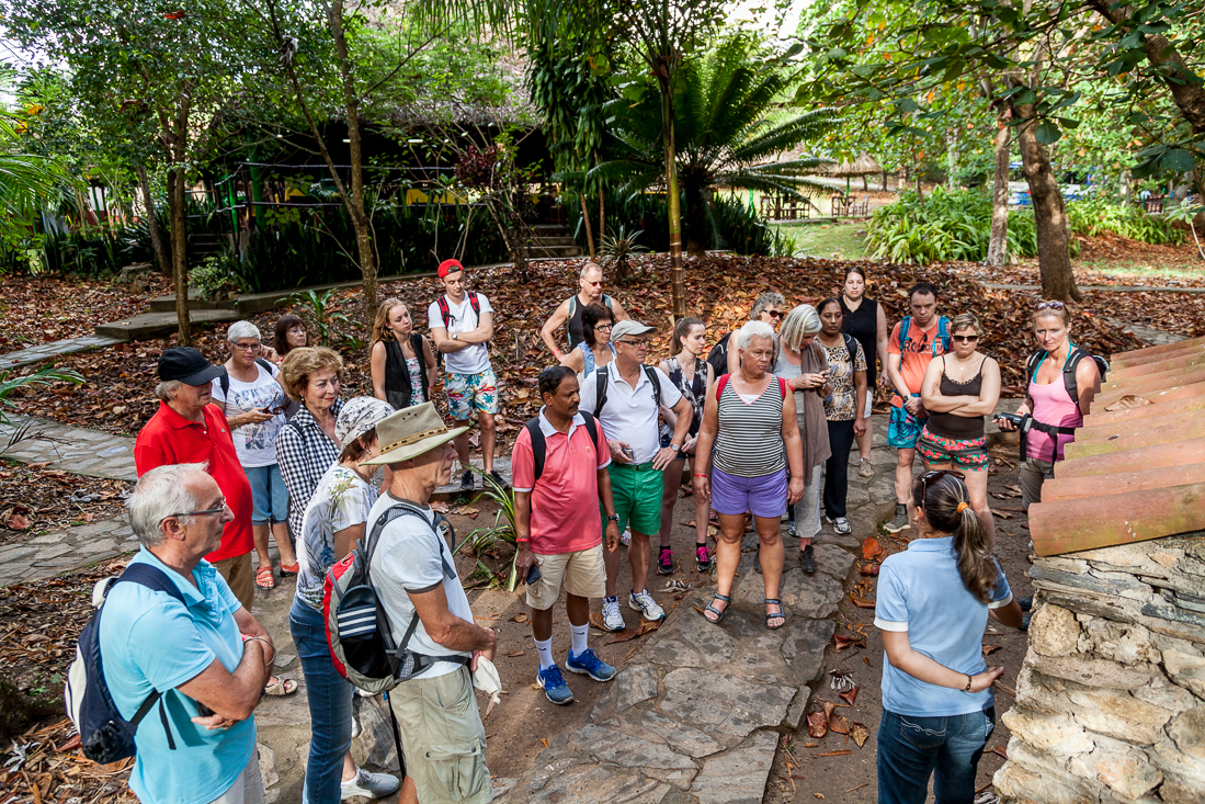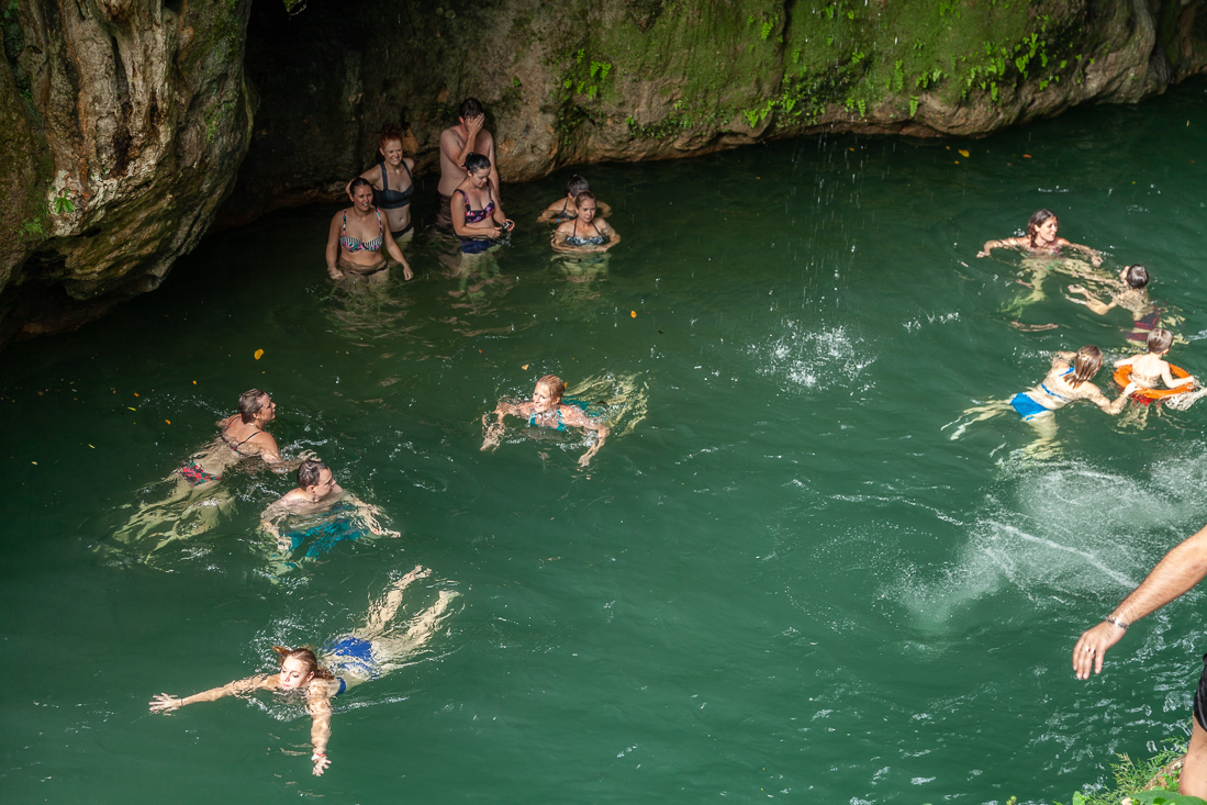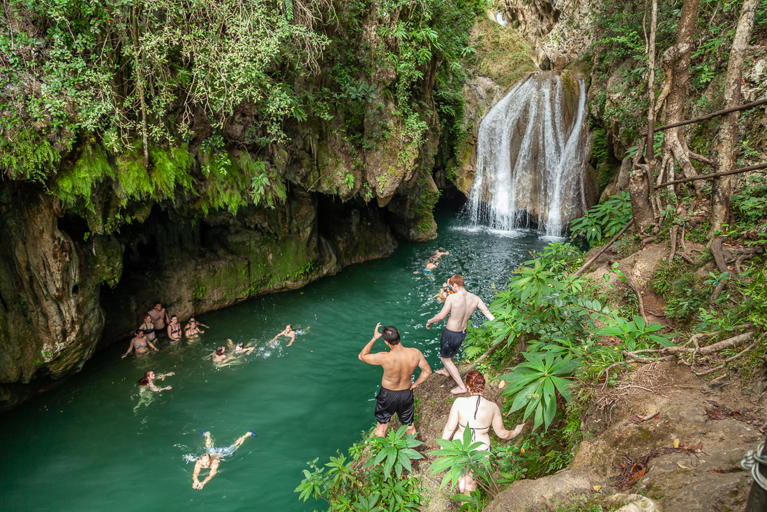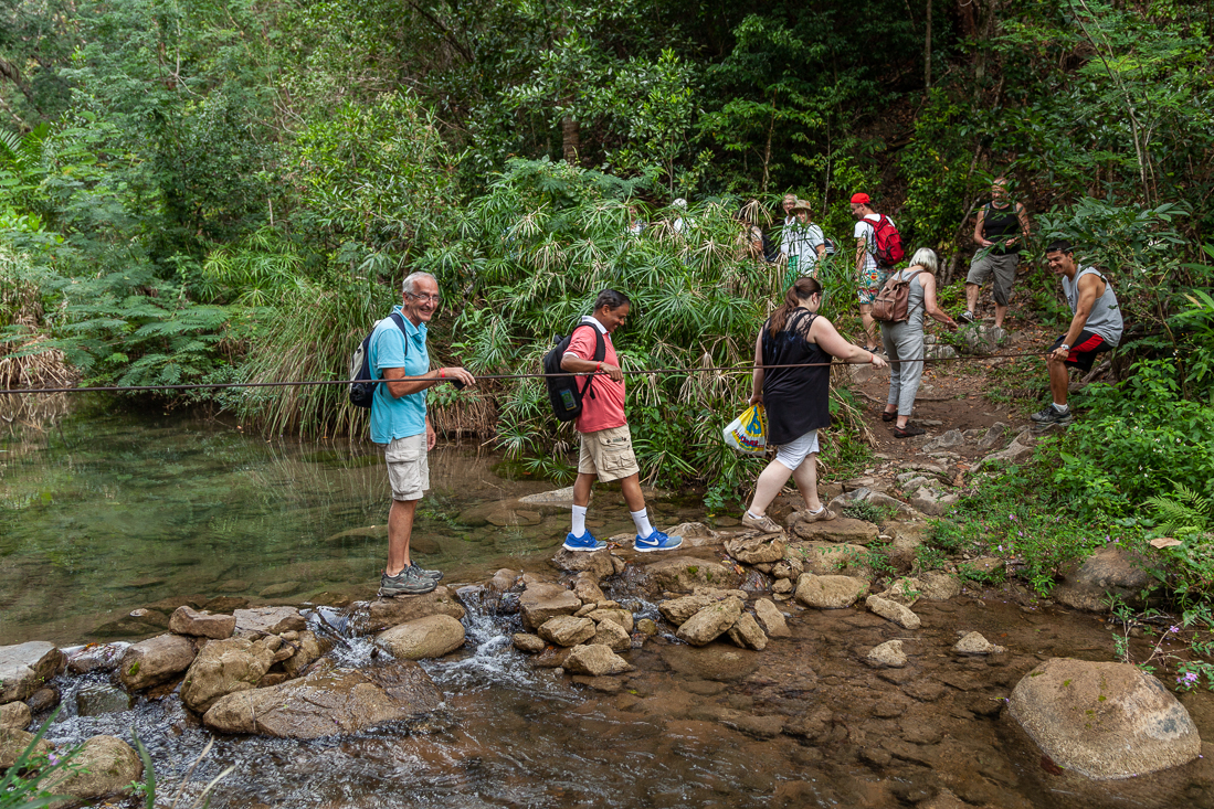 De laatste dag in Trinidad alweer. Vandaag zouden we een wandeling maken in het natuurpark El Cubano. De entree van dit natuurpark bleek niet heel ver van Trinidad verwijderd. Onder leiding van een gids begonnen we aan de wandeling door het mooie jungle-achtige gebied, terwijl ze ons regelmatig wees op bijzondere begroeiing en andere zaken. Onderweg werd ons bij een Cubaanse boerdertje een bijzondere thee aangeboden, die ik maar even heb overgeslagen, maar volgens iedereen héél goed smaakte. De wandeltocht bracht ons uiteindelijk bij een schitterdende waterval, waar gezwommen kon worden. Een groot deel van de groep lag dan ook even later te spartelen. Vervolgens wandelden we hetzelfde stuk weer terug naar de ingang en de bus bracht ons snel weer naar het hotel voor de lunch. Vandaag scampi's op de bakplaat en dan niet een paar, maar een bord vol voor de liefbebber. Verwennerij! De rest van de middag heerlijk aan het strand gelegen, totdat het rond een uur of vijf zó hard ging waaien, dat je letterlijk gezandstraald werd! Uiteindelijk begon het ook nog eens als een idioot te regenen. Na het diner nog maar even rondgehangen bij de winderige buitenbar en bijtijds (nou ja, bijtijds) naar de kamer om de koffer weer te fatsoeneren en in te pakken.