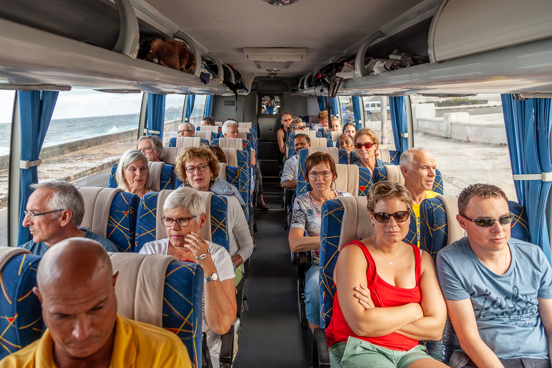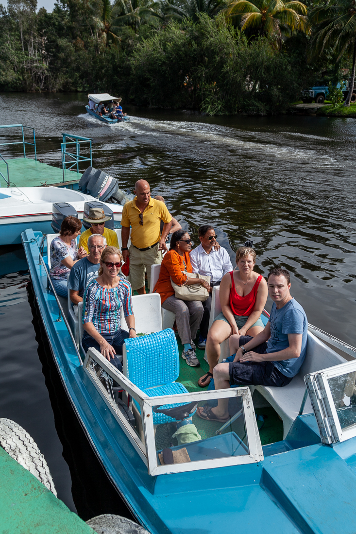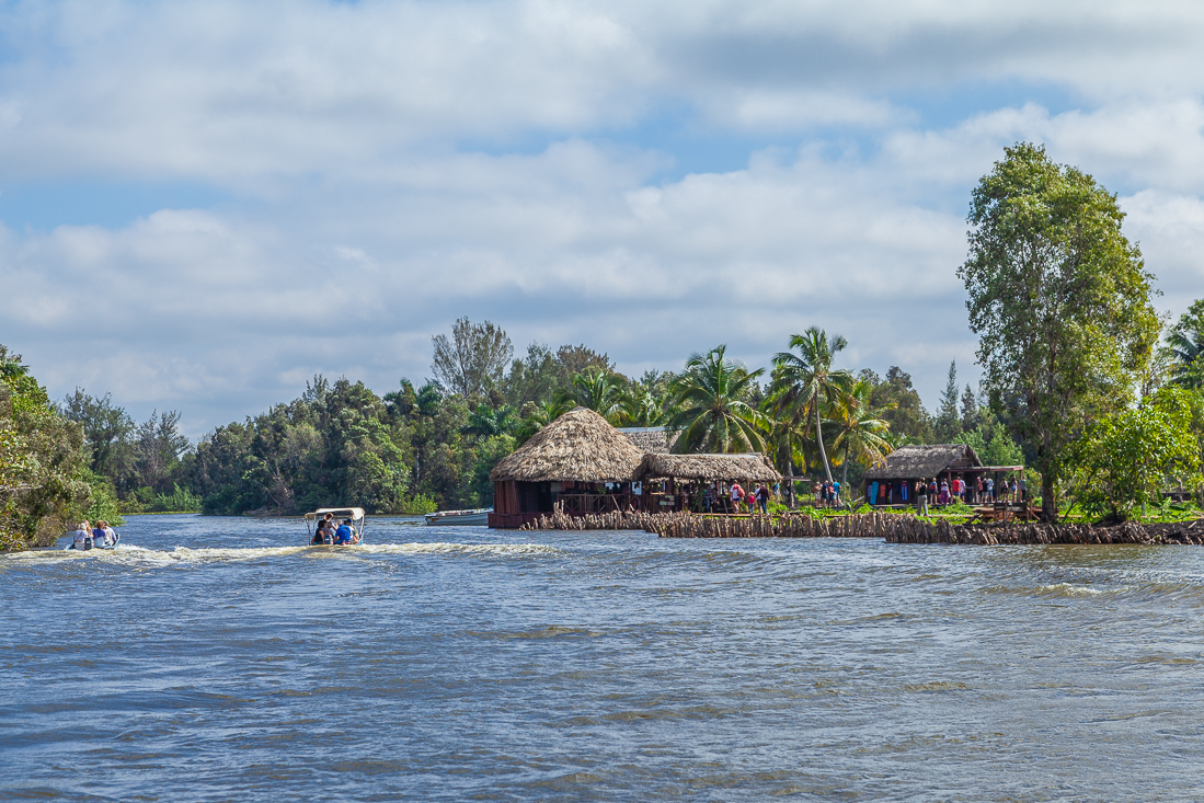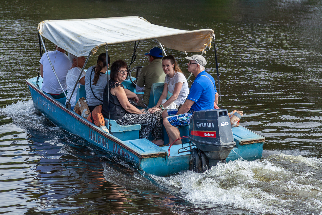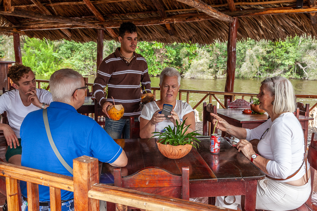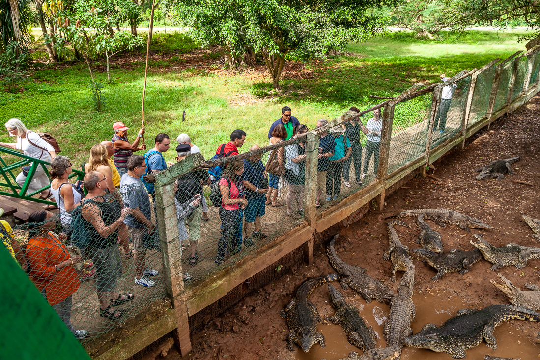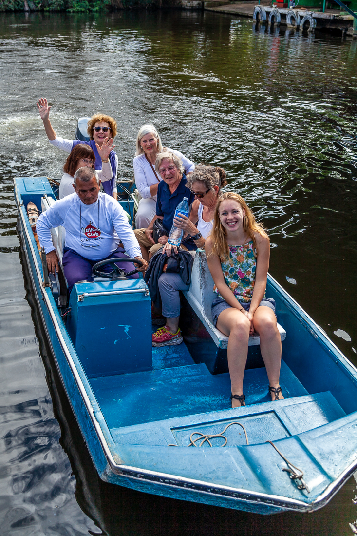 We moesten weer even wennen aan de koffers buiten zetten. Ook moesten we wennen aan onze nieuwe gids Eduardo, die al bij de bus stond te glimmen. Natuurlijk hetzelfde ritueel, koffers checken, koppen tellen en op weg. Vanaag naar de hoofdstad La Habana, ofwel Havana. Onderweg een bezoek aan de krokodillenfarm van Guamá en aansluitend een boottocht. Aangekomen bij de krokodillenfarm deed de zon intussen weer z'n uiterste best om de boel op te vrolijken. Na een snelle ronde over de farm, waar we krokodillen in alle formaten konden zien en een enkeling ze zelfs mocht voeren met een stuk kip aan een hengel, was het tijd voor de boottocht over het Laguna del Tesoro naar het park rondom het Hotel Guamá. De snelle boottocht over het meer was spectaculair, alleen vragen we ons nog steeds af wat we daar moesten doen. Een rondje lopen over hardhouten vlonders, door een rieten hut rennen en beschilderd worden door imitatie-indianen en kijken naar de beeldhouwwerken van een bekende Cubaanse kunststenares. Voordat we het goed en wel in de gaten hadden zaten we alweer in de boot terug naar het beginpunt. Het goede nieuws daar was dat de lunch klaar stond. Sommigen kregen het tegen bijbetaling de bestelde portie krokodillenvlees. Dat wordt oppassen geblazen. En natuurlijk weer muziek.
