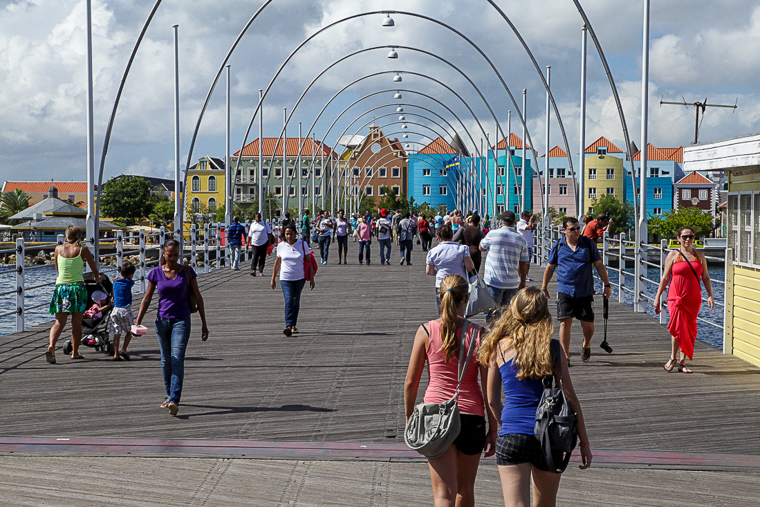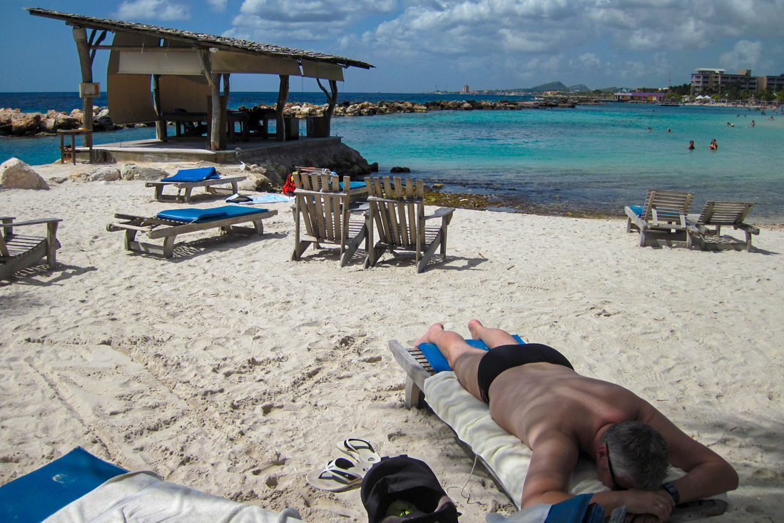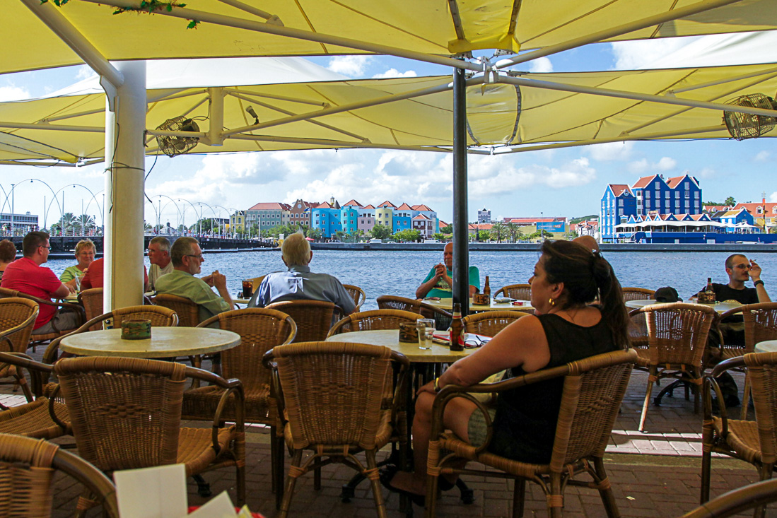 Na wat snelle (nou ja, snel..) inkopen uitgebreid ontbeten en daarna al wat bijgekleurd op ons heerlijke strandje. 's Middags om 14.00 uur in de shuttlebus naar Willemstad gestapt en heerlijk geluncht op een terrasje aan de Handelskade met uitzicht op de wereldberoemde pontonbrug. Hierna het kleurige centrum verkend en om 17.00 uur terug naar het hotel. Tijdens het pre-diner-biertje op het terrasje voor onze kamer kwam opeens een bekende van ons voorbij wandelen. Eric Borninkhof was een paar dagen op Curaçao om lekker uit te waaien op de mountainbike. Zijn kamer was twee deuren verderop ....