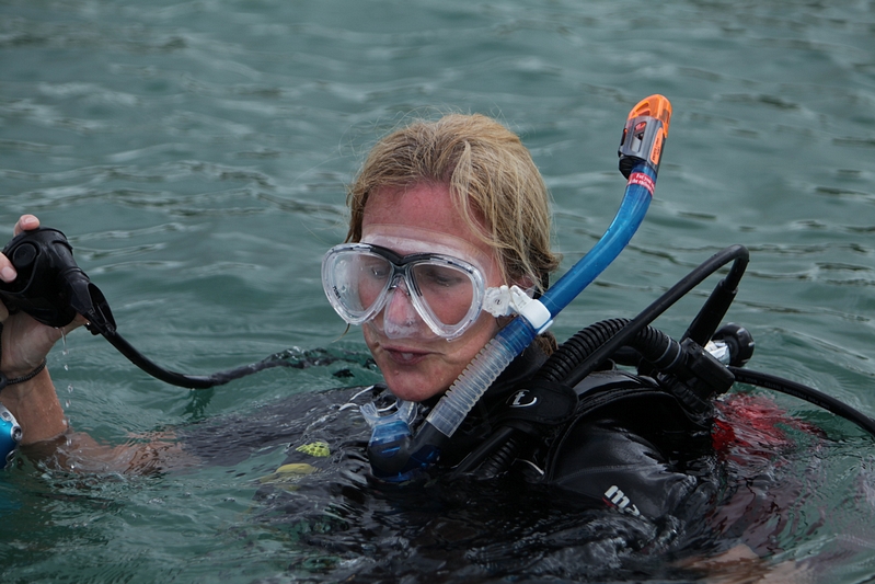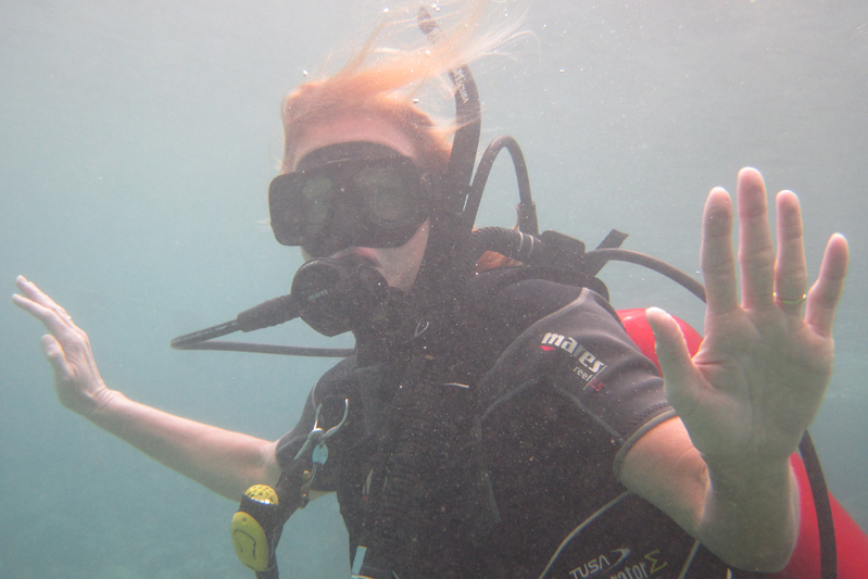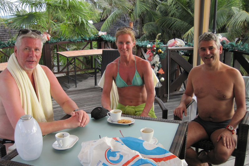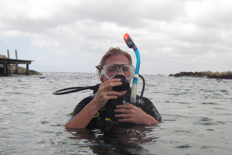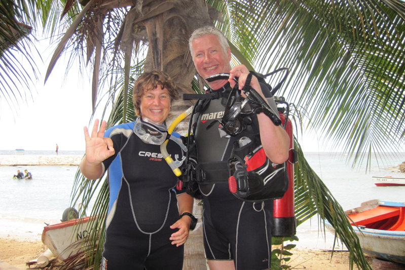 Donderdagochtend nog even snel met onze Daaihatsjoe naar de supermarkt gereden om de laatste inkopen te doen. Iets na negenen zou ons wonder-op-wielen alweer opgehaald worden. Vervolgens snel naar de lobby om het duikcentrum te bellen, zodat ze ons konden ophalen. Na een uitgebreide koffiesessie werd het tijd om de (duik)pakken te passen. Agnes begon met een uitvoerige instructie door Johan en Monique ging samen met mij het water in voor het snorkelen mét fles. Monique nam werkelijk alle tijd en straalde zoveel rust uit, dat het mij binnen de kortste keren lukte om de mooie onderwaterwereld te bekijken. Bij terugkomst vertrok Agnes samen met Johan voor haar introductieduik. Superenthousiast vertrokken we weer richting hotel, maar niet voordat Agnes nog een duikafspraak had gemaakt.