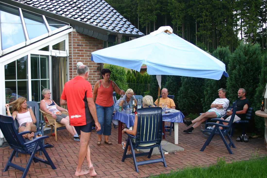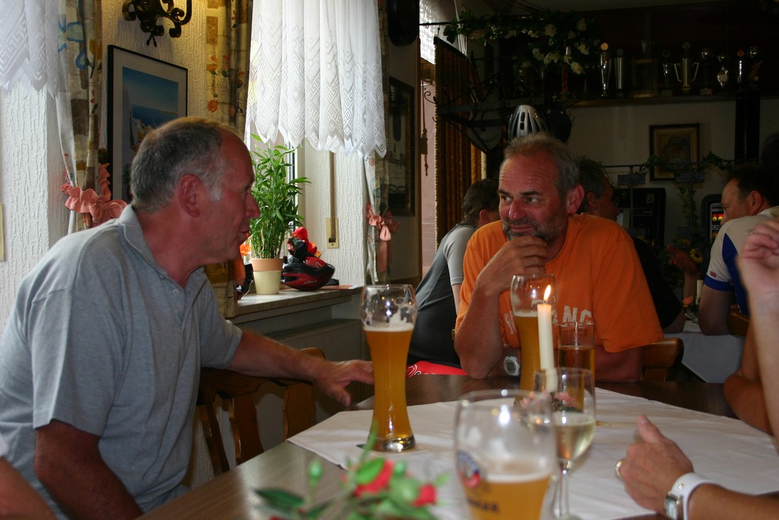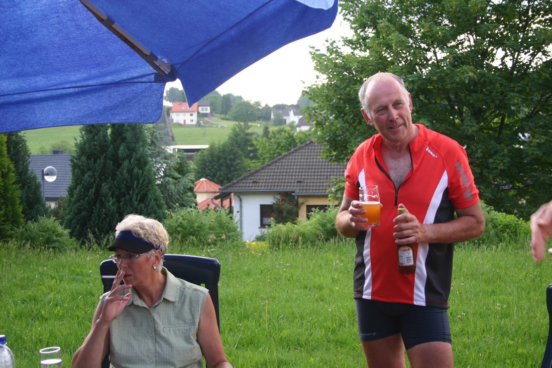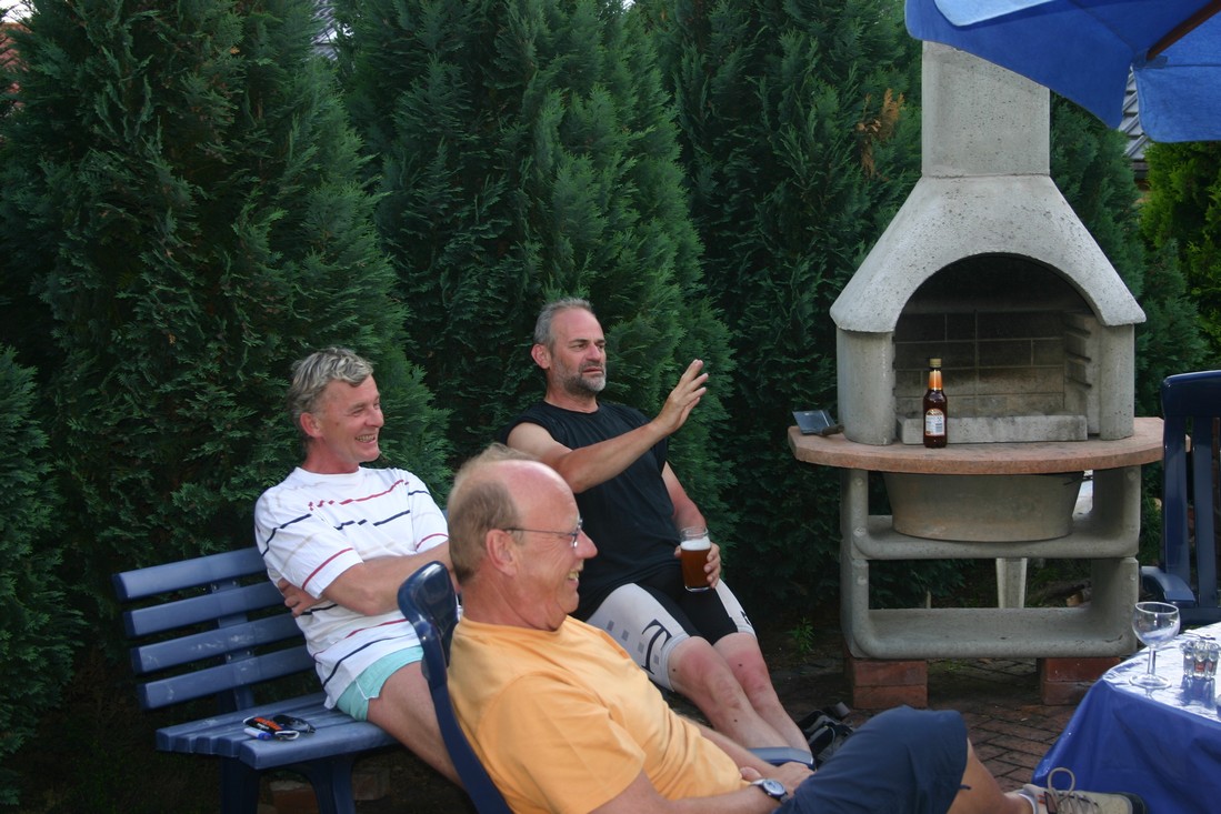 Eerst de inkopen en bagage uitgepakt, de slaapkamers verdeeld en niet onbelangrijk, de koelkast aangedaan. Hierna maar eens de tuinstoelen ingebruik genomen en een heerlijk koud biertje uit de koelbox gevat. Om een uur of halfzes kwamen met een hoop lawaai Gitte, Eberhard en Karl de straat binnenfietsen. Zij hadden de afgelopen week gebruikt om een prachtige tocht te maken van Altbach naar Neuheilenbach. Met de nodige slingertjes stond de totaalafstand op 580 km. Een koude Hefeweize ging er dan ook soepeltjes in. Nu misten we alleen nog Norbert en Heide, die onderweg waren van Bremen naar Neuheilenbach.
