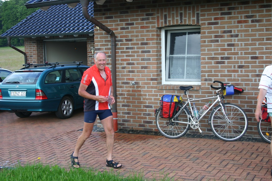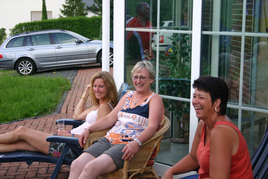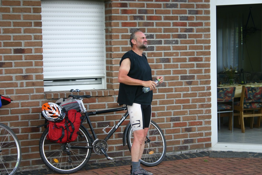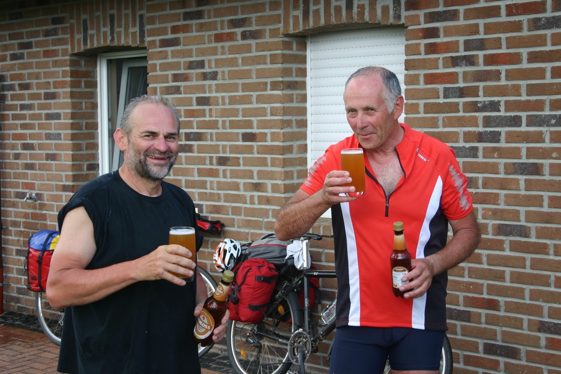 Eerst de inkopen en bagage uitgepakt, de slaapkamers verdeeld en niet onbelangrijk, de koelkast aangedaan. Hierna maar eens de tuinstoelen ingebruik genomen en een heerlijk koud biertje uit de koelbox gevat. Om een uur of halfzes kwamen met een hoop lawaai Gitte, Eberhard en Karl de straat binnenfietsen. Zij hadden de afgelopen week gebruikt om een prachtige tocht te maken van Altbach naar Neuheilenbach. Met de nodige slingertjes stond de totaalafstand op 580 km. Een koude Hefeweize ging er dan ook soepeltjes in. Nu misten we alleen nog Norbert en Heide, die onderweg waren van Bremen naar Neuheilenbach.