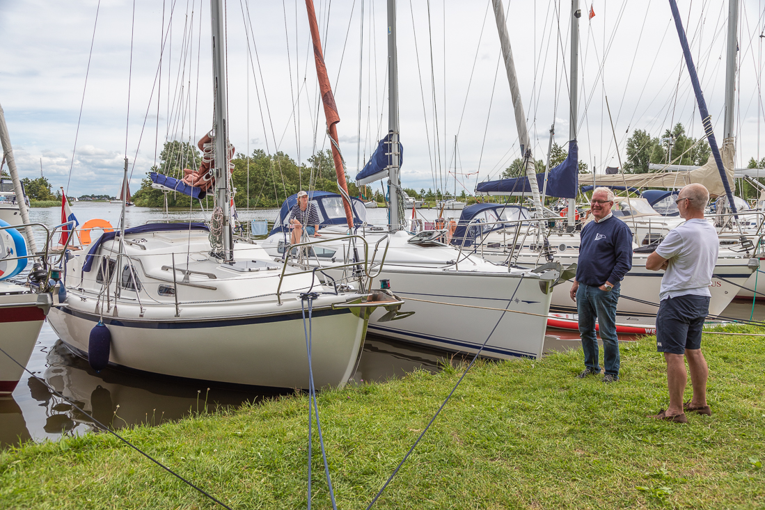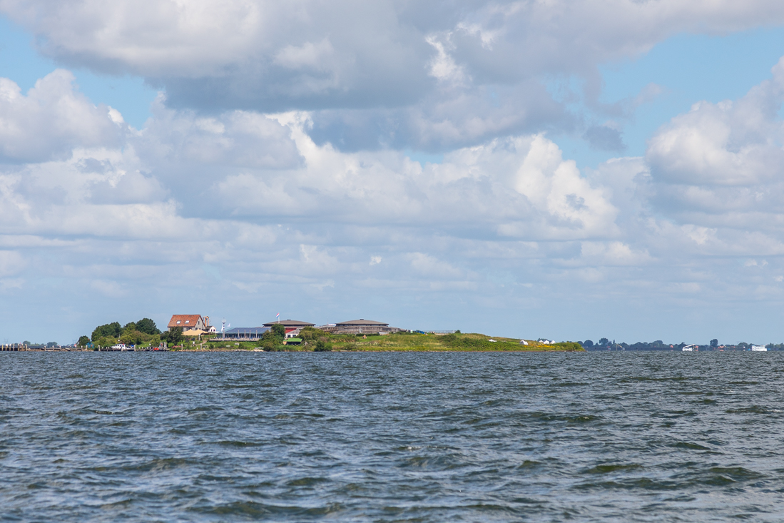 Woensdag lekker rustig aan gedaan en na het late ontbijt over de Fluessen naar een groot hoefijzervormig eiland gezeild, waar we Henks kennissen Pieter en Judith zouden ontmoeten. Er bleek in de overvolle binnenhaven van het eiland nog een plekje vrij te zijn naast de "Bever" van Pieter en Judith. De rest van de middag genoten van de rust en het heerlijke zonnetje. Henk zou vanavond koken. Hij rukte het plastic van de maaltijdsalade en hoppa, aanvallen! Een koud biertje uit eigen koelkast maakte dit 3-sterren maal compleet. Eenmaal in de kooi bleek dat wij niet de enigen waren die het naar ons zin hadden op het eiland. Massa's muggen hadden het ook ontdekt. En als je dan de horren niet in de deuropening schuift... Het bleef nog lang gezellig.