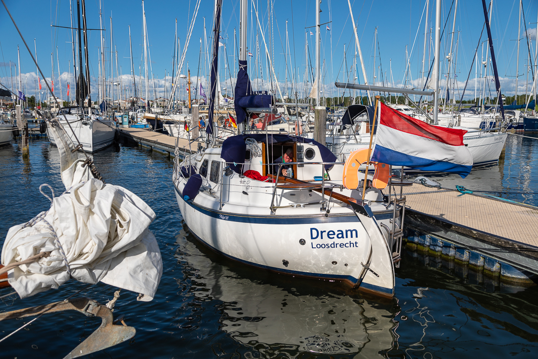 Wat een pech voor Henk z'n vrouw Margo. Door haar knieblessure konden ze niet samen met de "Dream" op vakantie en kreeg ik een telefoontje van Henk of ik een weekje mee wilde zeilen. Daar hoefde ik niet zo hƩƩl lang over na te denken natuurlijk. Zondags kwamen we met de motor terug van ons uitstapje naar de Moezel en hoefde ik alleen maar de tandenborstel te verhuizen naar een andere tas. Maandag de 20e dropte Agnes mij mƩt m'n spulletjes in Muiden, waar Henk alvast naar toe was gevaren vanaf Loosdrecht. Na een kopje koffie vertrokken we richting IJsselmeer. Met een heerlijk windje zeilden we een ererondje om Pampus en zetten koers naar Lelystad. Naarmate Lelystad dichterbij kwam, werden de korte golven hoger en kwam de wind uit een vervelende hoek. Dus het laatste stuk maar op de motor gevaren. NƩt na de Houtribsluis aangemeerd bij Deko Marine. 's Avonds heerlijk gegeten bij het restaurant op de jachthaven bij "je&jij". We gaven de jonge medewerker deze naam omdat hij werkelijk iedereen tutoyeerde.... Na deze winderige dag Ʃn het kleine biertje werd het niet laat.