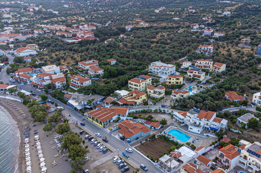 Vrijdag 2 juni 2023 Als je om 06.05u vliegt, betekent dat automatisch een korte, héél korte nacht. Nog wel een poging gedaan om heel even te slapen, maar dat draaide op niets uit. Ineens was het 02.15u en stond de taxi mét Hanneke en Louk al voor de deur. Gelukkig was de taxichauffeur wél wakker en bracht ons veilig naar Schiphol, waar we natuurlijk veel de vroeg aankwamen. Snel de koffers in de automaat gepropt en nog sneller door de security gewandeld. Eerst maar eens een flinke bak koffie gescoord, met natuurlijk traditiegetrouw een saucijzenbroodje voor Louk. Uiteindelijk maar eens naar de gate gehobbeld, waar we verder hebben zitten suffen, tot het tijd werd om te boarden. En als je 1 van de eerst vertrekkende vluchten bent, dan is er ook nog geen vertraging. Dus hoppa, daar gingen we iets na zessen, op naar Samos. Het eerste deel was nog flink bewolkt, maar al snel werden de uitzichten beter en beter, waardoor ook de tijd weer sneller leek te gaan. Eenmaal geland op Samos kwamen de koffers razendsnel de band op en iets later vonden we busje 3, waarmee we naar Agrilionas Beach Hotel in Votsalakia werden vervoerd. Na een prachtige rit door het bergachtige gebied reden we Votsalakia binnen en bij de 3e stop mochten wij er uit. Na een hartelijk welkom door Angeliki Antonakaki en nog wat papierwerk, bracht zij ons naar onze appartementen. Hanneke en Louk 'bleven steken' op de eerste verdieping en wij gingen een trapje hoger naar appartement 33, dat bleek te beschikken over een heerlijk groot balkon, met zeezicht. Hoogste tijd om wat te eten en zo liepen we iets later door de hoofdstraat en vonden bij Taverna Kamara een perfect plekje op het terras. Dat het intussen wat harder begon te regenen maakte niemand wat uit. Wij hadden immers onze calamaris én het koude Mythosje.... De rest van de middag ging ieder wat voor zichzelf doen en troffen we elkaar later in de middag op ons balkon (terras 3). 's Avonds nog een kleinigheid gegeten bij Kleopatra Taverna op steenworpafstand van ons appartement. Na een zeer korte nazit héél vroeg in bed gestapt om wat slaap in te halen.
