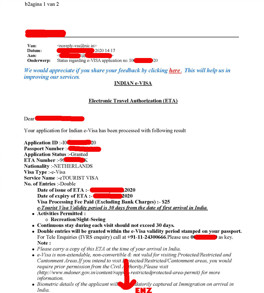 En als het goed is krijg je binnen enkele dagen dit emailbericht met de application status: 'Granted' (toegekend). Je mag naar India :-) | ||