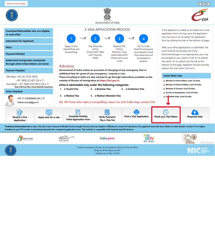 Nu nog de laatste belangrijke stap. Ga weer naar de e-VISA website en klik op: 'Check your Visa Status'. | ||