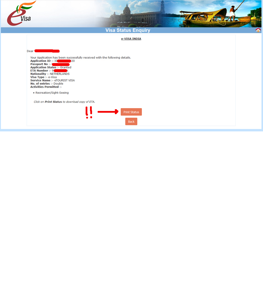 Klik in dit scherm op: 'Print Status' om je e-visum te downloaden/printen. | ||