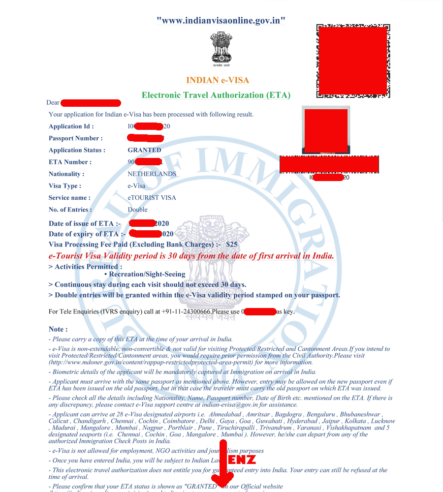 En zo moet je Indian E-visa er dan uitzien. Dus mƩt watermerk, pasfoto en QR-code. Printen en niet vergeten mee te nemen naar India!! Goede reis..... | ||