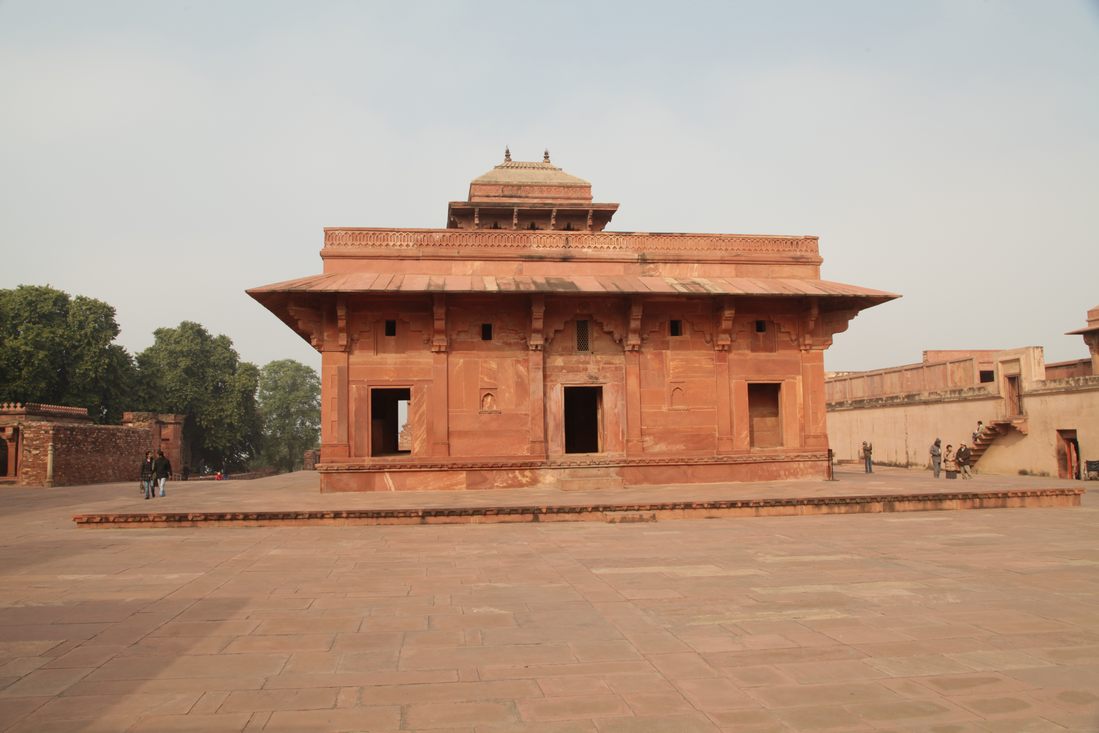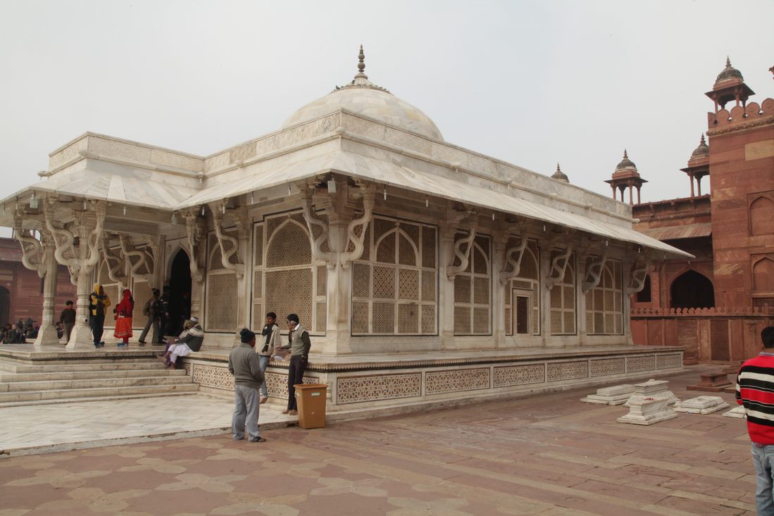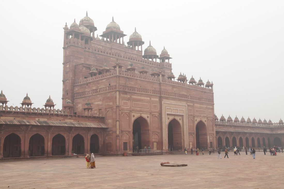 Vandaag zou ook weer een extra lange dag worden door het bezoek aan de 'verlaten' stad Fatehpur Sikri. Na het bouwen van de stad door de Marahadja bleek drinkwater te ontbreken en bleef de stad daardoor onbewoond. Bij aankomst in dit hooggelegen dorp was het wel heel erg mistig en daardoor erg fris. Dus de jassen maar aangetrokken. Met een bus die in Nederland direct van de weg zou worden gehaald werden we naar de ingang van de stad vervoerd. Op de binnenplaats van de tempel moesten de schoenen uit. De enige die daar voor in was bleek Agnes. Brrrrrrr. Hierna werden we overgeheveld naar de broer van gids 1, die ons rondleidde in de oude stad. Gelukkig had deze gids goede contacten met z'n zonnegod, want al snel verdween de mist en deed de zon zijn best om het wat aangenamer te maken. Ietwat verkleumd doken we in de auto om onze reis riching Agra te vervolgen.