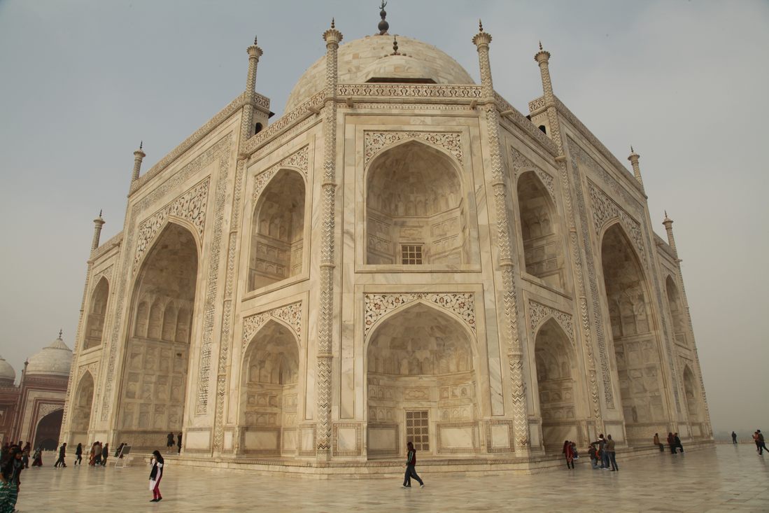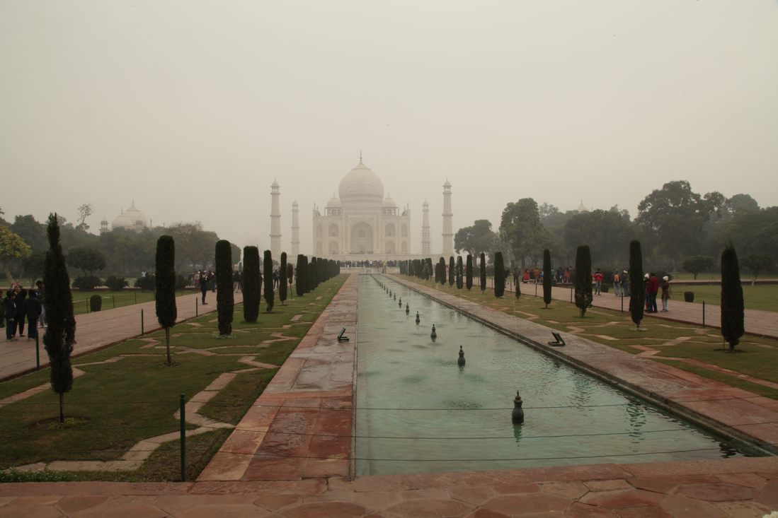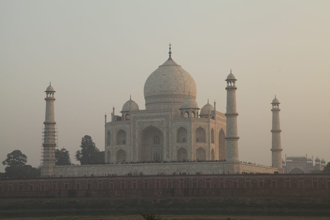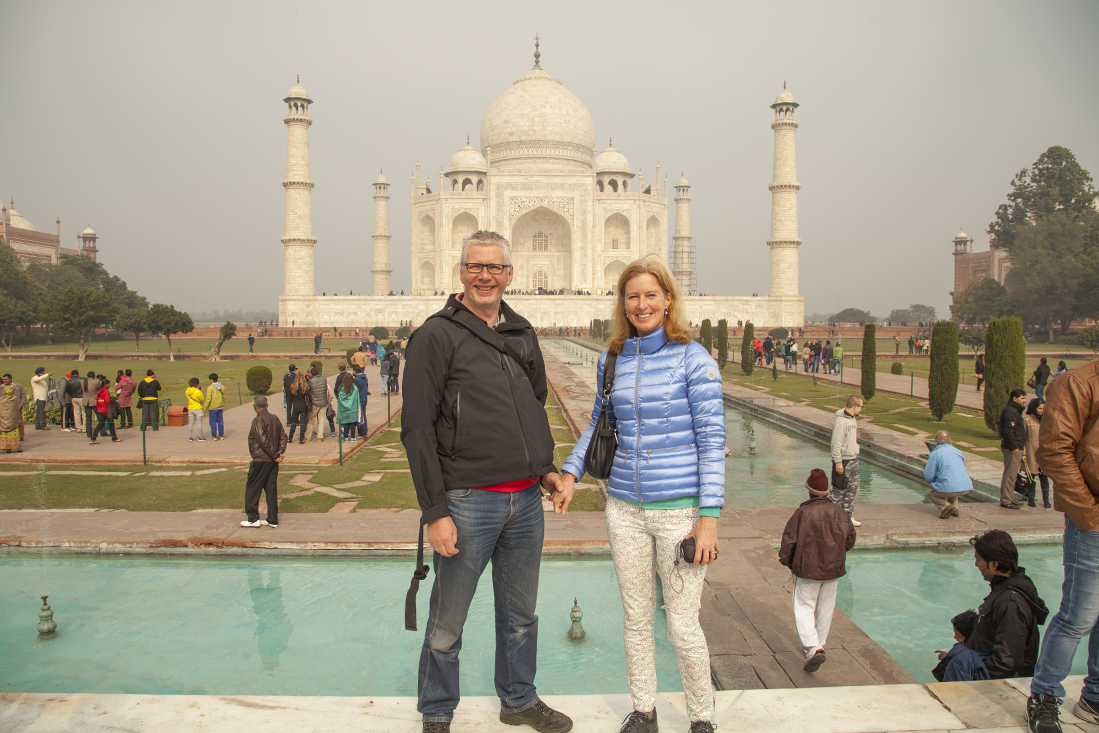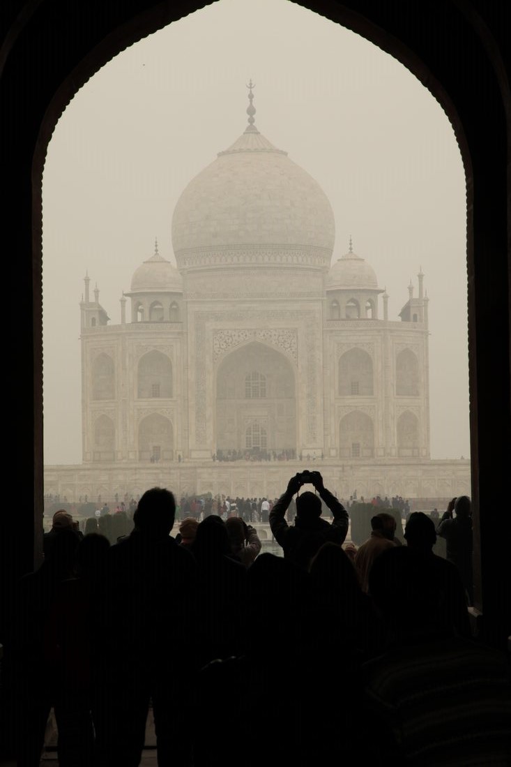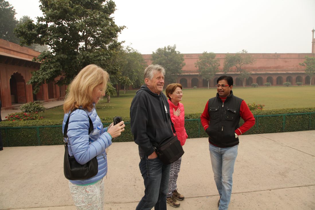 En ja hoor, vandaag is het zover. We gaan de Taj Mahal nu van heel dichtbij zien. De gids stond al bij de auto en we legden uit dat er eerst nog wat rupees gehaald moesten worden. De automaat was snel gevonden, maar het geld er uit krijgen een nogal ingewikkelde truc. Met instructies van de gids kwamen al snel de briefjes uit het prehistorische apparaat. Na het aanschaffen van de toegangskaarten namen we plaats in een soort verlengde golfkar en werden een kilometertje verderop er weer uitgeknikkerd. Na een uitgebreide toegangscontrole. Tassen open en fouilleren moest Louk z'n externe microfoon en ik de suctioncup van de GoPro in de kluis achterlaten. Waarom is ons nog steeds niet duidelijk. Maar we waren binnen en nog maar enkele honderden meters van de Taj Mahal verwijderd. Intussen bleef de gids maar heel veel praten en wij wilden door. Langzaam maar zeker kwam de toegang in zicht en daarmee de Taj Mahal. Helaas nog wel in de mist, maar die zou ietsje later nog plaats maken voor het zonnetje. Er stond ook nog een bezoek aan het Agra Fort op het programma. Inmiddels was de zon nog beter z'n best gaan doen en konden zelfs de zonnebrillen uit de tas.