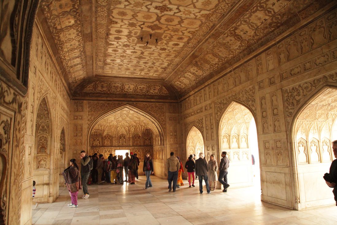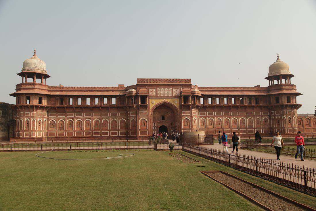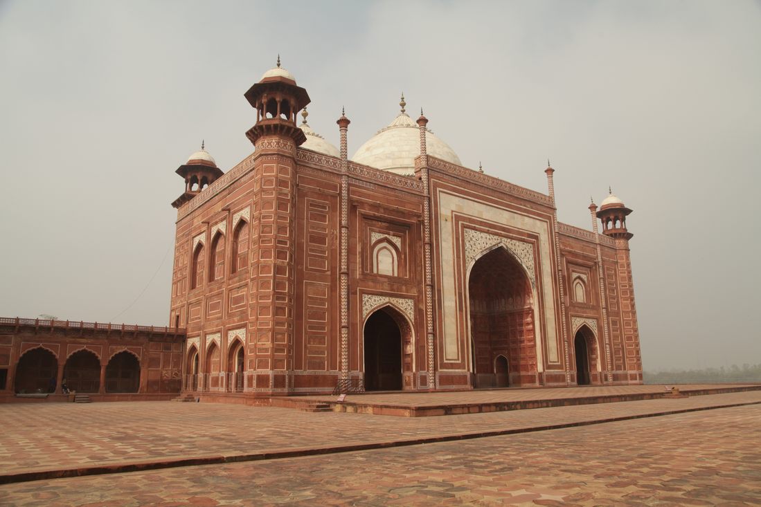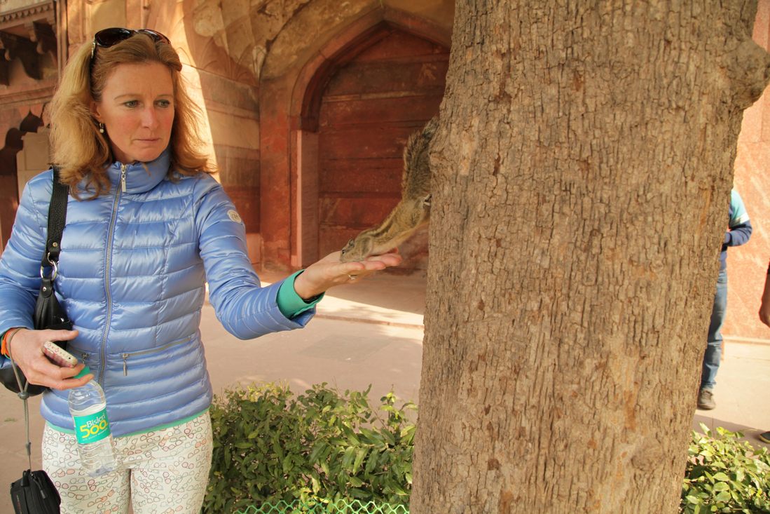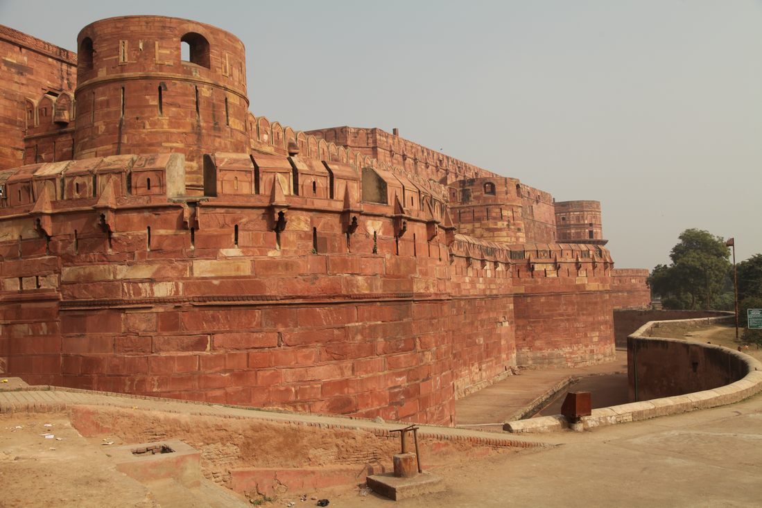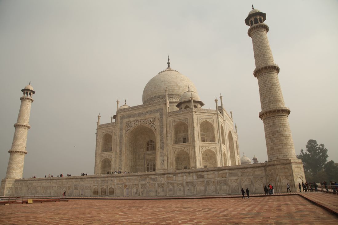 En ja hoor, vandaag is het zover. We gaan de Taj Mahal nu van heel dichtbij zien. De gids stond al bij de auto en we legden uit dat er eerst nog wat rupees gehaald moesten worden. De automaat was snel gevonden, maar het geld er uit krijgen een nogal ingewikkelde truc. Met instructies van de gids kwamen al snel de briefjes uit het prehistorische apparaat. Na het aanschaffen van de toegangskaarten namen we plaats in een soort verlengde golfkar en werden een kilometertje verderop er weer uitgeknikkerd. Na een uitgebreide toegangscontrole. Tassen open en fouilleren moest Louk z'n externe microfoon en ik de suctioncup van de GoPro in de kluis achterlaten. Waarom is ons nog steeds niet duidelijk. Maar we waren binnen en nog maar enkele honderden meters van de Taj Mahal verwijderd. Intussen bleef de gids maar heel veel praten en wij wilden door. Langzaam maar zeker kwam de toegang in zicht en daarmee de Taj Mahal. Helaas nog wel in de mist, maar die zou ietsje later nog plaats maken voor het zonnetje. Er stond ook nog een bezoek aan het Agra Fort op het programma. Inmiddels was de zon nog beter z'n best gaan doen en konden zelfs de zonnebrillen uit de tas.