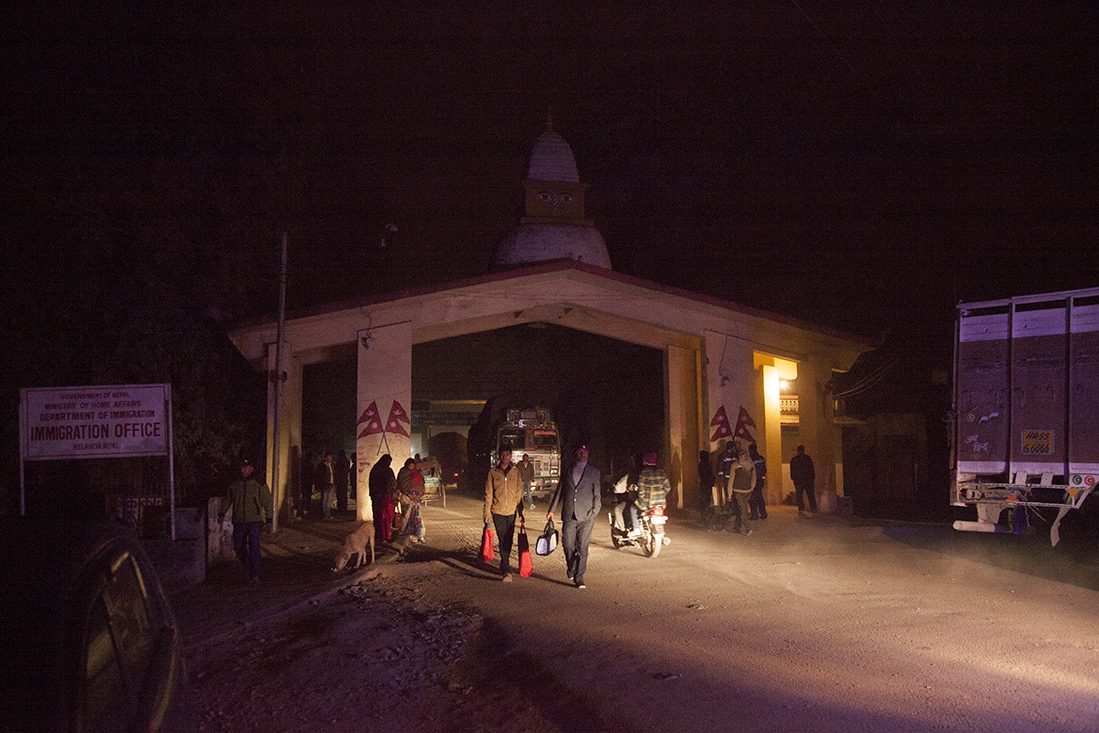 Het was al donker toen we de grens met Nepal bereikten. Pramoth had regelmatig contact met onze Nepale chauffeur over de afleverplek. Iets voor de Nepalese grens stopt Pramoth en maken we kennis met Deepen, die ons naar- en door Nepal zal rijden. Met hem staan er opeens ook een stuk of TIEN Indiase riksjapiloten te schreeuwen. Suitcase, suitcase..... !! Door uiteindelijk nog harder te schreeuwen twee van die mafkezen aangewezen om elk twee koffers te transporteren. Ook nu begrijpen we nog steeds niet waarom dit zo moest, we hadden de koffers met gemak zelf de grens over kunnen brengen.