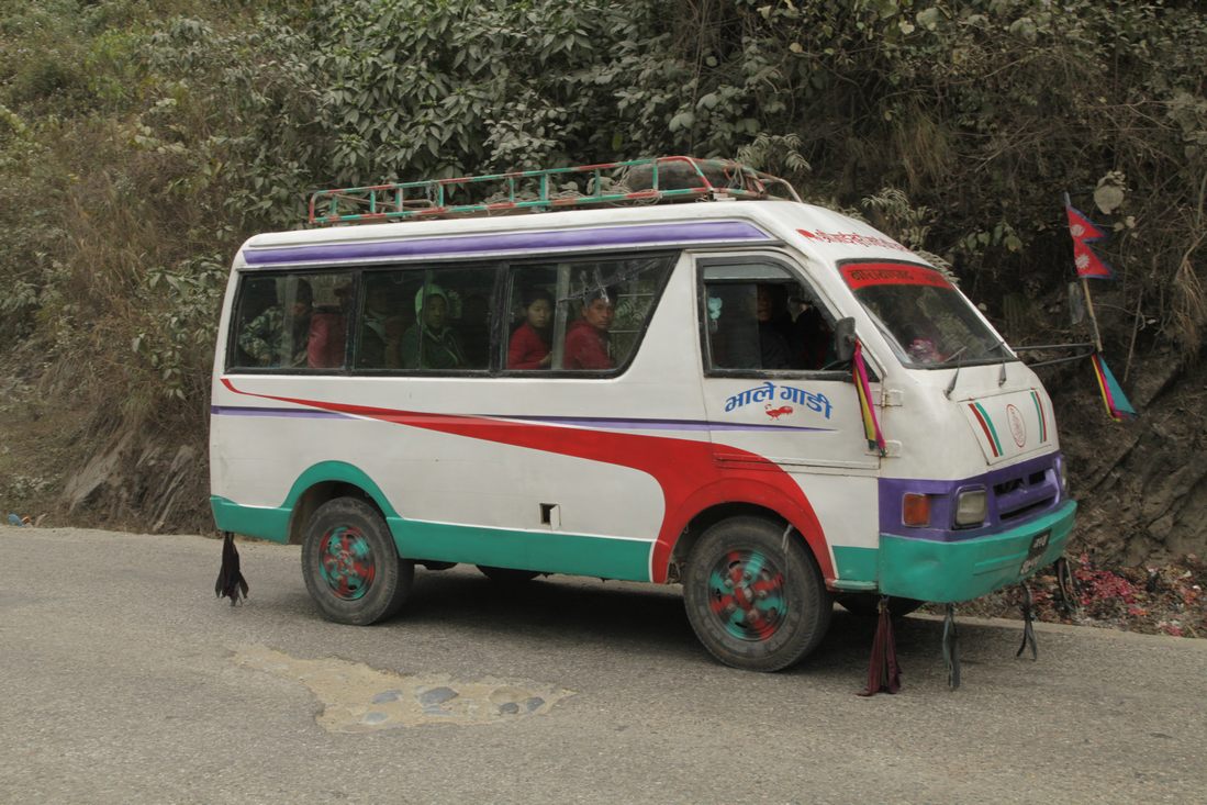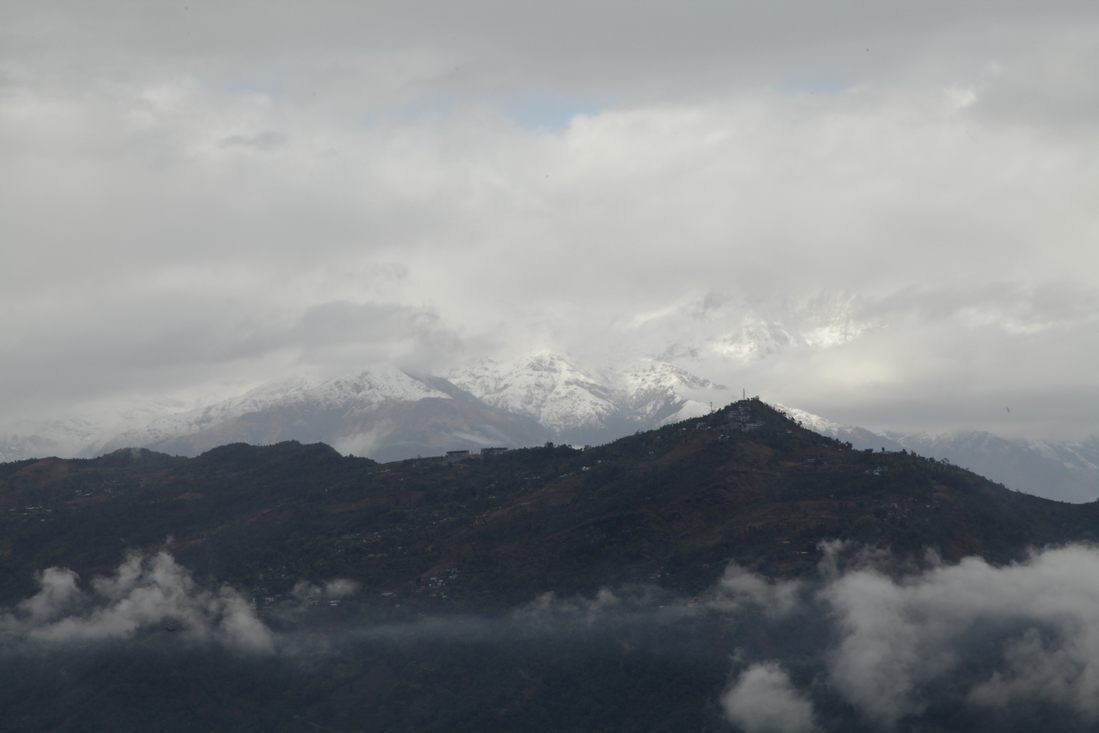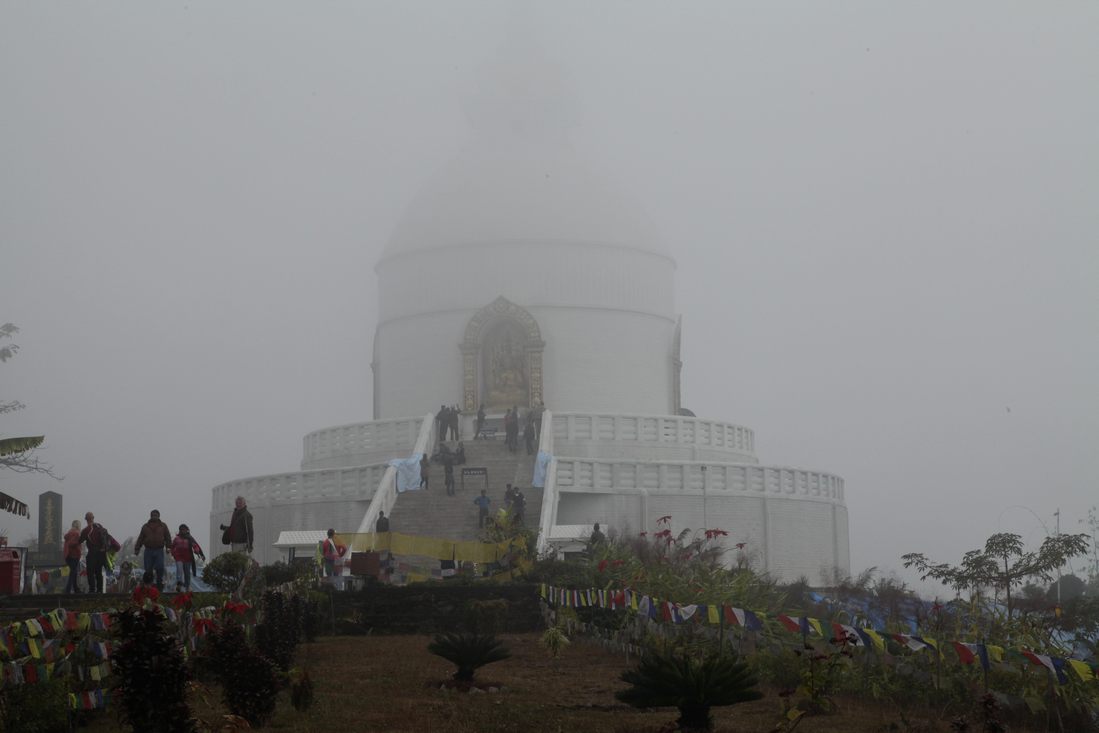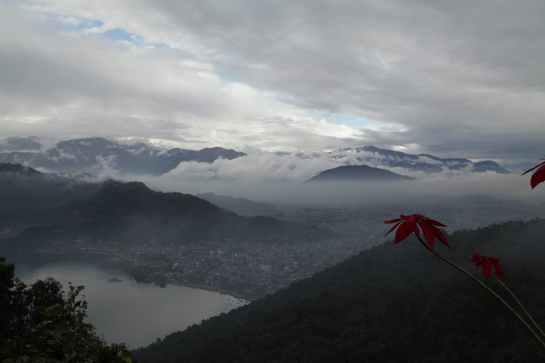 Al snel reden we weer door de mooiste landschappen en vergaten al even snel Green Mansion en een paar uurtjes later kwamen we aan bij het Mount Kailash Resort in Pokhara. Wat een schitterend hotel en midden in het centrum van Pokhara gelegen. Meteen maar eens de omgeving gaan bekijken. De volgende dag waren de bergen rond Pokhara nog steeds verstopt in de wolken, dus onze tour naar de World peace Pagoda wel vergeten. Tijdens de lunch breekt opeens het zonnetje door en besloten om ons snel naar boven te laten vervoeren. Eh, nu het vervoer nog. Buiten werden we al snel aangesproken door een plaatselijke taxichauffeur met een enorme Suzuki 1.100 cc. Kunnen we daar met z'n vieren bij Ʃn naar boven? De 1200 Nepalese rupees (ca. 10 euro) deden wonderen. Met onze reuze taxi even langs het hotel om het fototoestel op te halen en daarna de zeer slechte bergweg op. Zelfs 4-wiel aangedreven auto's redden het niet, maar onze wonderbaarlijk idiote chauffeur wel! Na het oprennen van de vele trappen hebben we precies een kwartier kunnen genieten van mooie uitzichten op de Himalaya, hierna kwam de mist weer opzetten. 's Avonds hebben we Louk z'n verjaardag gevierd en in het dorp een heerlijke curry gegeten.