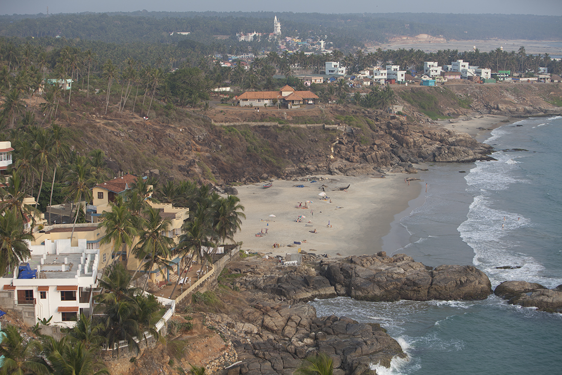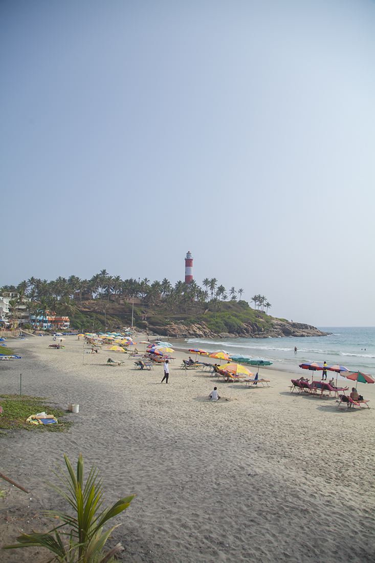 Op naar alweer de laatste bestemming van onze vakantie. Aangekomen in Kovalam blijkt zoeken nog steeds niet het sterkste punt van Baskar en hij rijdt de verkeerde kant van het dorp binnen. Maar dan vinden we toch ons hotel Soma Palmshore, vlakbij het bekende Lighthouse Beach. Nieuwsgierig als we zijn wilden we natuurlijk even een rondje op de boulevard maken en meteen maar even lunchen. Snel lieten we ons afzakken naar de boulevard en iets later zaten we op het terras van Coconut Grove ons tegoed te doen aan een lekkere lunch. Omdat ze geen biervergunning hadden kregen we het bier in een overmaats koffiebeker. Na de lunch de 'bult' weer op naar het hotel en net zo snel weer met de zwembroek naar het zwembad. Heerlijk!