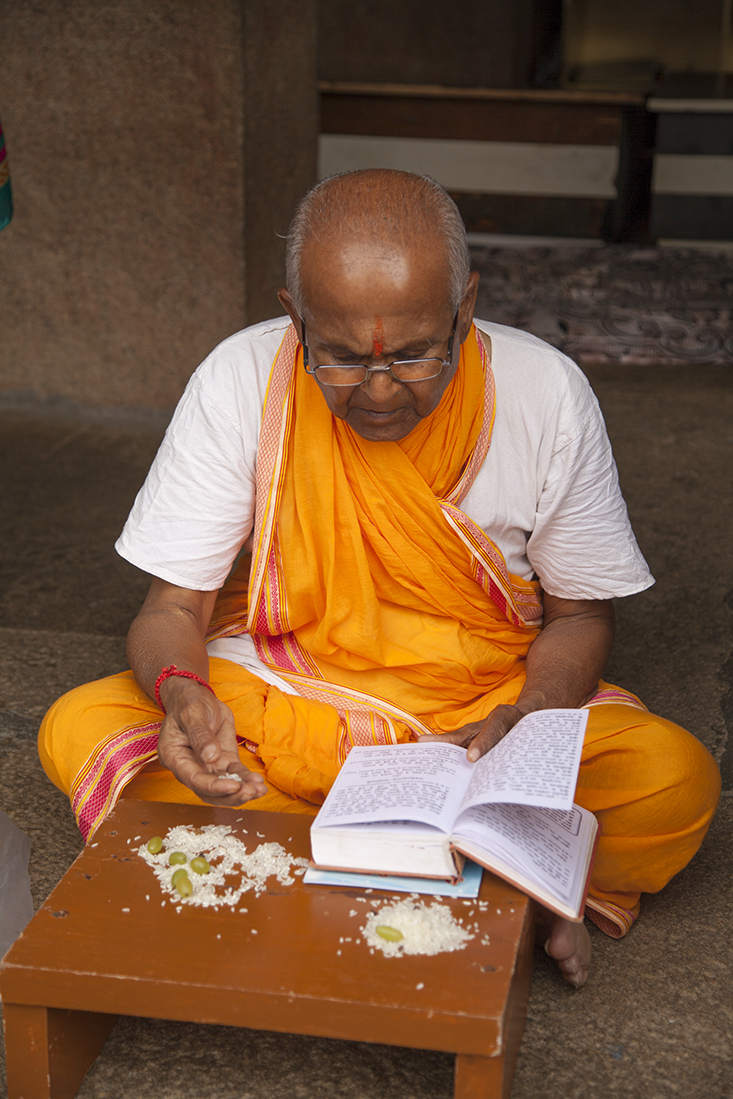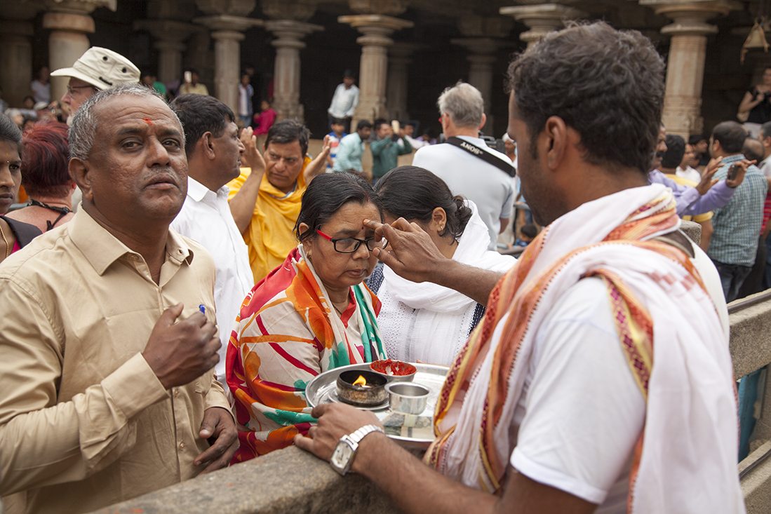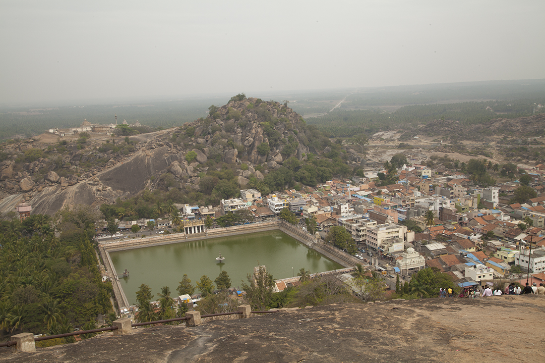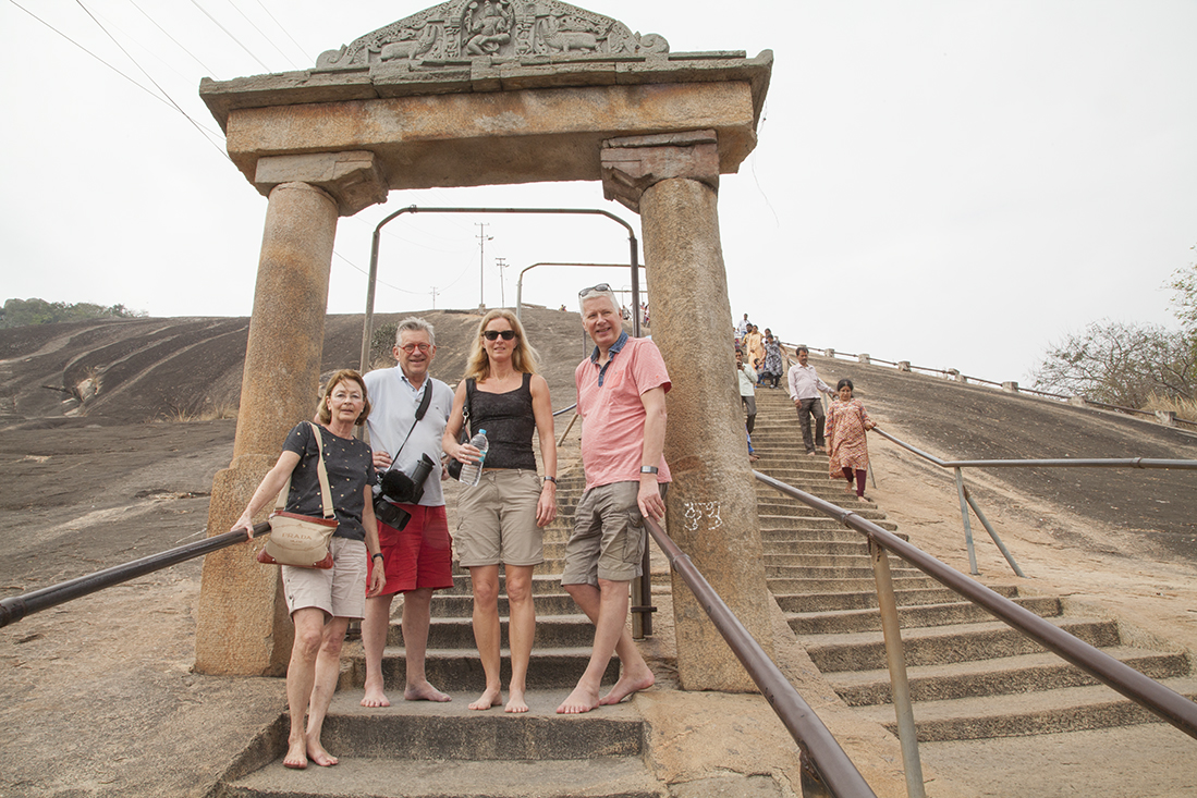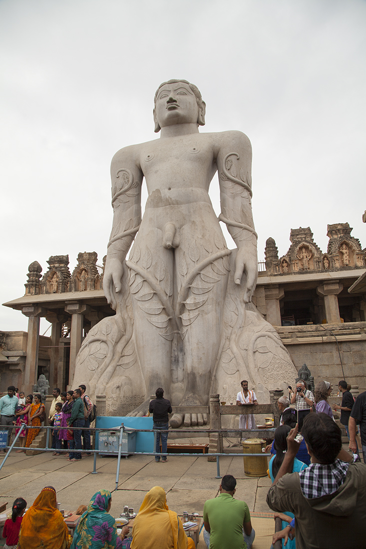 Prathap kwam vandaag iets later opdagen. Hij was gisteren weer terug naar huis gereden om daar te overnachten. Beter dan in de auto slapen. Dus snel de koffers weer in en op de auto en op weg naar Shravana Belgola. Jammer genoeg was het vandaag wat heiĆÆg, waardoor de uitzichten niet zo mooi zouden zijn. En daarvoor 600 treden op moeten! De schoenen hebben we meteen maar in de auto gelaten. Scheelt weer 'stallingskosten'. Na kennismaking met de gids gestart met de tocht naar boven. Zeshonderd treden later kwam het enorme, 17 meter hoge, standbeeld van Jain Sage Gomateswara in zicht en liet zowaar een waterig zonnetje zich zien. Was zeker de moeite waarde om naar boven te wandelen. Boven denken we aan neef Kees die hier 25 jaar geleden ook heeft gestaan. Na ons vergaapt te hebben aan de ceremonie en de ceremoniegangers lieten we ons weer de trap afzakken. Op naar Mysore.
