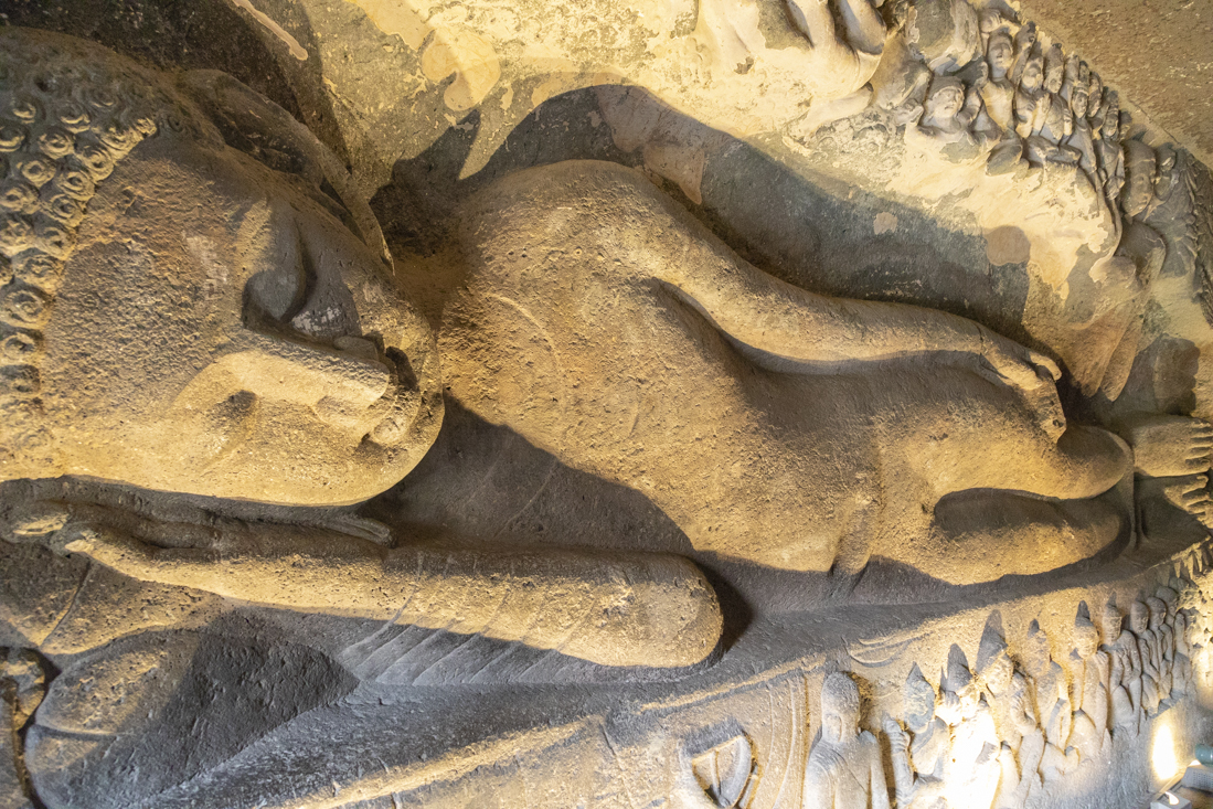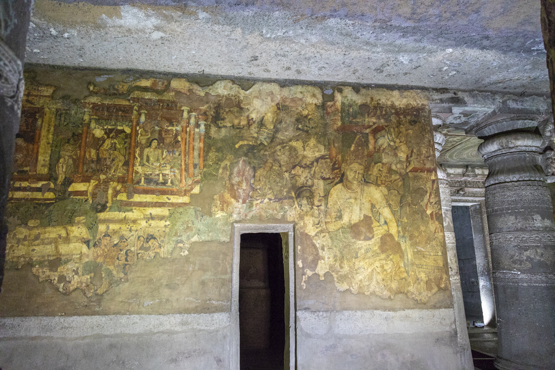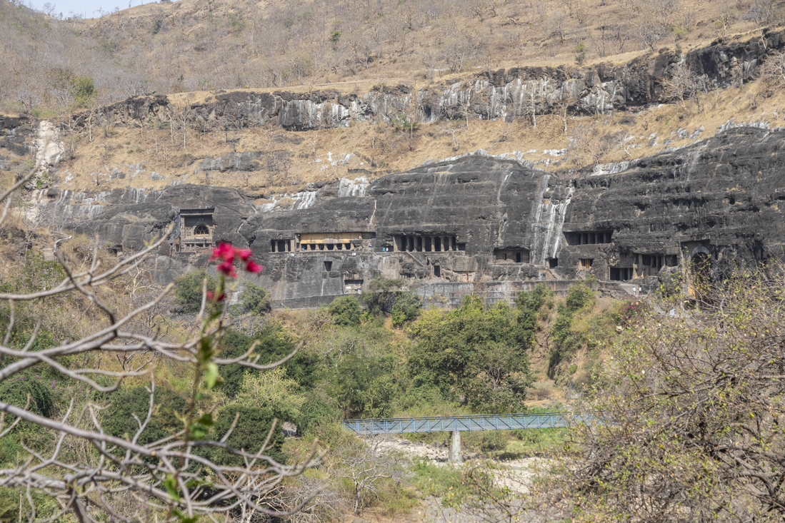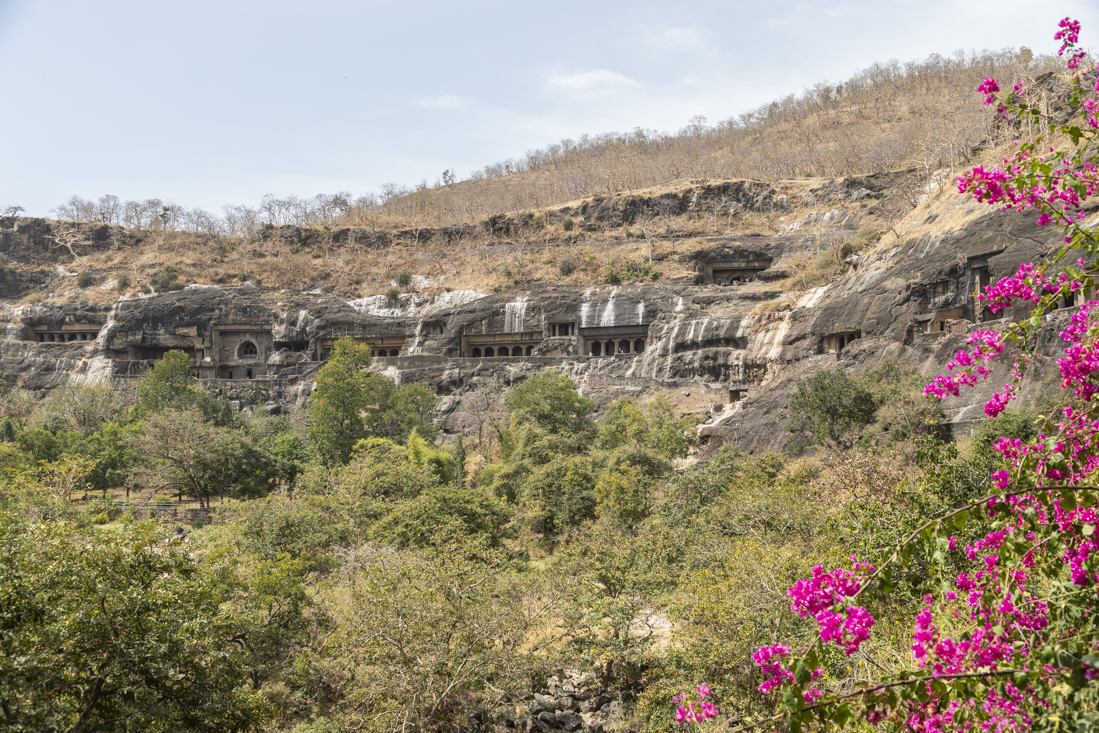 De volgende dag gaan we gewoon naar de Ajanta Caves (Unesco site). Om iets na zevenen staat driver Vicky voor de deur. Het belooft een lange rit te worden. Slechts 125 km., maar zo'n beroerde weg dat je er 3 uur over doet. Nou dat klopte aardig. Aangekomen moesten we de verkopers van allerhande rotzooi van ons afslaan. Zij verkochten niets meer, omdat alle toeristen inmiddels wegbleven. Met een krakkemikkige shuttle bus werden we vervoerd naar de ingang van de caves. De grotten liggen in een hoefijzer vormig ravijn. Het complex omvat 28 boeddistische grottempels gebouwd tussen de 2e eeuw v Chr. tot de 6e eeuw na Chr. en bevat een schat aan oude kunst zien. Een flinke wandeling van een uurtje of 2 en veel foto's later waren we terug bij de ingang. Via dezelfde schuddende weg weer terug naar Aurangabad.