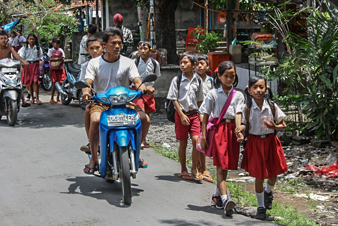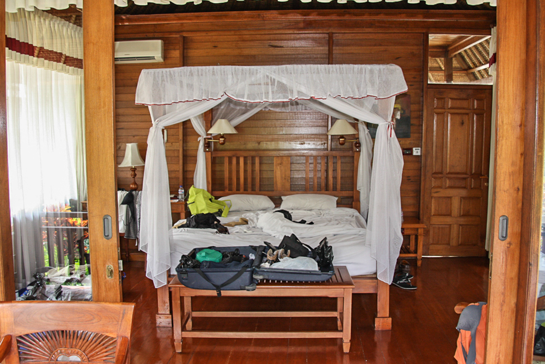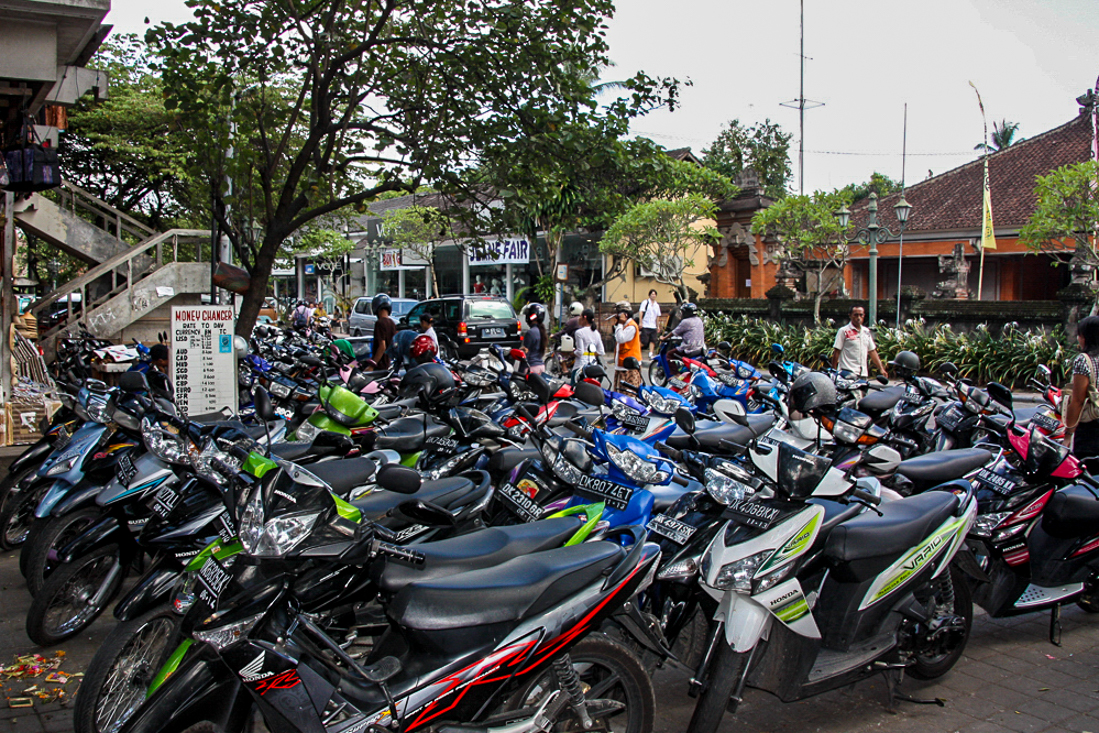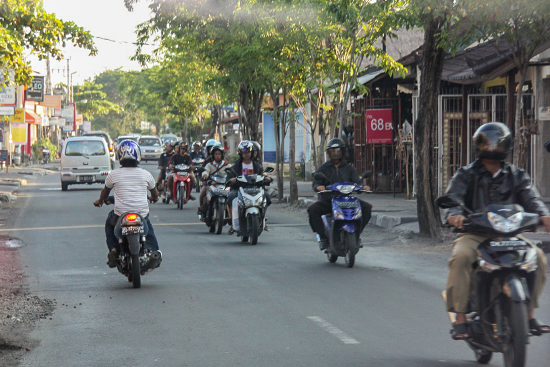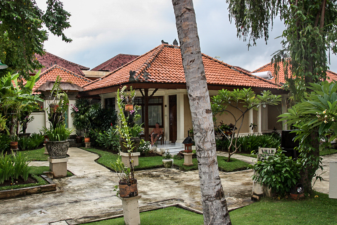 Zondag 7 februari werden we 's-morgens vroeg weggebracht door Wil en André en een paar uurtjes later begonnen we aan onze 15-urige reis via Kuala Lumpur naar Denpassar op Bali. De stewardessen van Malaysian Airlines zagen er niet alleen mooi uit, maar legden de passagiers ook nog eens compleet "in de watten". Na een uur of 13 landden we op Kuala Lumpur, waar we na een sterke bak koffie bij Starbucks op zoek moesten naar onze aansluitende vlucht naar Denpassar. Toen de wielen de grond raakten in Denpassar bleek uit het opspattende water, dat het hier net flink geregend had en dat was dan ook goed te voelen toen we na de lange douane-sessie eindelijk naar buiten stapten. Kan me voorstellen dat het ongeveer zo moet aanvoelen als je met kleding aan de sauna binnenstapt....... Enorm warm en vochtig!! Al snel hadden we het taxihokje gevonden en na betaling van het verschuldigde bedrag werd ons een taxichauffeur aangewezen. We dachten nog heel even dat de kofferdragers bij de service van de taxicentrale hoorde. We waren doodop van de reis en hebben van de rit naar Sanur niet erg veel meegekregen. Wel viel ons de enorme hoeveelheid motorfietsen en/of bromfietsen op. Het leken wel muggen.