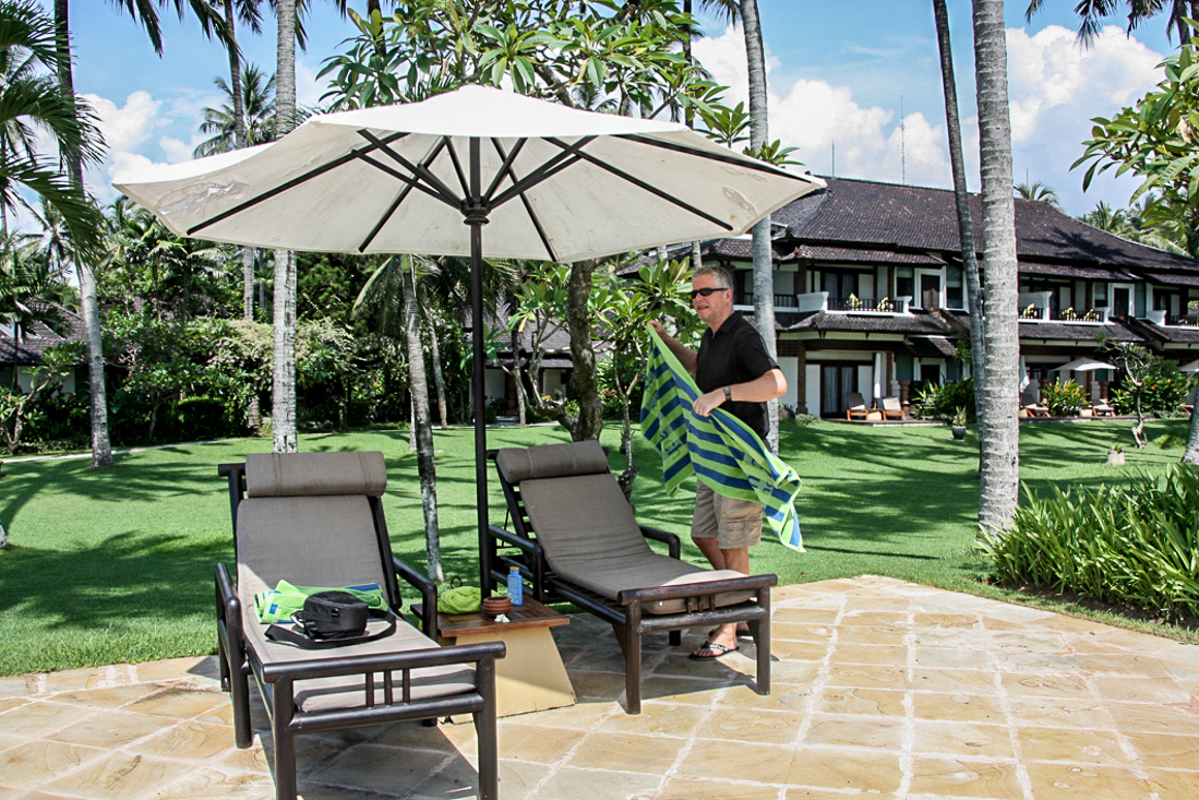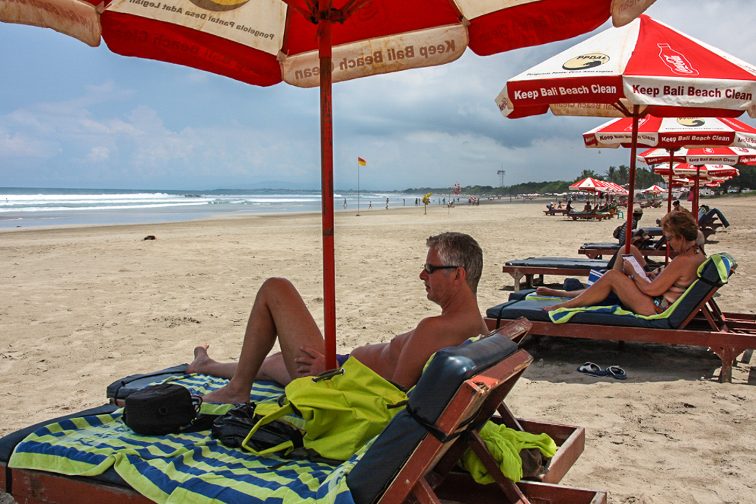 Na aankomst bij Puri Santrian in Sanur werden onze koffers door een medewerker in prachtige Indonesische kleding vervoerd naar onze heerlijk koele kamer. Hier hebben we snel onze lange broeken omgewisseld voor korte exemplaren en Sanur gaan verkennen. Later in het nabijgelegen restaurantje maar een heerlijk satehtje verorberd en ons eerste Bintang biertje geproefd. Ondanks het advies van veel mensen om het plaatselijke ritme zo snel mogelijk op te pakken, zijn we toch maar even een uurtje gaan liggen (uiteindelijk schrokken we 3 uur later wakker). Na een frisse douche maar eens in Sanur op zoek gegaan naar een restaurantje. Uiteindelijk bij Jegeg, schuin tegenover het hotel, aangeland en hier alle keren gegeten (aanrader!!). Dinsdag gekozen om een stranddag te houden.Puri Santrian bleek weer zo'n hotel waar de mensen er plezier in hebben om 's-morgens om 5.00 uur ligbedjes te reserveren. Ziekelijk gewoon!! Gelukkig vonden we nog een paar bedjes aan het zwembad. Woensdag vertrokken we met chauffeur Made vanuit Sanur om een aantal bezienswaardigheden in de omgeving te gaan bekijken, zoals Pura Taman Ayun, schitterende Sawa's, Tabanan, Pura Alas Kedalon en Pura Tanah Lot.