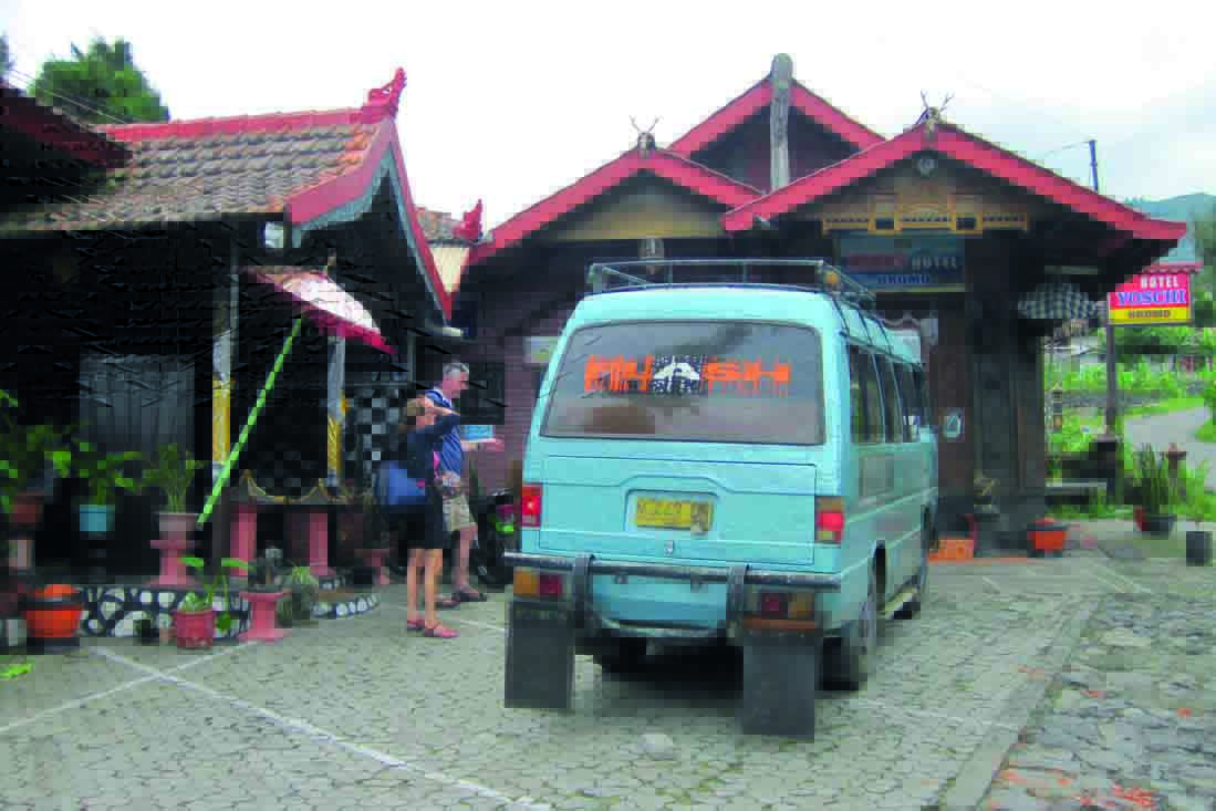 Heel veel bochten later rijden we Sukapura binnen en de bus wordt door enkele lokalen naar een parkeerplaats gedirigeerd. Geruime tijd later wordt ons door een Engelssprekende inboorling duidelijk gemaakt dat we met deze bus niet naar Yoshi Hotel door kunnen rijden en over moeten stappen in kleinere busjes?!? Huh, is dit weer de bekende geldklopperij of echt waar. Omdat we niet nog langer willen wachten betalen we het gewenste bedrag en stappen met alle bagage over in de levensgevaarlijke minibus. Een auto met zoveel gebreken had je in Nederland minstens 10 jaar de celstraf opgeleverd. En wij maar kijken of we het leuk vonden....! Na een nogal spannende rit van een half uur stonden we plotseling op een wel heel erg mooi plekje. Om zeker te zijn dat we het busje morgen terug zouden zien besloten we de betaling dan ook maar tot morgen uit te stellen. De gezichtsuitdrukking van de chauffeur sprak boekdelen.