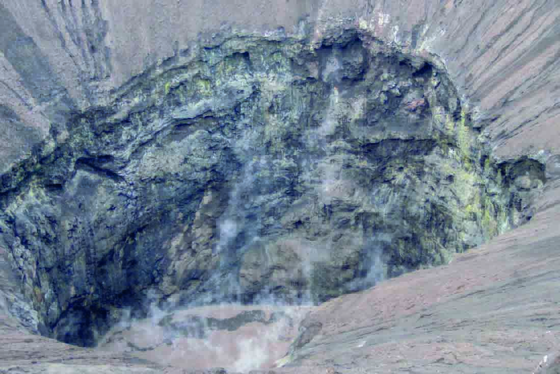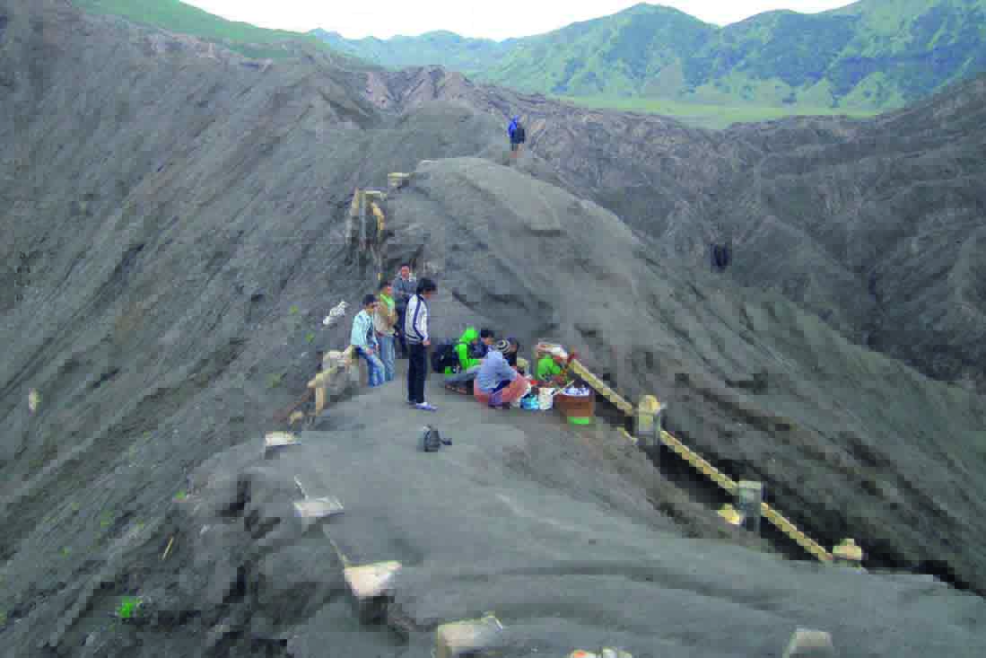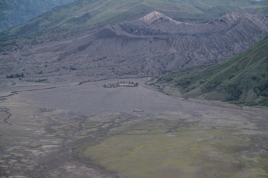 Nu konden we gelukkig wƩl zien waar de jeep reed en dat gaf toch een iets rustiger gevoel. Via de al heel lang met zand bedekte lavastroom reden we naar de parkeerplaats bij de tempel om ons met de hele meute naar het pad van de Bromo-vulkaan te begeven. Ook hier weer paardenverhuur. "Hoss? No Hoss!". Een flinke wandeling later stonden we naar het nogal steile pad Ʃn de trap te kijken. Gelukkig had Agnes de moed (lees: conditie) om naar boven te lopen en verslag uit te brengen.