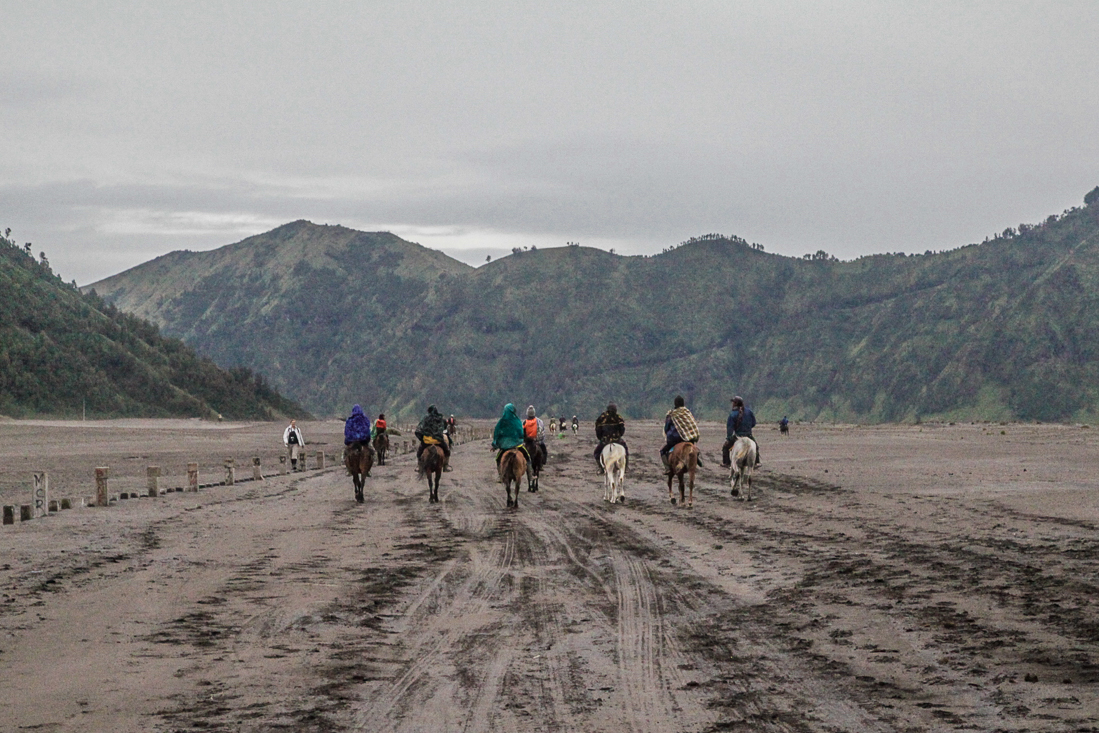 Snel de warme kleding aan en aangesloten bij de andere gasten, die al klaarstonden voor hun vervoer naar de Bromo. Wij moesten nog heel even wachten voordat de- niet al te nieuwe - jeep voor de deur stopte. De verlichting van "onze" jeep functioneerde al net zo goed als de startmotor, dus maakten we de rit bijna in het duister. We vertrouwden er maar op de de chauffeur dit ritje vaker maakte. Een klein half uurtje later stopte de jeep en we begrepen uit de handgebaren en het gemompel dat we op onze eindbestemming waren aangeland.
