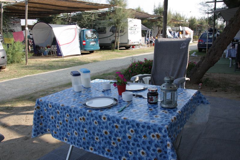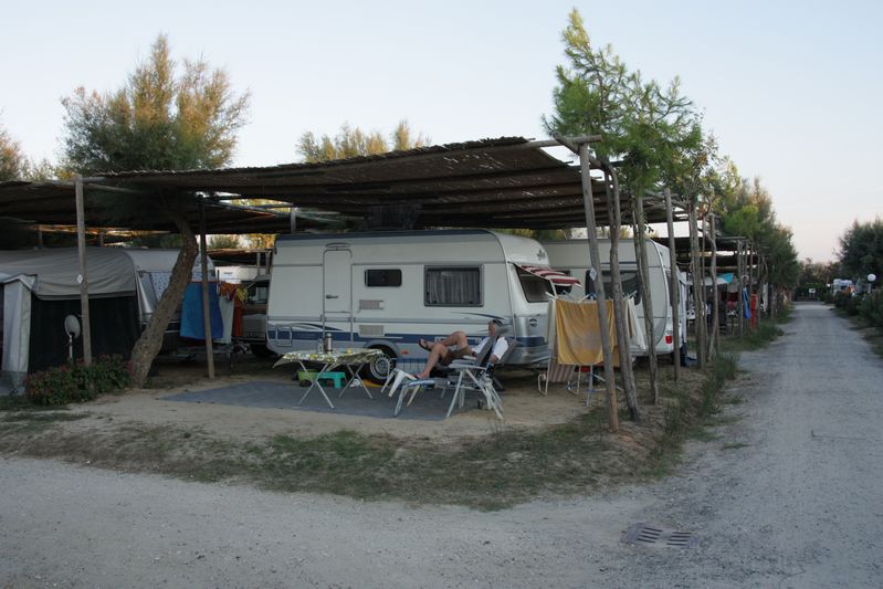 Vrijdag 9 september vertrokken we vroeg vanuit Bardolino. Onze bestemming stond nog niet vast, maar we wilden ergens aan de Ligurische kust of in Toscane uitkomen. Misschien toch maar naar Vada, maar dan niet naar Rada Etrusca, omdat de laatste keer de sanitairgebouwen zo achterstallig waren. Na wat zoeken in de campinggids gekozen voor camping "Tripesce" in Vada. In september zal het wel niet zo druk zijn, maar voor de zekerheid toch maar even gebeld. "Geen probleem, komt u maar". Zie je wel, camping is natuurlijk half leeg! Toen we ons meldden bij de receptie van de camping bleek dit niet echt te kloppen; we hadden de keuze uit maar drie plekken, maar plaats 719 had onze voorkeur. Direct bij het strand en dichtbij sanitairgebouw. En wat was het lekker warm hier, wel ruim 31°. Donderdag 15 september kwamen Gitte en Eberhard als verrassing ook aan in Vada. Zij vonden een tijdelijke plek achter ons en konden twee dagen later de plaats direct naast ons krijgen en hun luifel en buitenkeuken opbouwen.