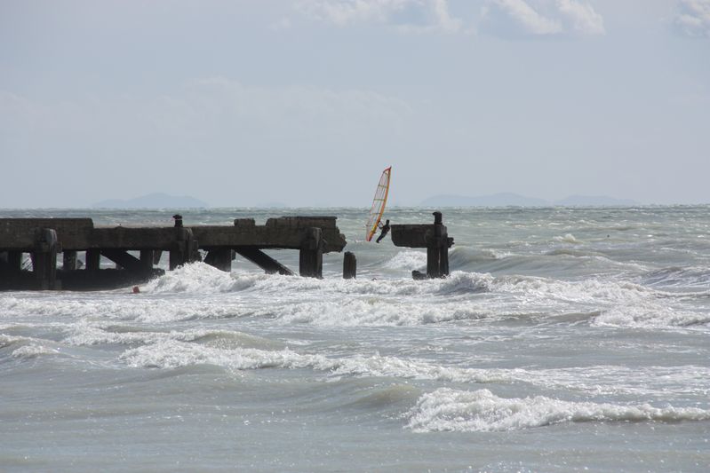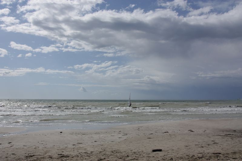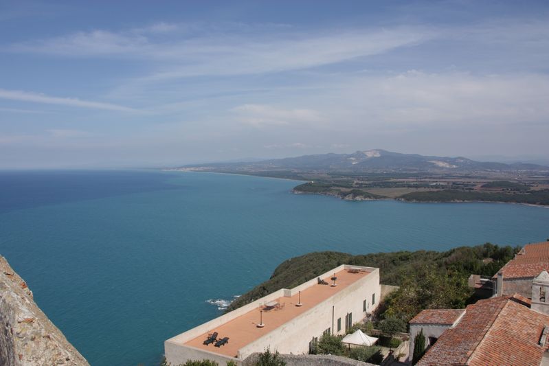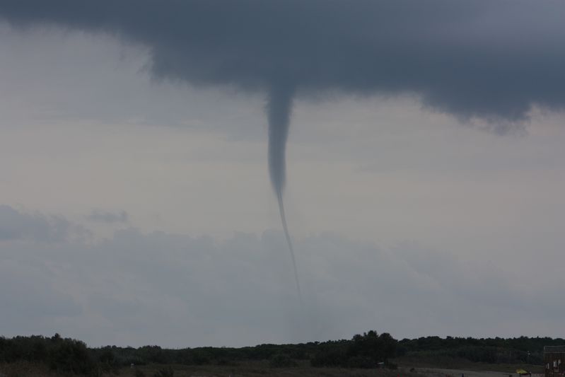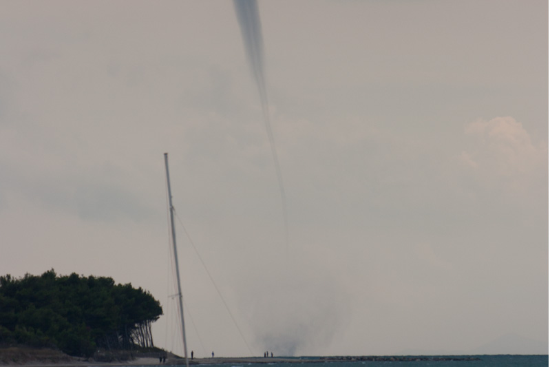 De zondag erna was het eindelijk weer voor onze Zwitserse overbuurman om zijn kite-surfer op zee te gebruiken. Gitte en Agnes besloten maar eens een flinke strandwandeling te maken. Om een uur of drie belde Agnes vanuit Cecina om te vertellen dat we direct aan het strand moesten gaan kijken naar een aantal "watertornado's" boven zee. Wat een bijzonder schouwspel deze vijf tornado's. Op foto 12 zie je de kracht van deze enorme stofzuiger aan het meegenomen water. De door Eberhard gemaakte spaghetti smaakte hierna nog beter. Ook moest er nog wat bekeken worden in de omgeving. Allereerst de prachtige baai van Barratti, maar natuurlijk ook het stadje Populonia, waar in de Etruskische tijd ijzererts van Elba werd verwerkt. Als laatste werd Campiglia Marittima aangedaan.