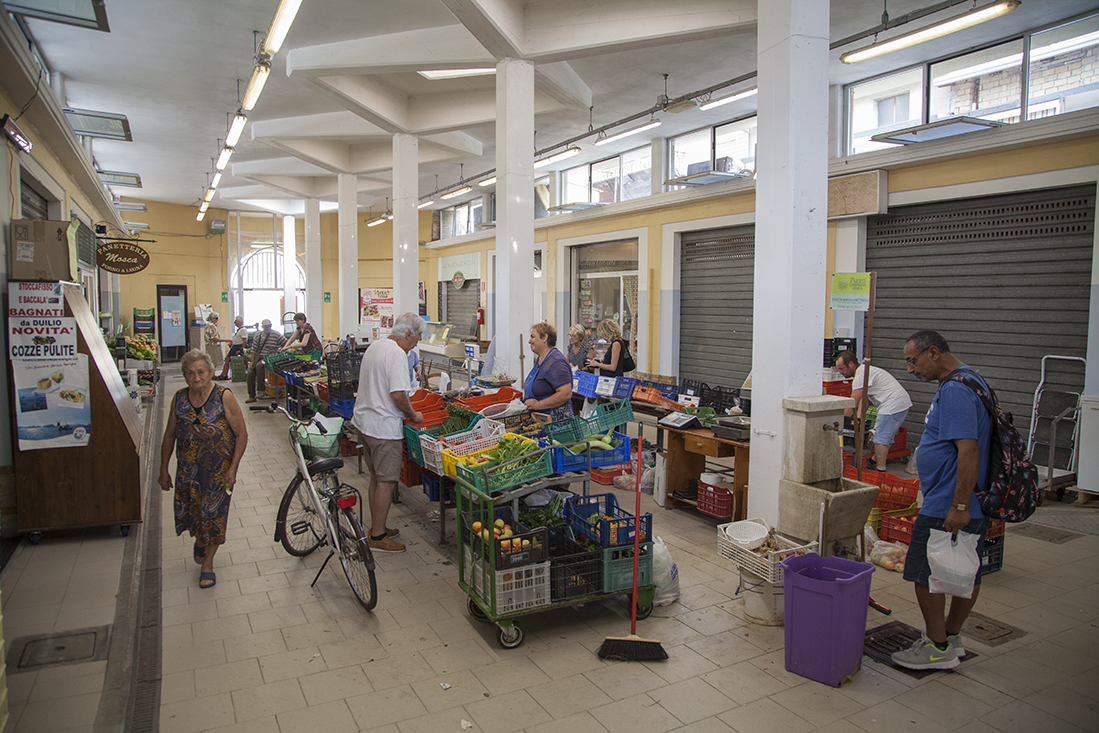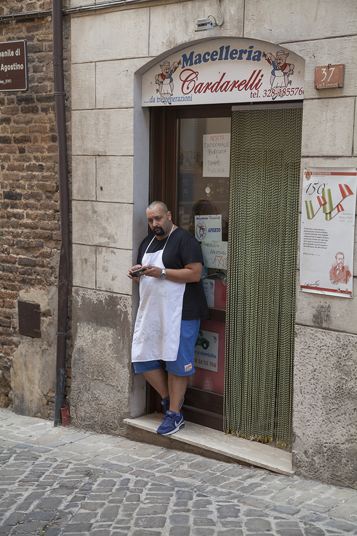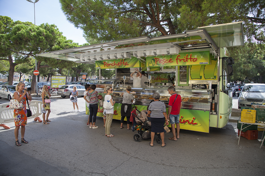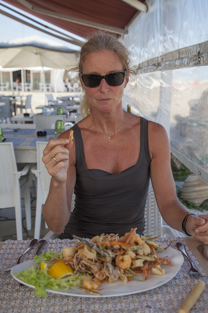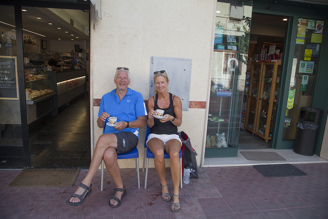 Het zal duidelijk zijn dat we eerst maar eens volop hebben genoten van het mooie uitzicht en niet zoveel hebben uitgespookt, behalve lezen, zwemmen en snurken. Al viel dat 's-nachts niet mee door de voorbijrazende treinen. Donderdag zijn we maar eens naar Porto San Giorgio gereden voor een ronde over de markt (wat een smoes om een portie Porchetta te scoren) en een verrassingsbezoek aan Mario en Maria. Een verrassing werd het zeker, maar dan net zo zeer voor ons. Maria wist niet wat ze zag, maar vertelde tot onze grote schrik dat Mario op 29 augustus j.l. was overleden. Daar werden we wel even stil van. We spraken af om volgende week maandag opnieuw langs te komen en gezamenlijk naar de begraafplaats te gaan. Een beetje ontdaan reden we terug naar de camping.