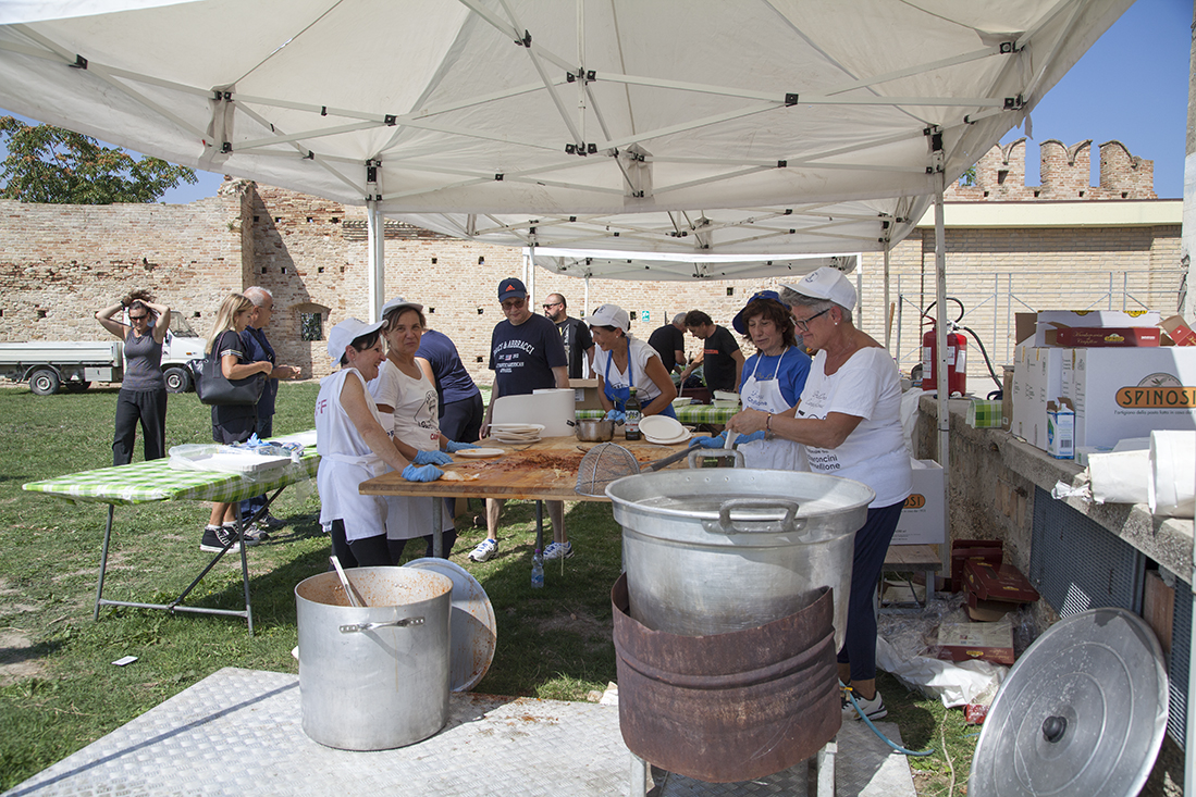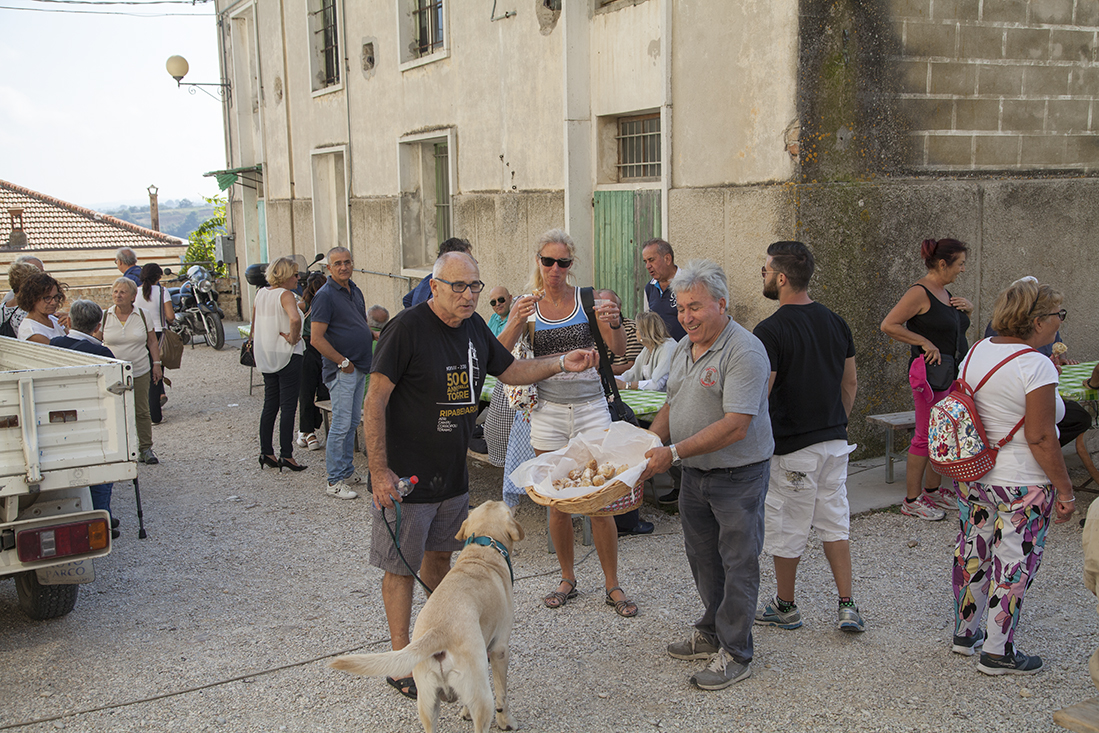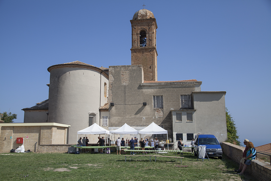 Zaterdagavond maar eens naar Campofilone gereden om wat te eten. Dat lukte uitstekend bij Restaurant Il Borgo. In de hoofdstraat van het historische centrum stonden borden met een medeling over een afsluiting op zondag. Wellicht een processie? Dus wij de volgende dat met camera's opnieuw de bult op. In het centrum werden we door een bewoner naar de achterzijde van de kerk gedirigeerd. Daar was het e.e.a. te doen. Aan lange tafels zaten over het hele terrein verspreid mensen te eten. Tijdens het filmen en fotograferen werd er al naar ons gezwaaid door een groep die een schaduwrijk plekje had uitgezocht en iets later werd er gewenkt om hun kant op te komen. Waar we vandaan kwamen? Engeland, Duitsland. Nee, Hollanda! Een gejuich ging op en we moesten aan de wijn. Dan maar even zitten. En ja hoor, twee tellen later zaten we beiden aan een enorm bord spaghetti en nog iets later een enorme portie mosselen. Maar we moesten ook eens een halve liter witte èn rode wijn meenemen. Na de ingenomen hoeveelheid wijn besloten we om maar af te zien van ons geplande autoritje in de omgeving. Nadat we ook nog eens eens een aantal oliebol-achtige dolces op moesten eten werd het tijd om afscheid te nemen. De man van de organisatie met z'n hond Roed (naar Ruud Gullit genoemd) nam hartelijk afscheid en zoende niet alleen Agnes, maar ook mij!! Daar moesten we maar geen gewoonte van maken....