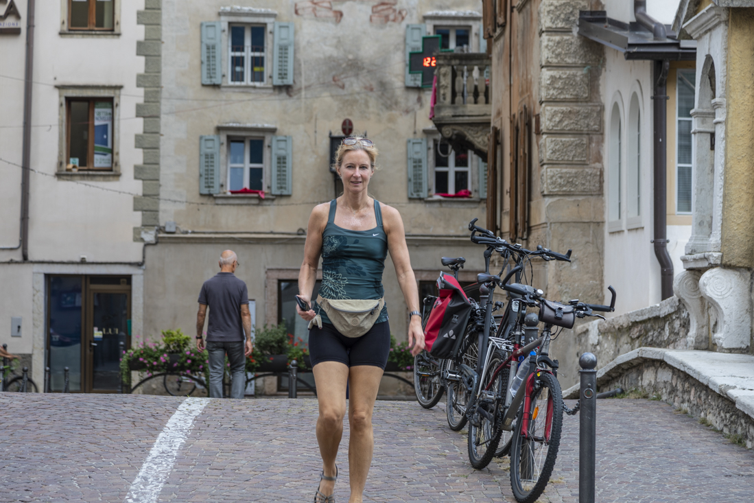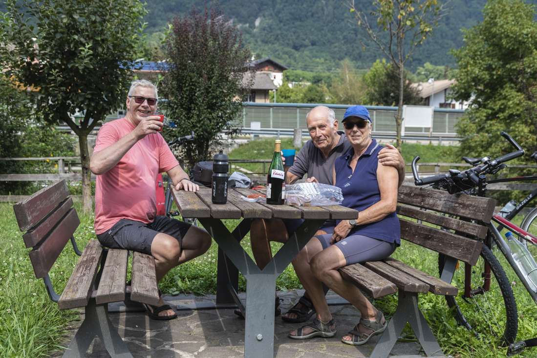 De volgende dag de fietsen van de caravan gehaald voor een gezamenlijke fietstocht richting Borgo Valsugana. Met een heerlijk zonnetje fietsten we Caldonazzo uit, om 15 kilometer later verrast te worden door een stevige plensbui. In Borgo hebben op het terras gewacht tot de donkere wolken vertrokken. Maar we waren nog geen 5 kilometer buiten Borgo en het begint toch te regenen. Kwartiertje geschuild onder viaduct en maar weer verder. En ja hoor, Eberhard lekke band. Band gewisseld, maar deze bleef leeglopen. Dus elke kilometer pompen! Werd dus een leuke terugtocht. Na aankomst op de camping snel ik de auto gesprongen voor nóg een verrassingsbezoek. Dick en z'n neef Mark overnachtten tijdens hun motortocht in een hotel in Tenna. WÔt kan iemand leuk reageren als je onverwacht op z'n kamerdeur klopt..... Natuurlijk met z'n viertjes even een biertje op het hotelterras gedronken. Daarna de berg weer af, want bij G&E was het grillavond.