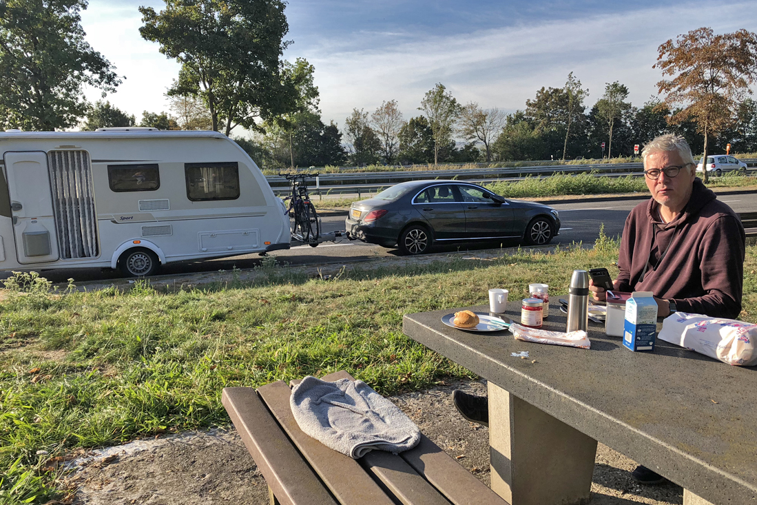 Zondag een flinke pot koffie gezet, de caravan aangehaakt en de bestelde broodjes bij de ingang opgepikt. Een klein uurtje later een zonnige picknickbank op een RastƤtte uitgezocht om heerlijk te ontbijten. Begin van de middag stond de caravan weer op het pad. Uitruimen, schoonmaken en poetsen!