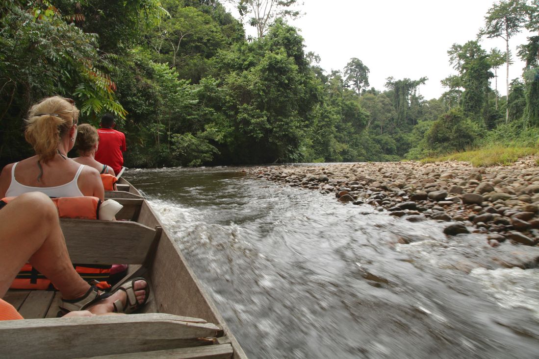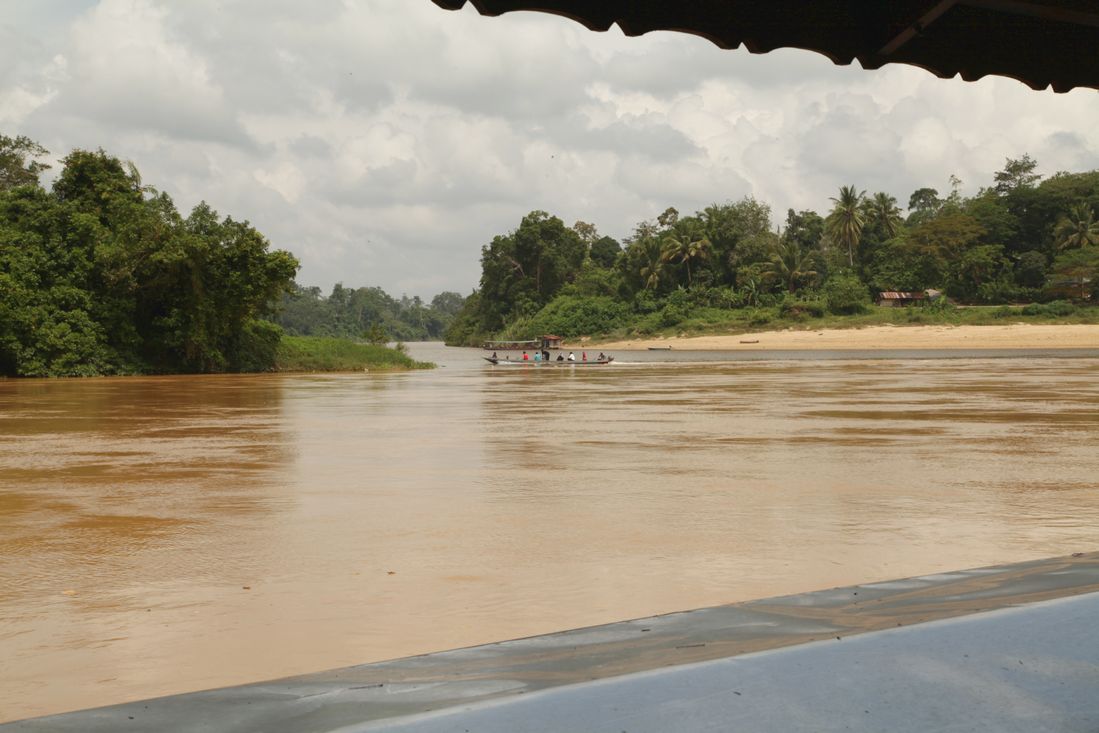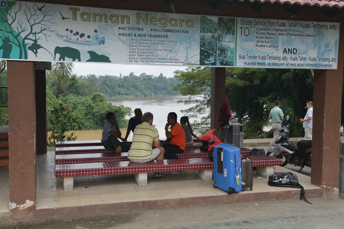 Bijtijds moesten we ontbijten vandaag, want om 8.30 uur moesten we al klaar staan voor onze transfer naar Taman Negara. Na wat rondrennen met onze koffers bleek het Istana Hotel te beschikken over nog een entree, gelegen aan de zijstraat en een verdieping lager. Tja, dat moet je maar weten. Beneden aangekomen stond ons busje al te wachten. De chauffeur had gezellig z'n vrouw meegenomen..... Na wat gekringel door Kuala Lumpur reden we al vlot de snelweg op, om deze na een flink aantal kilometers weer te verlaten en via een lange weg naar boven uiteindelijk uit te komen in Kuala Tembeling. Op een parkeerplaats met restaurantje, kantoor en wachtplek werden we met koffers en al gedropt.